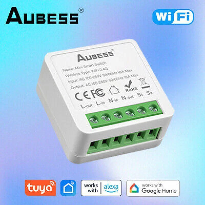 AUBESS WiFi Switch Tuya Smart Home Gadgets Automation MINI DIY 2-Gang 2-Way Switch Relay Module Alexa Alice Google Assistant Description: 1. Refit non-smart appliances or equipment into smart devices. Such as refitting a desk lamp into a smart desk lamp, and mobile phone can control the switch of the light. To turn the downlight into a smart downlight, you only need to connect a smart switch module to the switch, and then Alexa/Google assistant can control the light switch. 2. Mobile APP control. Control the device's power on and off, timing, countdown and other functions through the mobile phone. As long as the mobile phone has a network, the switch module at home can be controlled globally. 3. Voice control. Support voice assistants such as Tmall Genie, Alexa, Google Home, and realize functions such as switches; "Alexa, turn on the kitchen lights." You can turn on the lights in one sentence and enjoy a convenient smart life. 4. Timing. You can control the switch, timing, countdown and other functions of the device through your mobile phone. This can be ordered: turn off the lights in the living room after 2 hours. 18:15 Turn off the oven. Turn on the boiler at 21:00. You can also time the device when you are not at home. (APP: Smart Life/TUYA Smart) 5. Group control. The lights can be grouped to achieve unified control (simultaneous switching, timing, etc.); 6. The Internet of Everything. Through settings, it can be linked with other smart scenes to make life smarter; for example, set the home scene: automatically turn on the living room lights, TV, and air conditioner. 7. Sharing and security. The main account can be shared with other family members, and the functions and settings are completely retained and copied; security: once the main account adds a light, the light will be and other users can no longer find and add; it needs to be actively shared before others can use it it. 8. Bluetooth fast matching. Turn on Bluetooth, the phone will quickly find the device, speed up the connection, and stabilize the connection. 9.State memory. Resume the power after the power failure, without worrying about the change of the equipment state, and maintain the state before the power failure. It was in the open state before the power was cut off, and the open state is automatically restored when the power is turned on again. (Can be set to open, close, power off memory mode) 10. Three wiring methods.(2-way/1-way/non switch) Can be directly connected to the device without connecting a switch. It can also be connected behind the switch to support single control switch and dual control switch. It can be directly installed in the switch box to the switch module. It can also be installed on the dual-control switch without affecting the use of the dual-control switch. 11.WiFi connection, no gateway required. DIY, the connection method is simple, everyone can DIY the device and turn the non-smart device into a smart device. Specifications: Color:white Output:AC 100-240V 50/60Hz Input:AC 100-240V 50/60Hz Wi-Fi:IEEE 802.11b/g/n Material:PCV-0 Certified product:CE ROHS Maximum current:16A Package Included: 1*mini smart switch module,1*Manual