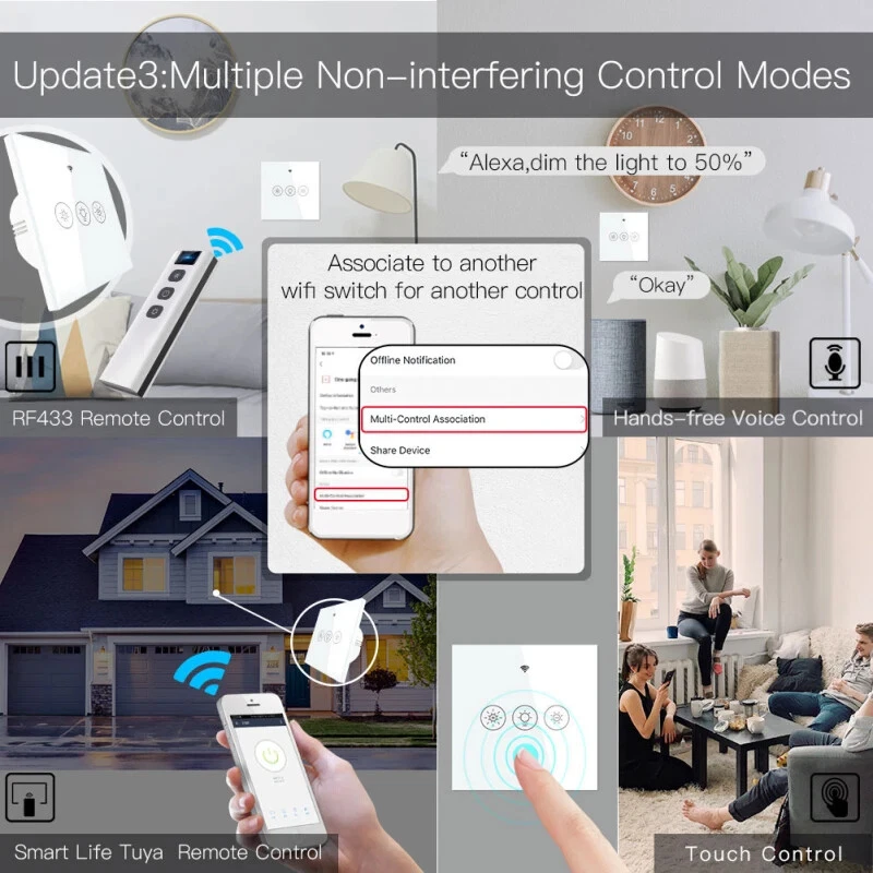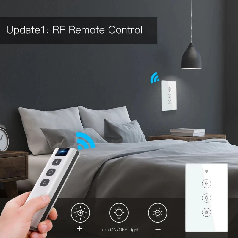 AUBESS Tuya Wifi Smart Wall Touch Sensor Switch LED Light Dimmer Switch Smart Life APP Remote Control Support Alexa Google Home Description: 100% Brand New and High Quality! The remote control does not contain batteries, you need to buy LR23A 12V batteries by yourself 2020 New Arrival Upgraded with More Personalized Points: Update1:Multi-control in a much easier way Update2:New pairing mode with WiFi Bluetooth Update3:Backlight ON/OFF optional Update4:Relay status adjustable when power off Update5:RF frequency built-in for RF remote control Main Features: 1.2/3-way multi-control association to control 1 light with multiple dimmer switches; anti-scratch tempered glass panel suits any home decor and allows for effortless touch control; you can multi-control associate this switch to multiple different switches in Smart Life App. 2.Non-interference control mode; allows the switch to be controlled via Smart Life, touch control, voice, and remote with RF433 frequency and 1527 encoding remote switch(not included); each control method works independently; achieve multi-control by associating to other smart switches 3.Compatible with Alexa and Google Home for hands-free voice control with 0%-100% dimmable; can also be controlled via Smart Life/Tuya app anytime, anywhere; setting relay status and remembers last relay status optional when powered off , backlight switch On/Off. 4.Take full control of connected appliances with timers, schedules and countdown (1/5/30 mins, 1 hour, etc.) with the app; share control with family and friends for added convenience 5.Neutral wire is required in your switch boxes to operate correctly; only supports 2.4 GHz network; offers easier pairing via WiFi and Bluetooth connectivity. Specifications: Model : WS-EU-D: WS-US-D Working voltage: 100-250V AC, 50Hz/60Hz Max. total current:1A(EU)/2A(US) Max. Load Power: EU:220W(220V) US:440W(220V)/220W(110V) Wireless type: WIFI2.4G RF433MHz Working temperature:-10℃-45℃ Support system: Android/ios Package Included: 1*smart switch 1*Instruction Notes: The remote control does not contain batteries, you need to buy LR23A 12V batteries by yourself!