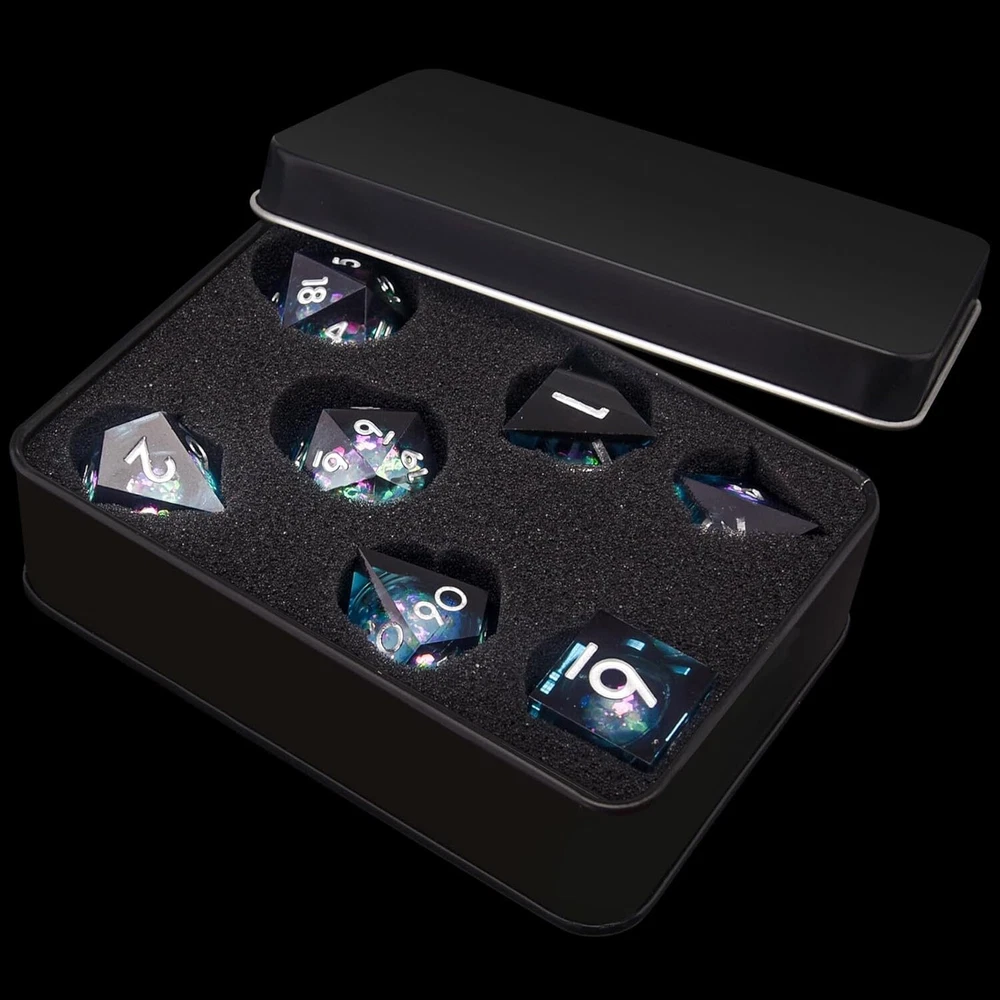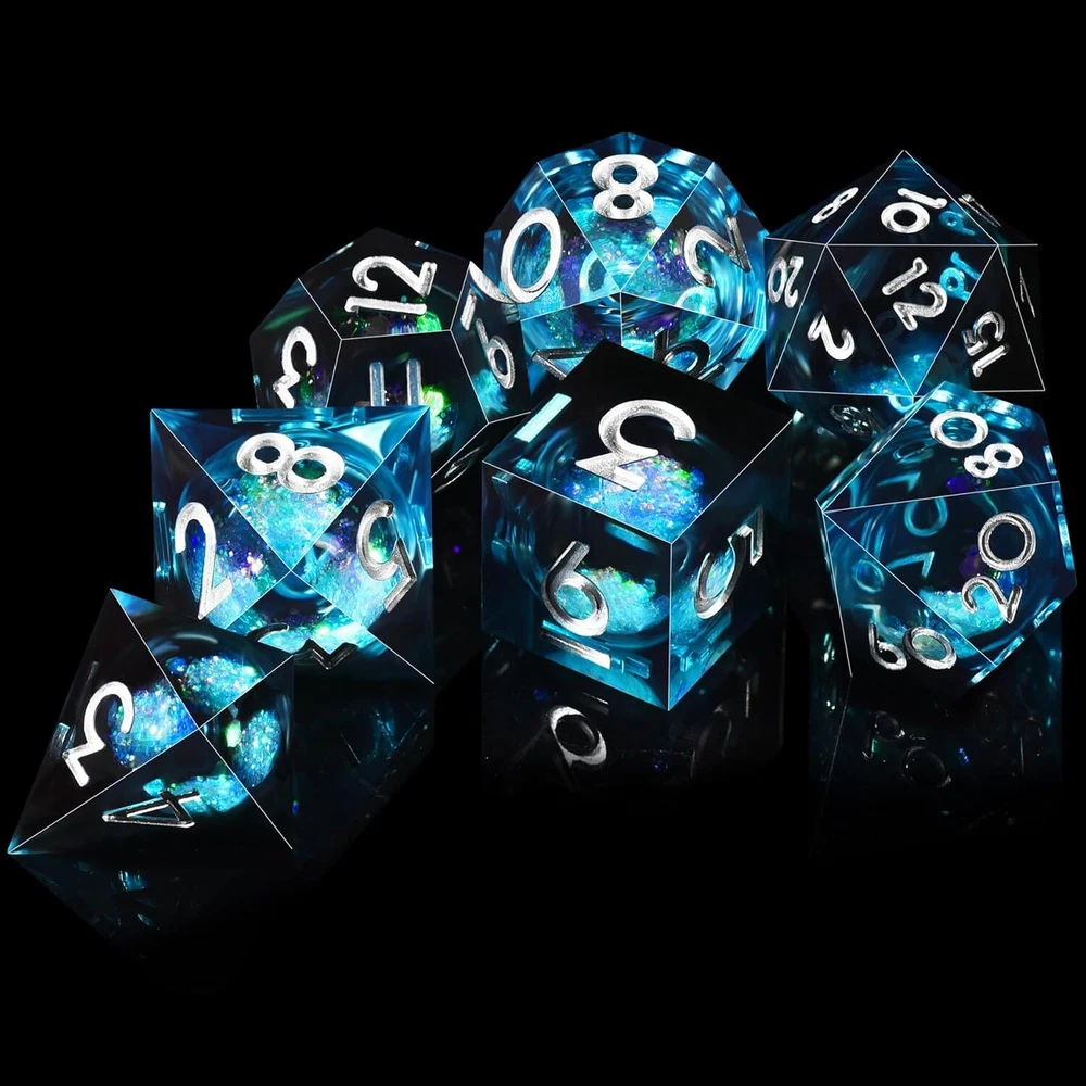 AUSTOR Liquid Core Resin DND Dice Sharp Edge Polyhedral Blue & Black Product Details Package Dimensions: 4.41 x 3.03 x 1.34 inches Item Weight: 3.2 ounces Manufacturer recommended age: 12 years and up Manufacturer: AUSTOR 7-Die DND Dice Set - This is a full set of 7 pcs liquid core resin dnd dice, including D4*1, D6*1, D8*1, D10(0-9)*1, D12*1, D20*1 and D%(00-90)*1, come with a PU foam lined storage box to display and store your polyhedral dice Liquid Core Technology - The resin dnd dice contain liquid core quicksand ball, you can see the effect of quicksand floating when the resin dice rolling, and different angles will display different visual effect Sharp Edge Dice - Each liquid resin dice is meticulously handmade mirror finished and polished, form the sharp corners and delicate edges dnd dice, which luxurious like a gem and eye-catching High Quality Material - AUSTOR liquid core dnd dice set are hand-cast with natural resin, environmentally friendly, non-toxic, sturdy and wear-resistant, with moderate weight and good rolling feel Great Game Dice - The sharp edge liquid core resin dnd dice set are perfect for Dungeons and Dragons, MTG, Shadowrun, Pathfinder, Yahtzee, math games, and other table games etc.