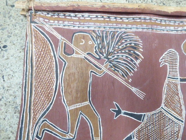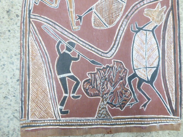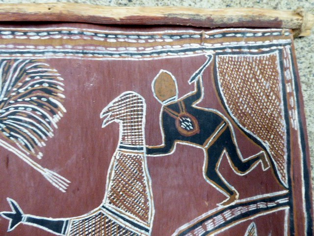 AUSTRALIAN ABORIGINAL OCHRE PAINTING ON BARK HUNTING KANGAROO EMU BOOMERANG SPEAR ORIGINAL ART WORK - IN GOOD CONDITION - MISSING TIMBER STAY AT THE BOTTOM 60 CM HIGH 47 CM WIDE SEE PHOTOS FOR BEST GUIDE TO CONDITION I AM LISTING SOME OTHER ESTATE PIECES I can combine for postage. CHECK MY OTHER LISTINGS FOR MORE