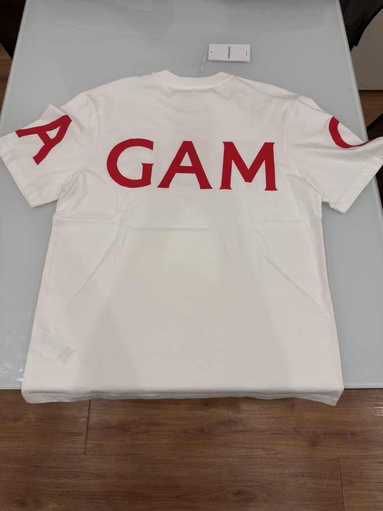 The product is a brand new Ferragamo T-shirt in size Large. It is a regular fit T-shirt designed specifically for men, featuring the iconic Ferragamo branding. This stylish and high-quality T-shirt is sure to make a statement and is a great addition to any man's wardrobe. Size: Large New with tags Has RFID in tag from store