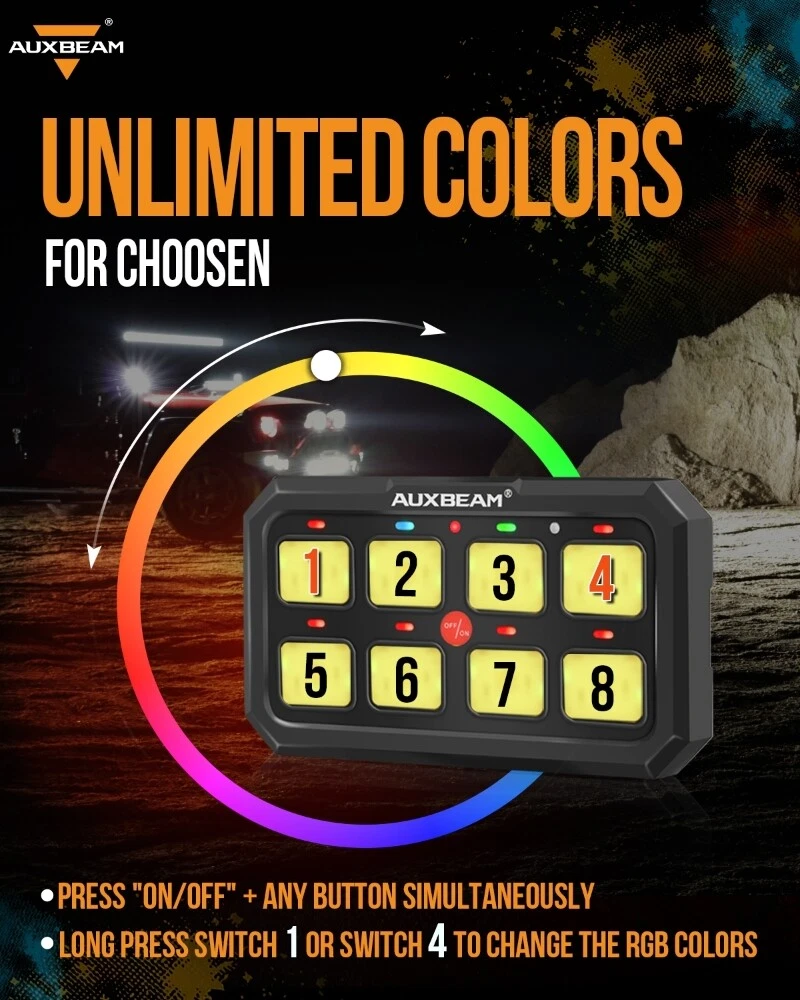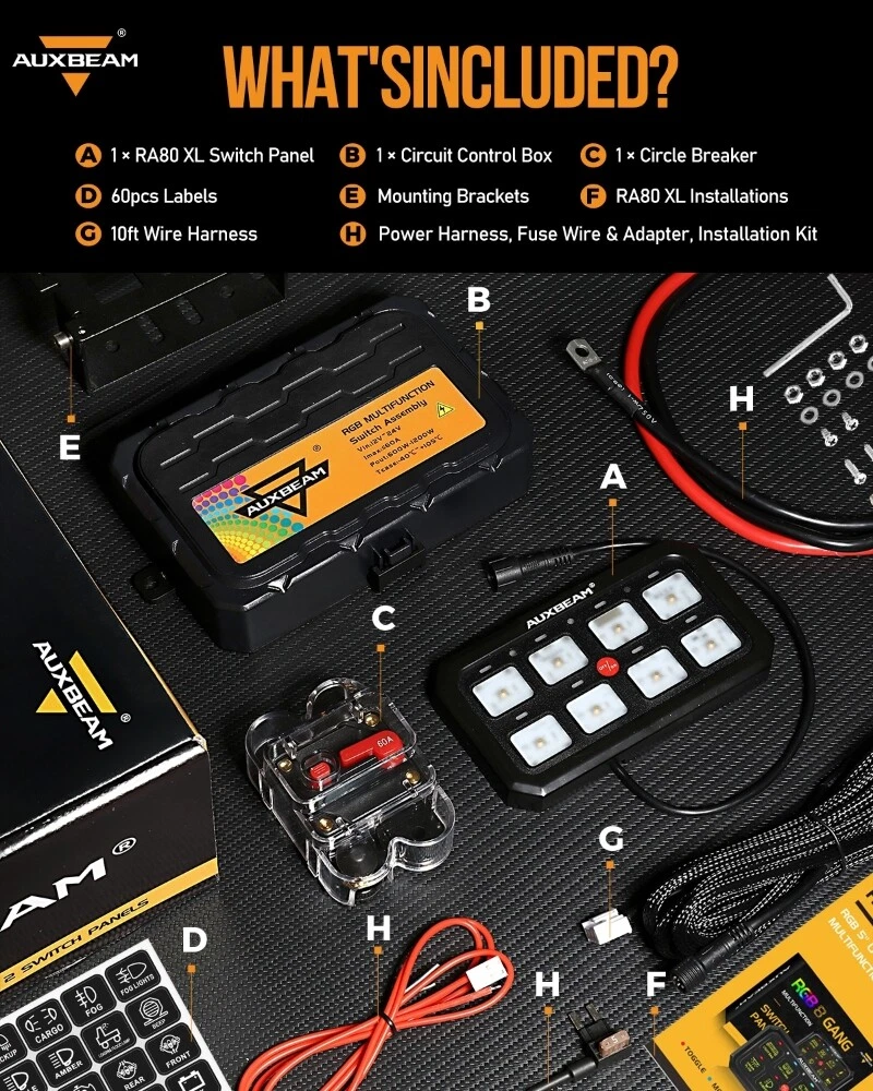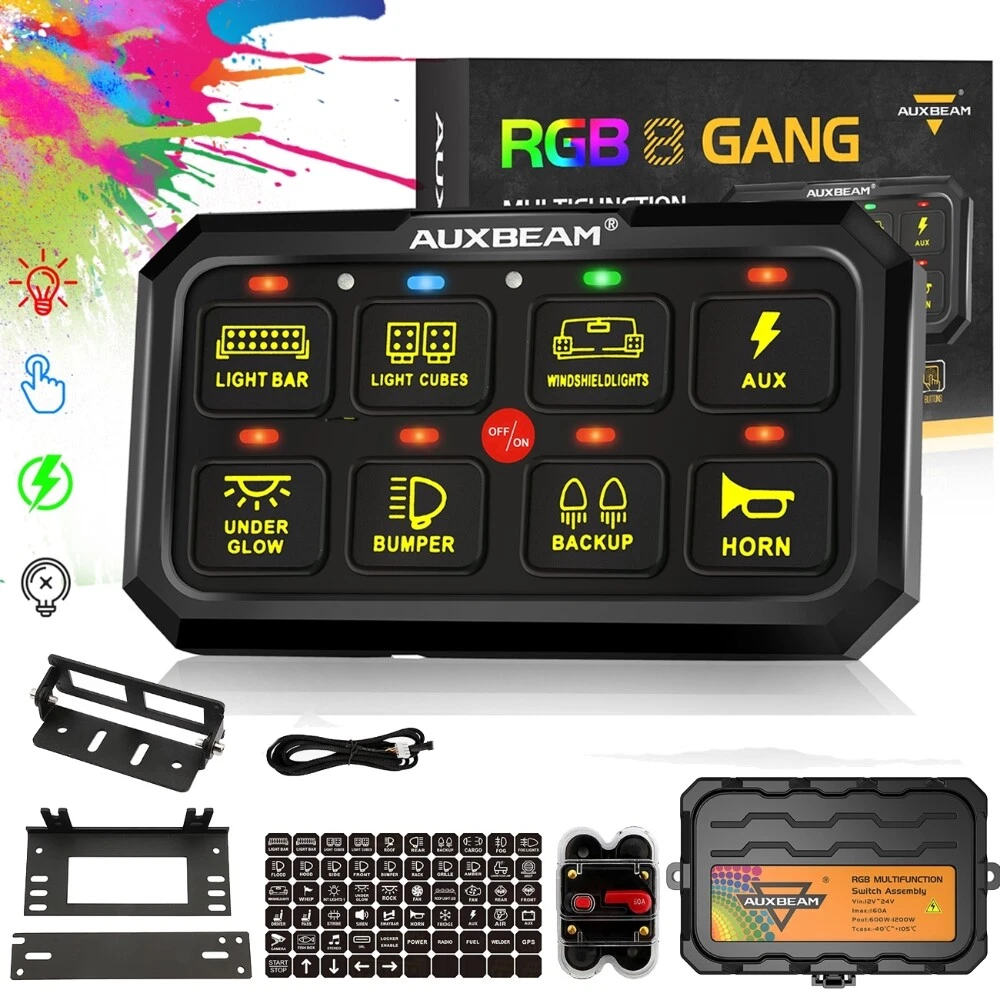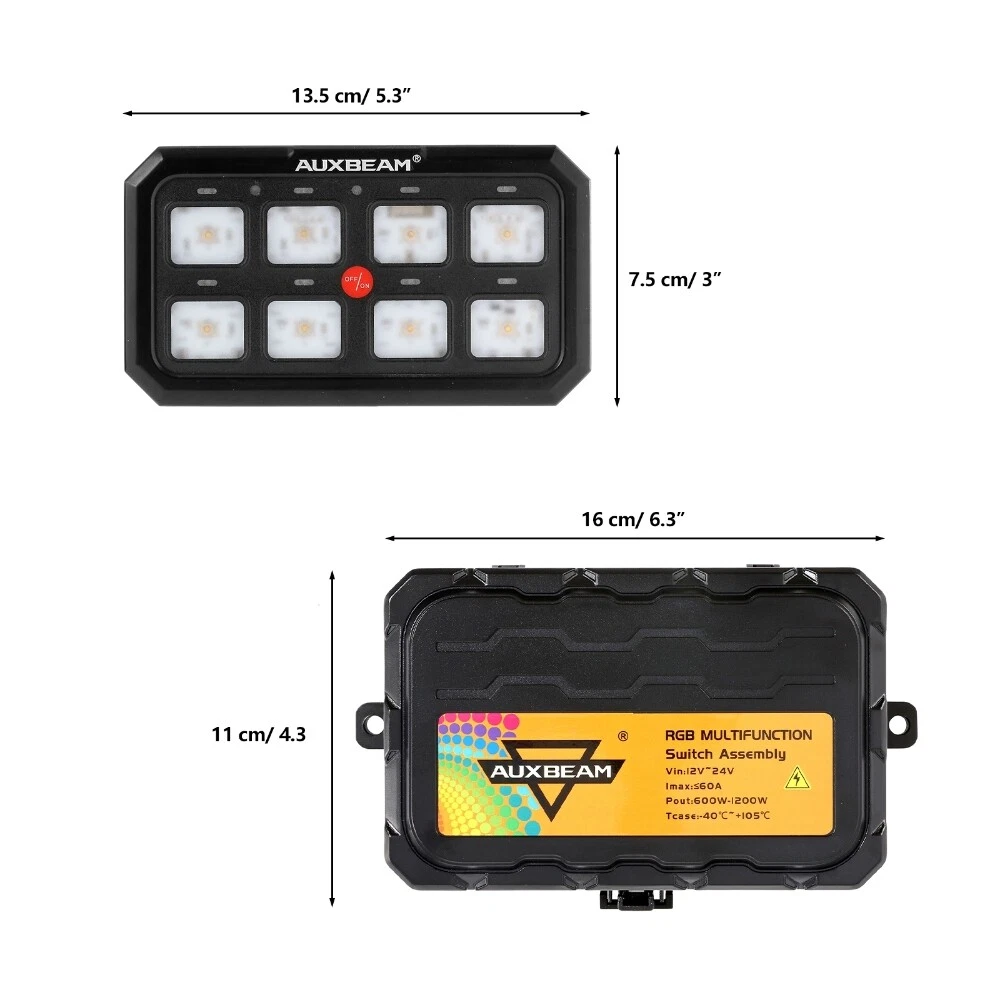 smafay Welcome Description SPECIFICATIONS: Working Voltage: DC 12-24V Max Current: 60A Rated Voltage: 12V 20A / 24V 10A Operating @ 12 Volts: Max Power Rating Of 720W Operating @ 24 Volts: Max Power Rating Of 1200W Operating Temperature: -40°C - +105°C Waterproof Rate: IP65 FEATURES: ★ AUXBEAM RA80 XL RGB SWITCH PANEL. The market desired new style, larger and more comfortable switch panel: 5 Inch large switch panel, 1 Inch comfort large button. Working voltage: DC 12-24V, max current: 60A; operating at 12 Volts: max power rating of 720W, operating at 24 Volts: max power rating of 1200W; operating temperature: -40°C - +105°C, IP65 waterproof rate. ★ AUXBEAM MULTIFUNCTION SWITCH PANEL. 3 Lighting modes: TOGGLE / Constant Light; MOMENTARY / Ignition Power; PULSED / Strobe Mode. Not just "ON/OFF" switch panel for car, it can change the light color and lighting modes, control your device without extra switches or cables. Upgraded 60 button stickers for all your needs. ★ AUXBEAM RGB MULTICOLOR SWITCH PANEL. Unlimited color options matching your dash light, the latest LED switch panel can be operated via switch panel pad. Auto-sensing dimmable function, keep the most comfortable visual brightness while driving. ★ AUXBEAM 8 WAY ACCESSORY SWITCH PANEL. Allows you to control up to 8 different led lights or electrical devices. It can be installed in any 12-24V DC vehicles such as SUVs, ATVs, UTVs, RZRs, SxS, 4 Wheelers, Trucks, RVs, Campers, Trailers, Boats, Marines etc. ★ WHAT'S INCLUDED? 1 × RA80 XL Switch Panel, 1 × Circuit Control Box, 1 × Circle Breaker, 60pcs Labels, Mounting Brackets, RA80 XL Installations, 10ft Wire Harness, Power Harness, Fuse Wire & Adapter, Installation Kit, 2 Years Warranty RA80 XL SERIES: - Larger and more comfortable switch panel - Achieve 1-second blind operation when driving - Market desired new style - Sealed and waterproof - Auto-sensing dimmable function - Built-in solid state relay, no need external relay - Satisfied with different needs - Your vehicle's lighting butler - Widely application - Can be used for various vehicle types Product Display Payment & Shipping We accept Ebay Payment. Payment should be completed within 7 days of auction closing, or Unpaid Dispute will be filed . If you can not pay in time, please contact us. All items will be shipped out within 48 hours after your payment is verified. Return & Replacement 1. Our items come with a Three-month or One-year warranty. We shall pay much attention to your order and will do our best to solve any problems in a professional business manner. 2. If you are dissatisfied with our items, please contact us for return address within 30 days upon receipt of the delivery. The item must be returned with the original package for refund or exchange. Before you return, please check twice to confirm the item not work and contact our customer service representative, let us know the detailed problem or send us some pictures for confirmation. Feedback 1. Dear buyers, we appreciate your business, if you are satisfied with our service, please leave us a positive feedback and 5 scores DSR . Your recognition will make us more confident to develop business and serve you better. 2. Our goal is to make sure you are a happy buyer and pleasant shopping with us. If you have any questions, please contact us for a resolution firstly . Our working time is (GMT+8) Monday to Friday, 9:00-18:00. We will respond your email as soon as we can . 3. We understand the concerns and frustrations you might have, and will do our best to resolve the issues. Please give us the opportunity to resolve any problem. Thank you for visiting my store!