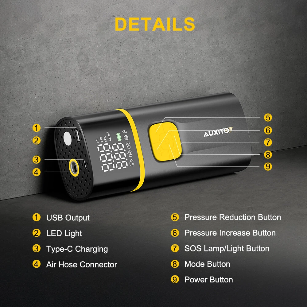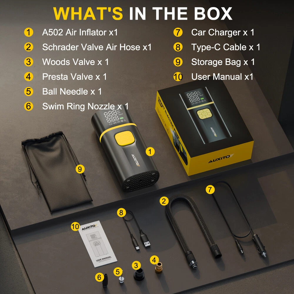 Specifications: Model: A502 Brand: AUXITO Voltage: 11.1 Volts Recommended Uses For Product: Tire Inflation Power Source: Battery Powered/DC Powered Noise Level: ≤85 dB Features: [Lasting Power Tire Inflation] With a built-in 7,800mAh rechargeable battery to supply power and no need to connect to an external power source during use, the AUXITO A502 inflation speed is three times faster than other ordinary cordless inflation on the market, with a 35% increase in power. Providing 150 PSI maximum pressure and 40 L / min airflow, it inflates car tires (205/55 R16) in less than five minutes and e-bikes from 10 to 20 PSI in 30 seconds. [PD 30W Super Fast Charging] AUXITO Tire Inflator Portable Air Compressor -Cordless Air Pump for Car Tires Specifications: Model: A502 Brand: AUXITO Voltage: 11.1 Volts Recommended Uses For Product: Tire Inflation Power Source: Battery Powered/DC Powered Noise Level: ≤85 dB Features: [Lasting Power Tire Inflation] With a built-in 7,800mAh rechargeable battery to supply power and no need to connect to an external power source during use, the AUXITO A502 inflation speed is three times faster than other ordinary cordless inflation on the market, with a 35% increase in power. Providing 150 PSI maximum pressure and 40 L / min airflow, it inflates car tires (205/55 R16) in less than five minutes and e-bikes from 10 to 20 PSI in 30 seconds. [PD 30W Super Fast Charging] With a PD 30W quick recharge design, A502 battery-powered tire inflation can reach full charge in just 1 hour to avoid long waiting. [4+1 Inflation Modes] The tire inflator has PSI, KPA, BAR and KG/CM² (initial unit is PSI) 4 pressure units. There are 4 preset inflation modes: Bicycle, Motorcycle, Car and Ball. The 5th customized mode also allows you to set the pressure value (from 3 to 150 PSI) according to the inflation object to meet various inflation needs in different scenarios. [Convenient&Safety] The air compressor with advanced noise reduction technology runs smoothly and quietly. The unique design of the air pump pipeline makes the external temperature of the fuselage not exceed 45?? (113?H). It will immediately stop work to prevent overheating and protect the safety of each user if the internal temperature exceeds 70????49?H. The upgraded and portable hose with heat resistance is easier to connect. [Portable&Multiple Emergency Tool] The portable air compressor is also a versatile emergency tool. There is an LED light on the top with Always-on mode/Strobe mode/SOS mode that can be used to inflate in the dark, change tires, or warn other vehicles at night. It also includes a 5V/2A USB output port as an emergency power source for electronic devices. [LCD Screen Display] This tire inflation portable air compressor features an advanced LCD screen that displays more detailed values in real-time, making it easy to monitor tire pressure status. NOTE: If you need an external cigarette lighter to use this product, the designed DC port can also be used to start the external cigarette lighter. Packaging Include: Tire Inflator Portable Air Compressor*1 Item Specifics Power Source Battery Powered/DC Powered Type Air Compressor Color Black Manufacturer Part Number CQB-A502-AUXITO-BY Accessories Digital Tyre Pressure Gauge Brand AUXITO Portable or Stationary Portable Fit For Car Bicycle Motorcycle Truck Sports Ball Pool Toy Mattress Voltage 12V Model A502 Packaging Include Tire Inflator Portable Air Compressor*1 Warranty 3 Year Recommended Uses For Product Tire Inflation Noise Level ??85 dB Custom Bundle No Modified Item No Country/Region of Manufacture Unknown Payment 1. Instant PayPal payment is the preferred method of payment. We also accept payment via PayPal, DebitCard, Visa, MasterCard, Discover. 2. Before payment,Please keep the consistency of Paypal address and ebay address. 3. Quantity orders are welcome! Shipping 1. All items will be shipped in 24 hours after receiving your payment . 2. We ship this item to US only via USPS first class mail. It usually takes 3-6 working days to deliver. Returns 1. We offer free return & money back guarantee. If you are not satisfied with your purchase for any reasons, you can return the item for refund or replacement/exchange. All returns must include the original packaging. (Please refer to our return policy for details.) 2. If you don't return goods within 60 days from date of purchase, your right to cancel will be revoked. Any items damaged because of incorrect installation will not be refunded. Please contact us for return or troubleshooting help prior to returning any products. Contact Us 1. Negative feedback will not help resolve any problems you have, please contact us via eBay messages before leaving negative feedback, our customer service will make best effort to help you with the issues. 2. We maintain high standards of excellenceand strive for 100% customer satisfaction! Feedback is very important to us. We request that you contact us immediately Before you give us neutral or negative feedback, so that we can satisfactorily address your concerns. FAQ 1. Can you tell me when my order will be shipped? Actually we will ship the item within 1 business day after receiving orders. But USPS need to take longer time to update tracking info and arrange delivery during the challenging time for now. If your order was not shipped more than 3 business days, please contact us with your order number to get quick support. 2. My item has not arrived, what's taking so long? Sometimes items take longer than expected, especially if it's going far or to rural area. Check with your post office to see if your item has been held up. Sometimes USPS will not update a tracking number until it has arrived at its destination. If your item still has not arrived after a few days, let us know so we can double check for you and help solve it asap. 3. Do you ship to Canada, United Kingdom, Australia, etc.? Unfortunately, we could only ship to United States (Domestic shipment) at the mo