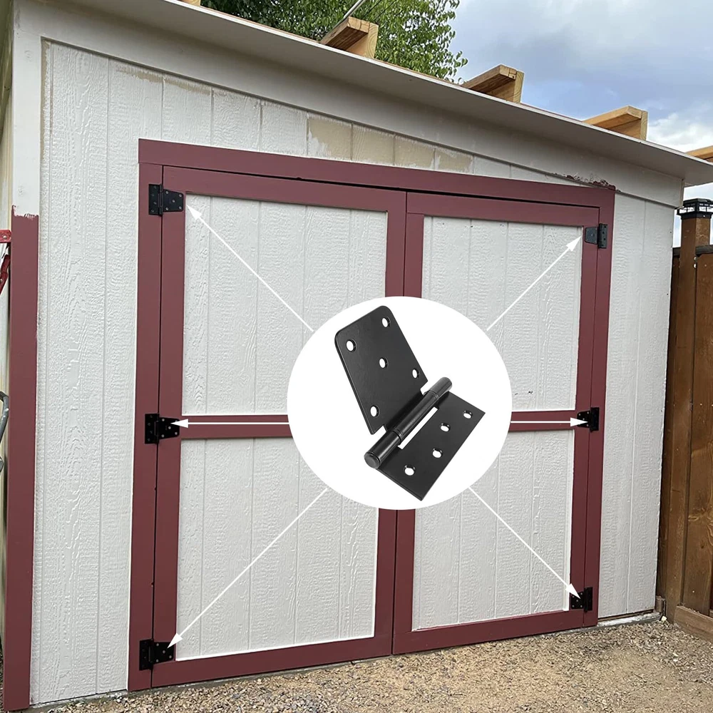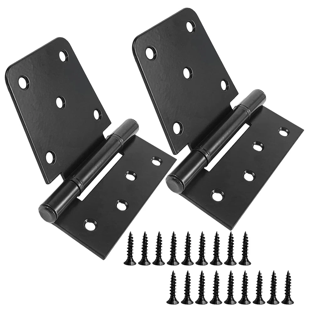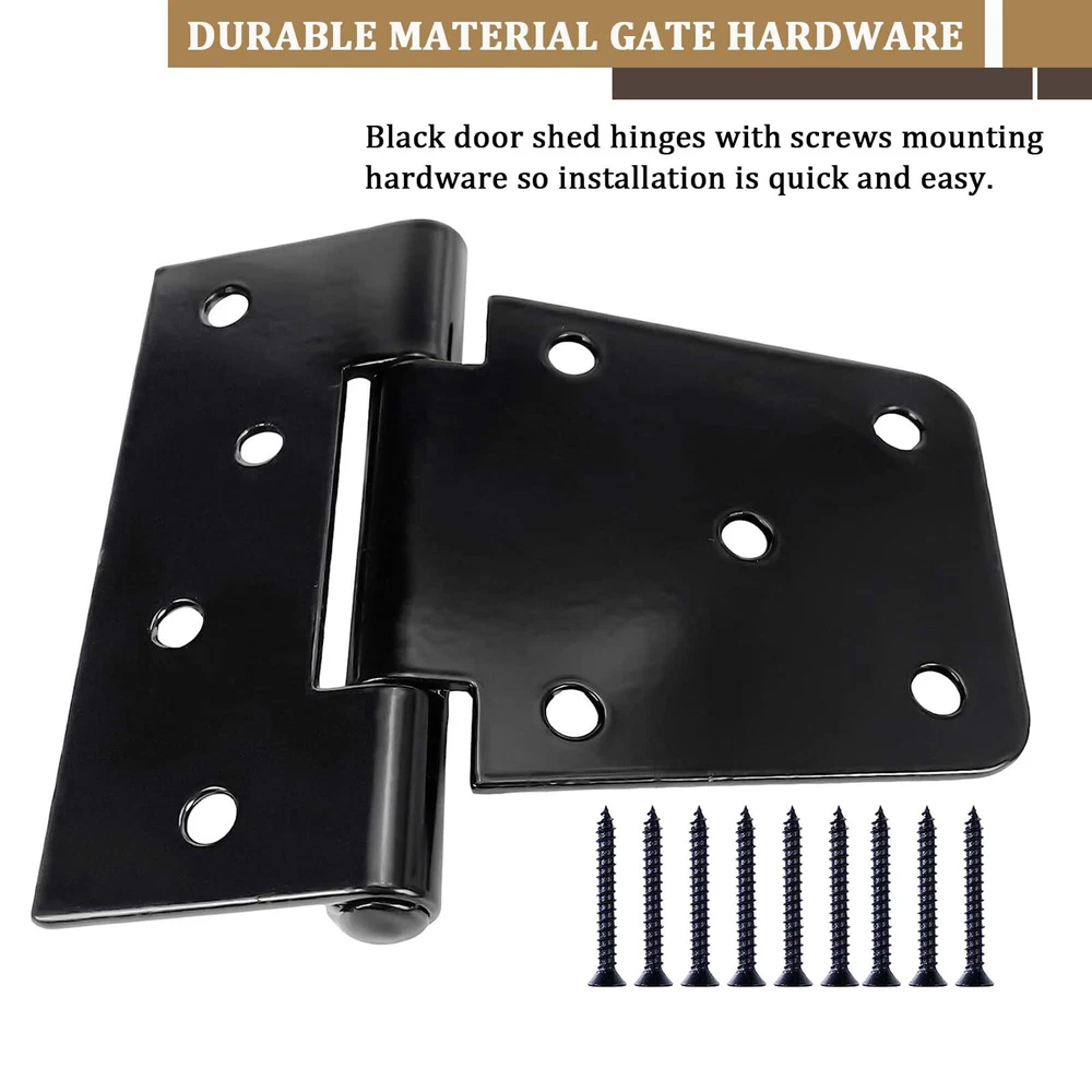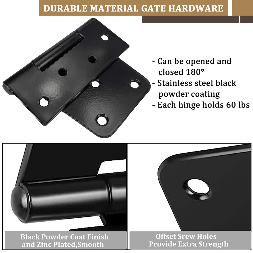 AYAYGD 3.5 Inch Heavy Duty Gate Hinges, 2 Pack Black Iron Door Hinges for Wood Sheds, Barns, Fences, and Swing Doors, Rustproof and Easy Installation with Screws Included GATE HINGE OF FEATURES - Black coated finish, Anti-corrosion and rustproof , durable and long last design. - The hinge's damping oil feature ensures quiet and creak-free opening and closing. - Easy to install: door hinges black matte includes mounting screw attachment and can be rotated 270 degrees. - Suitable for most doors and windows, such as gates, barn doors and shed doors, wooden fences, storage boxes, etc. BARN DOOR HINGES OF SPECIFICATIONS Type: swinging door hinge Size: 3.5 inches Material: Steel Finish: Black Coating RUSTPROOF GATE HINGES OF PACKAGE 2 x Wood Fence Gate Hinges 18 x M4 self-tapping screws PREMIUM MATERIALS: Made of 0.1" thickness solid steel, these 3.5 Inch Gate Hinges offer maximum capacity of 60 lbs, preventing gate doors from sagging. DIMENSION OF GATE HINGES :3.5 inches x 3.2 inches for swing part and 1.8 inches x 4.5 inches for fix part, with a thickness of 0.1 inches, suitable for various gate types. RUST-RESISTANT: With a matte black coating finish, these Black Iron Door Hinges are designed to withstand outdoor conditions, ensuring long-lasting use. Easy Installation: The Wood Fence Gate Hinges come with all necessary screws and offset screw holes for simple and strong installation, preventing wood from splitting. VERSATILE USE: Wrought Iron Gate Hinges suitable for both indoor and outdoor applications, including barns, fences, farm gates, playhouses, sheds, deck boxes, and cabinets.
