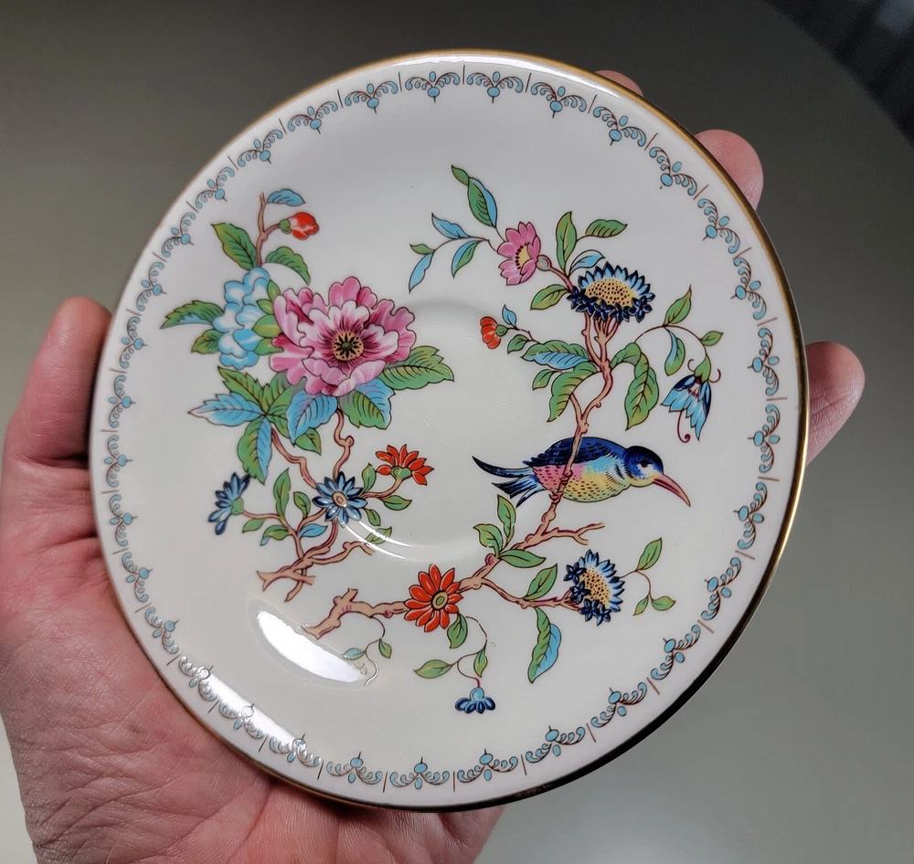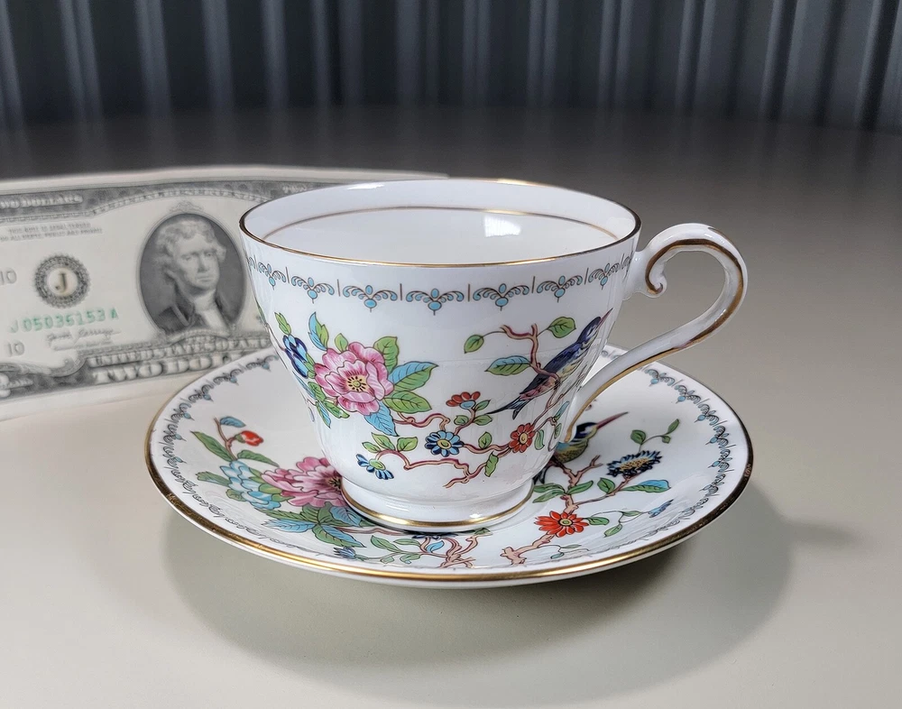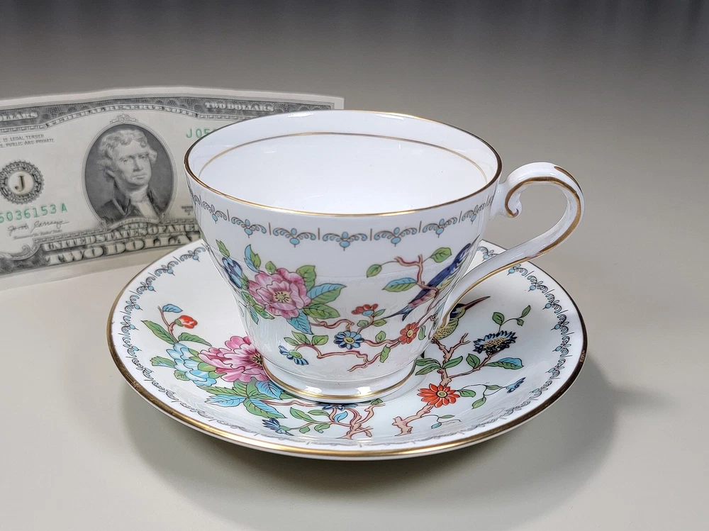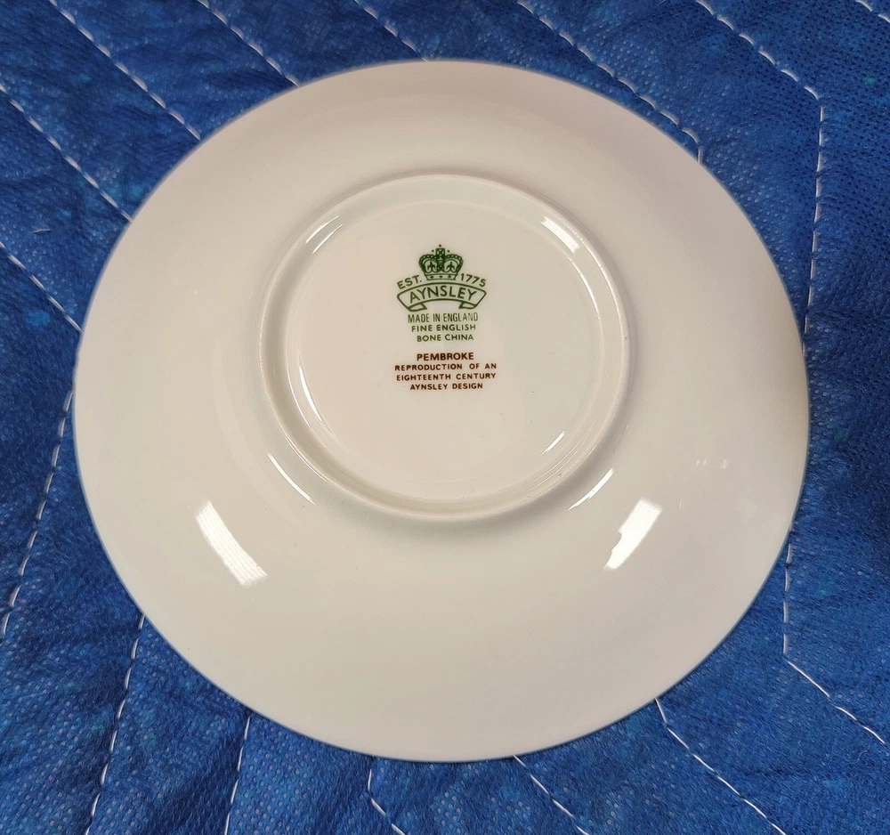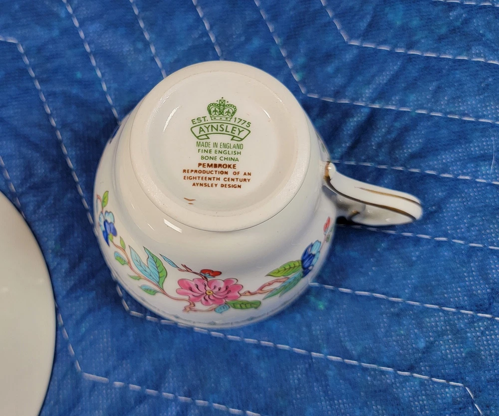 AYNSLEY Pembroke (Gold Trim) Cup & Saucer DIMENSIONS: Saucer: 5 1/2" diam. Cup: 2 1/2" tall x 4 1/4" x 3 1/4". Total weight: 10 ounces. DESCRIPTION: 1 vintage cup and saucer. By AYNSLEY. Pattern: Pembroke. Bone china. Multicolored birds and flowers on white with gold rim accent. Back stamp: green crown mark "Aynsley - Est. 1775 - Made in England - Fine English Bone China"; "Pembroke - Reproduction of an Eighteenth Century Aynsley design". 1985-2015. CONDITION: Excellent gently used condition. No damage and no significant wear. No restoration. Condition is consistent with seldom gentle use and careful handling. Most of these pieces appear unused or barely used. No nicks, fleabites, chips, cracks. No significant scratches or rubs. No crazing. No residues, scale, stains or discolorations. No wear to the floral decoration. Clean, bright, shiny. On very close inspection in glancing light you may detect some very light, typical use-related surface wear which may include: scattered small utensil scratches to the glaze; scattered minute wear to the gold rim accent. Nothing at all significant or conspicuous.