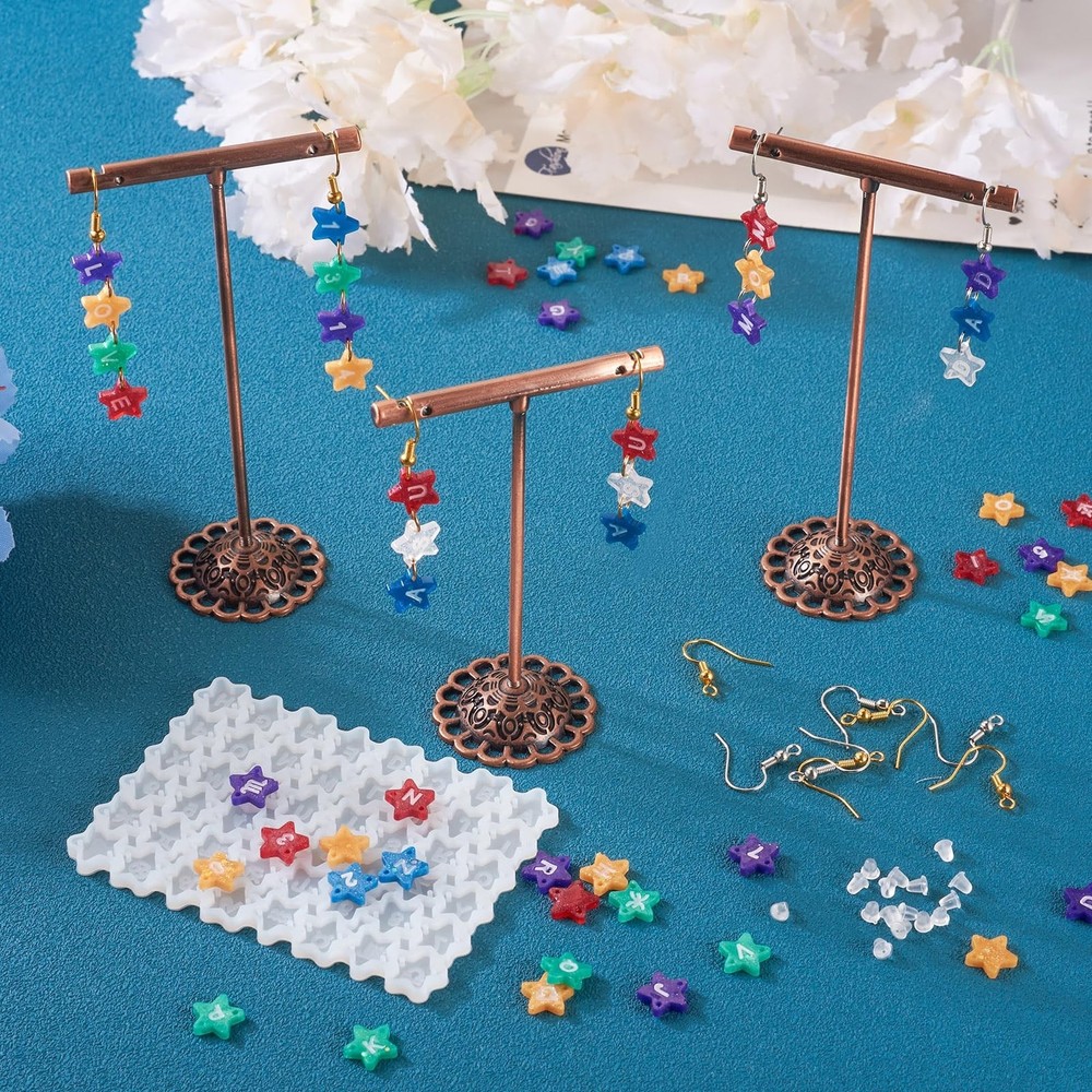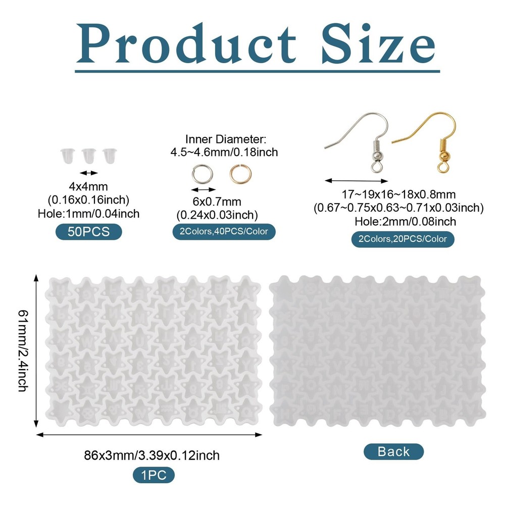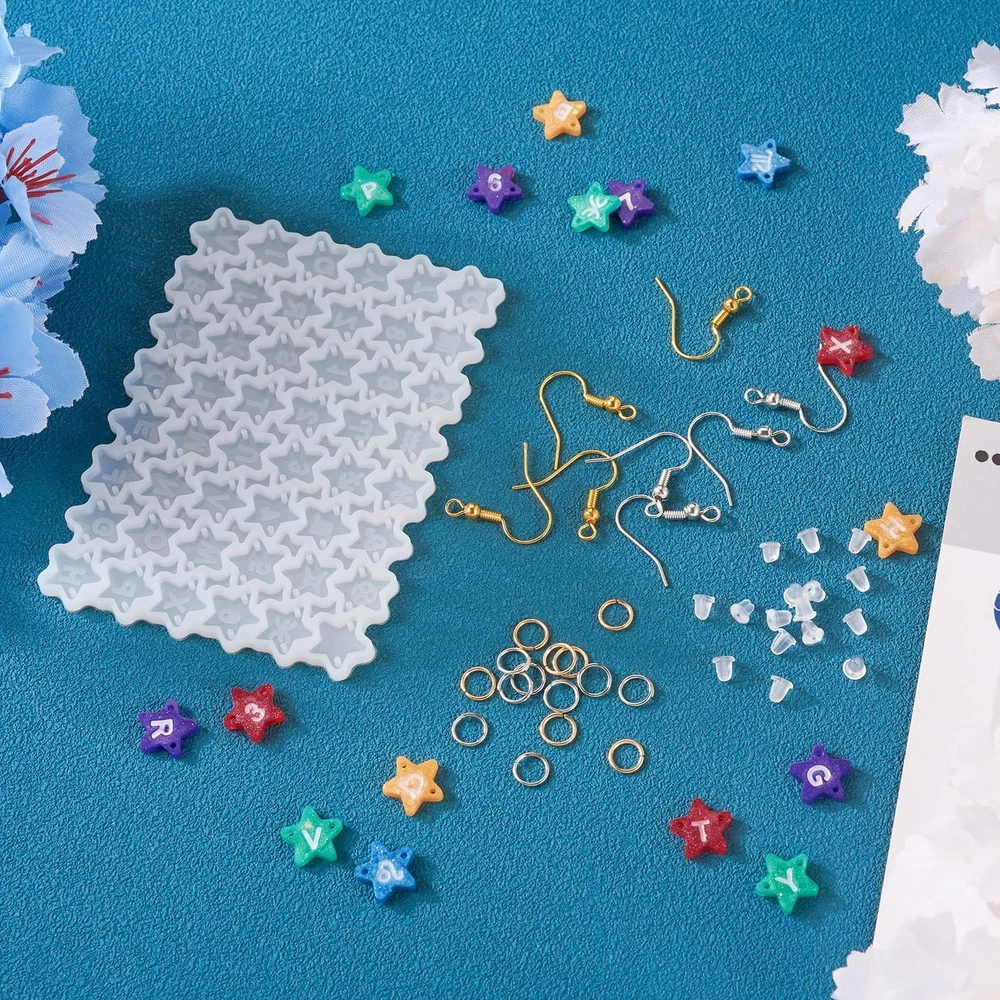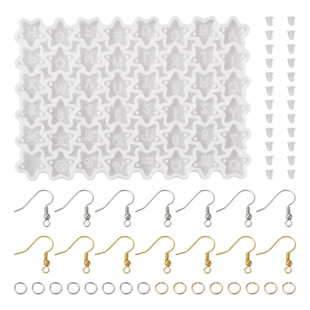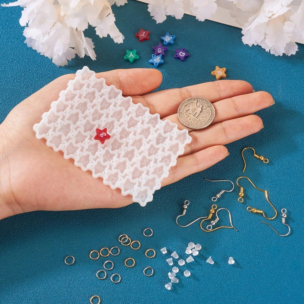 Letters A - Z Star Earring Silicone Molds, Alphabet Number Zodiac Sign Resin Casting Molds with Open Jump Rings and Earring Hook, Resin Jewelry Earring Molds for Epoxy Resin Earrings Making Product Details Color: Star, Letters & Numbers & zodiac Brand: Magibeads MPN: 1 UPC: Does not apply EAN: Does not apply Brand: Magibeads Color: Star, Letters & Numbers & zodiac Theme: Alphabet Item dimensions L x W x H: 3.39 x 2.4 x 0.12 inches Material: Silicone, Plastic Brand: Magibeads Color: Star, Letters & Numbers & zodiac Theme: Alphabet Item dimensions L x W x H: 3.39 x 2.4 x 0.12 inches Material: Silicone, Plastic Seasons: All Seasons Included Components: 1pcs DIY earring silicone molds, 40pcs brass earring hooks, 40pcs iron open jump rings, 50pcs plastic earring nuts Item Weight: 0.06 Pounds Number of Pieces: 1 Style: Modern Model Name: 1 Special Feature: Two Holes for Personalized Vertical Words Art Craft Kit Type: ART_CRAFT_KIT Manufacturer: Magibeads Product Dimensions: 3.39 x 2.4 x 0.12 inches Item Weight: 0.96 ounces Item model number: 1 Date First Available: August 25, 2023 Package Included: You will get 1pcs DIY earring silicone molds (star with letters, numbers & constellations), 40pcs brass earring hooks, 40pcs iron open jump rings and 50pcs plastic earring nuts. For size details, please check the images. DIY Supplies: The center of the star connector charms includes the letters A - Z, the numbers 0 - 9 and the 12 signs of the zodiac. These resin molds are reusable, you can make multiple sets of alphabet earrings with just one set of molds, it's so practical and economical! With 2 Holes: all the stars have 2 holes, so you can link them one by one to spell out a vertical word which is special or meaningful, to make personalized earrings. Material: Made of high quality silicone, the molds for earring pendants are soft and flexible, durable and sturdy. They are smooth and easy to clean, so they can be reused. Wide Application: While these are earring making molds, they can also be used to make charms for keychains, necklaces, bracelets, zipper pulls, cell phone straps and more.
