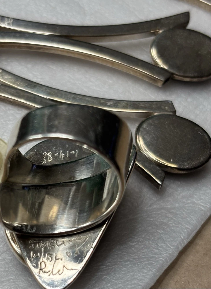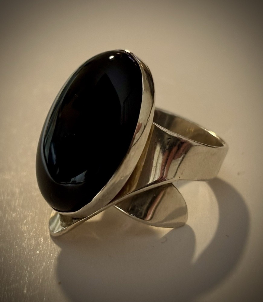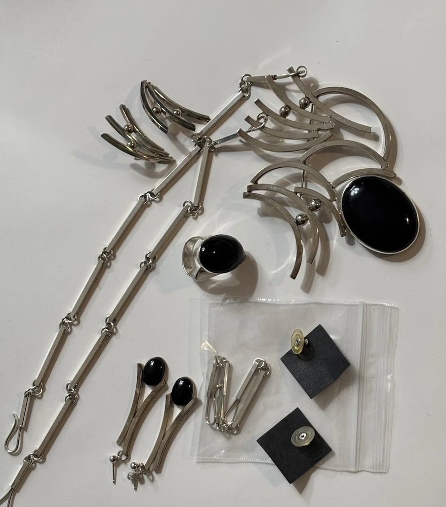 Aaron Rubinstein Sterling Silver Onyx Collection - Sterling Silver Pendant NECKLACE with an etched signature Aaron Rubinstein and is dated. -Black Onyx handcrafted sculptural sterling silver adjustable RING features a freeform black onyx cabochon (18 mm x 13 mm) -Pair of beautiful dangle EARRINGS created from sterling silver and Onyx. -Additional Pair of Modernest EARRINGS with artist etched initials. -Also included extension links for pendant. AS-PICTURED 🔹PRIVATE COLLECTION