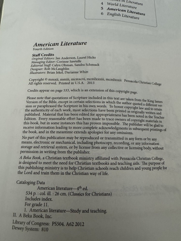 Abeka American Literature textbook, 4th Edition. Grade 11 curriculum. Condition: Good overall condition. Light cover wear from use. Pages are clean with no major writing or damage noted. Binding is solid. Great replacement or homeschool curriculum copy. Ships securely via USPS Media Mail. SKU B-5