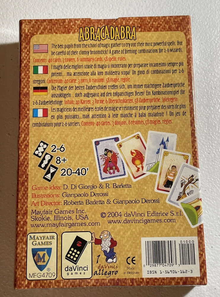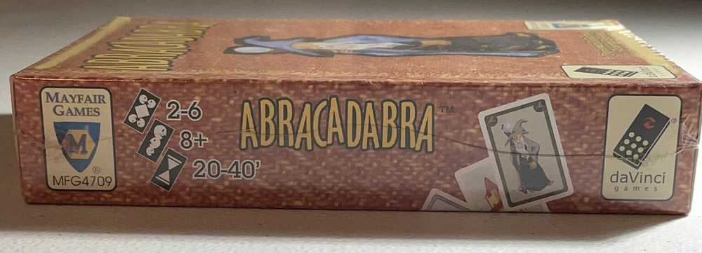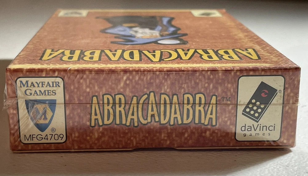 Abracadabra Card Game *Sealed* Produced by Mayfair Games, daVinci Games 2004 2-6 Players, 20-40 Minutes The best pupils from the school of magic gather to try out their most powerful spells. But be careful of their clumsy broomstick! A game of forming combinations for 2-6 wizards. Contents: 40 cards. 3 towers, 6 summary cards, 58 spells, rules. ----------------------------------------------------------------------------- We value our customers and appreciate you shopping with Distant Realms Gaming. As collectors ourselves, we understand the need for your items to be packed with care. Please send a message with any questions you may have or if you’d like any additional photos, we’ll be glad to help. Our products are passed down from a retired Hobby Shop owner, who shared his passion for the realms of gaming and fantasy. After decades of being immersed in gaming, Ahzz’z collection became quite vast. We will be listing an array of gaming specialty items as we sort through these relics. Terms & Conditions Funds are due within 48 hours of the transaction, after which incomplete payment transactions will be cancelled. Returns Accepted. It is the buyer’s responsibility to pay all return shipping costs. Refunds will be issued when the item arrives back to us in the same condition that it was sent in, untampered and unopened if sealed.