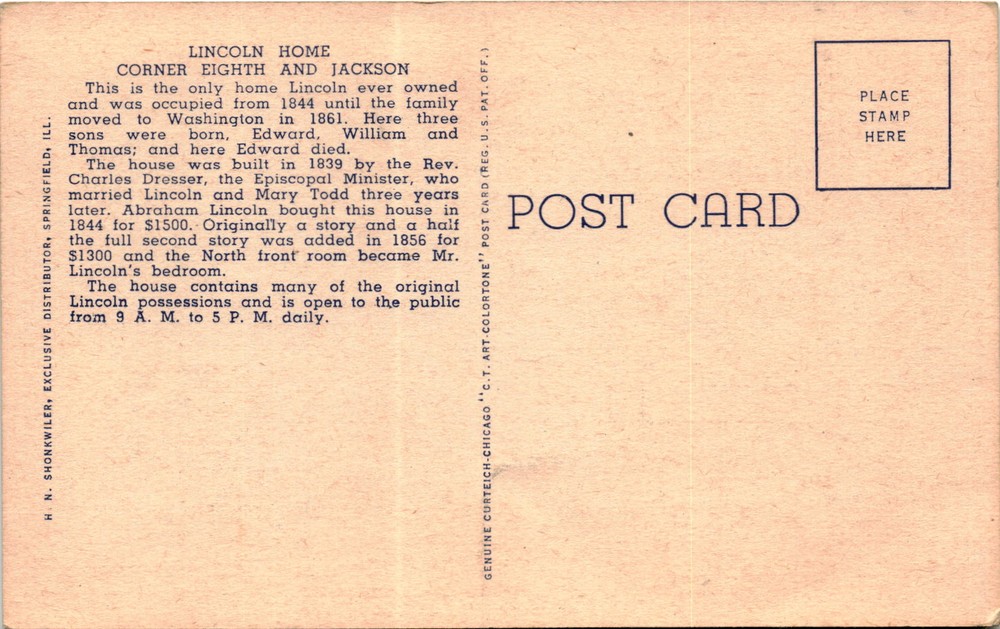 MAKE AN OFFER. THE MORE YOU BUY THE BETTER DEAL I WILL ACCEPT The postcard describes Abraham Lincoln's home in Springfield, Illinois, located at the Northeast Corner of Eighth and Jackson streets. Lincoln purchased the home in 1844 for $1500, making it the only home he ever owned. The house was occupied by the Lincoln family until they moved to Washington in 1861.