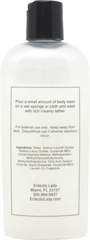 Eclectic Lady Our eBay Store About Us Contact Us Absinthe Body Wash by Eclectic Lady 3-IN-1 BODY WASH - Lather up with the creamy bubbles of our pretty pearl body wash, it can also be used as a hand soap and bubble bath for added convenience and value. SIGNATURE SCENT - Enhance the ambiance of your home by pairing our linen mist with our room sprays to create a signature fragrance throughout your space. Mix and match scents to create a personalized aroma that will make your home feel warm and inviting. DECADENT FRAGRANCE - Our Absinthe is bright lemon, fresh orange are topped with white jasmine and sensual musk. This fragrance is phthalate free. HANDCRAFTED IN USA - Each bottle of our body wash is individually handcrafted in the USA with care and attention to detail, ensuring you receive a high-quality product every time Directions Pour a small amount of body wash on a wet sponge or cloth and wash with rich creamy lather. Ingredients Water, Sodium Laureth Sulfate, Sodium Lauryl Sulfate, Cocamide MEA, Cocamidopropyl Betaine, Methylparaben, Methylchloroisothiazolinone, Methylisothiazolinone, Citric Acid, Sodium Chloride, Glycol Distearate, Cocamide MEA, Laureth-10, Fragrance. All of our products are made to order. To avoid leakage in transit, Eclectic Lady tapes all caps on our bottles and places each bottle into its very own reclosable bag.