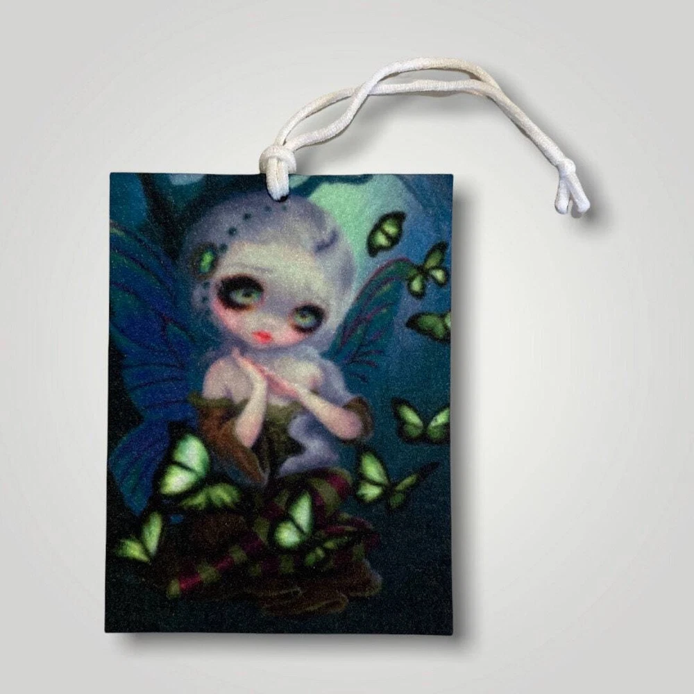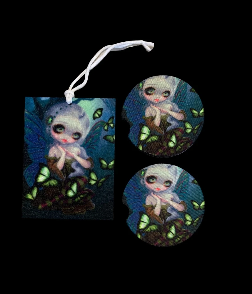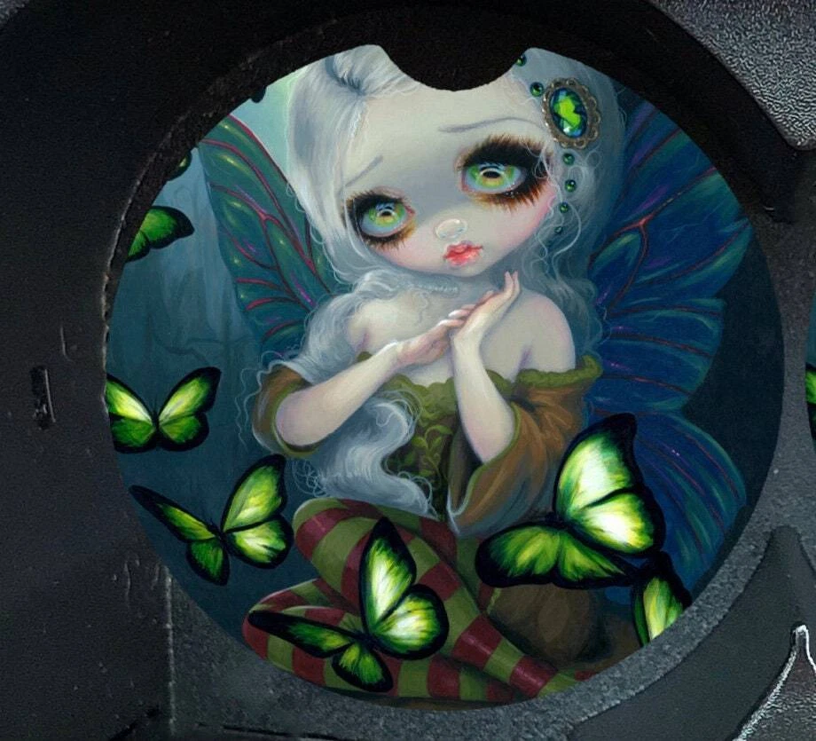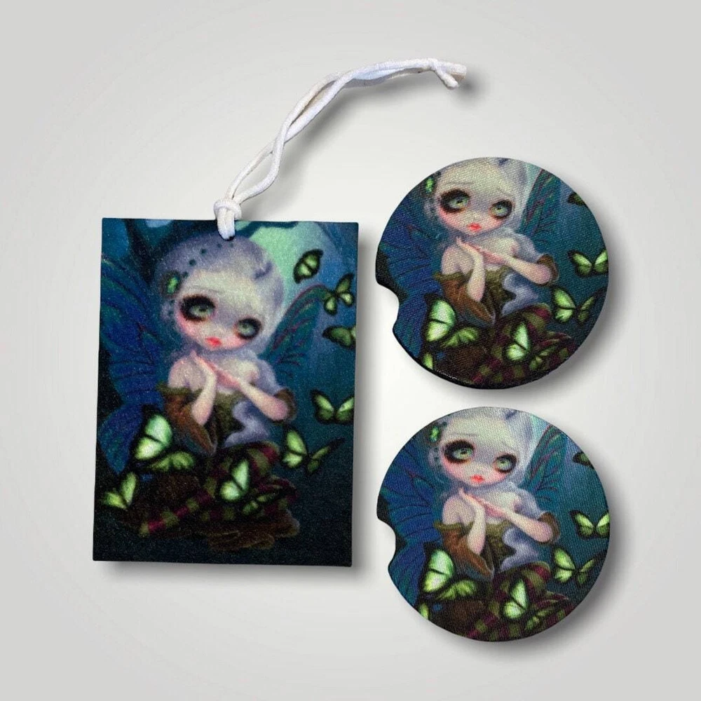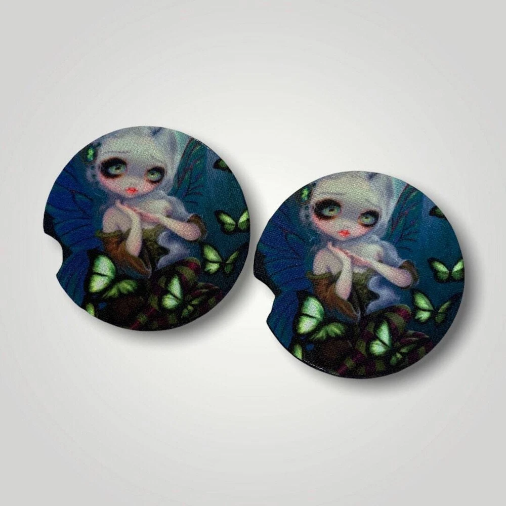 This piece is titled Absinthe Butterflies by Jasmine Becket-Griffith Cute Woodland Fairy is surrounded by green butterflies. Set of 2 Neoprene slip proof waterproof car coasters to protect your cup holders for your car, SUV, Truck. Can even be used in your favorite recliner, ride on mower or tractor! These are 2.6" in diameter with a divot to pick up easily. I'm so proud to announce an incredible collection of artwork by Jasmine Becket-Griffith! Artwork in the Strangeling collection. See our other listings to choose from Air Fresheners, Car Coasters, Microfiber Towels, Vanity License Plates, Mugs with Drink Coasters, Bookmarks, Keychains, Christmas Ornaments and more to mix and match for a custom gift bundle. All items are printed in-house.
