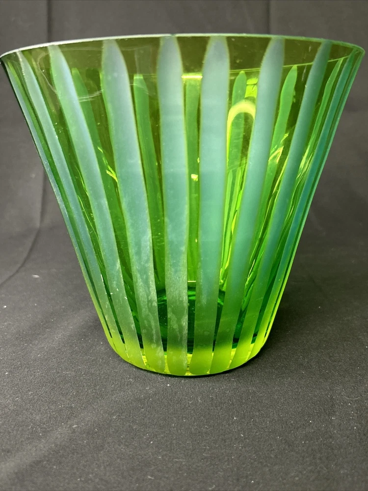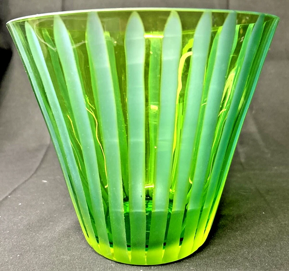 Absinthe Green Hand Blown Fluted Glass Bowl with an Etched Blue Striped Pattern/Vibrant Colorful Statement Art Glass Vase/Groovy Psychedelic Urn Measurements: 6 1/4" tall, 7" in diameter. Condition: Very good. Two scratches and one tiny flea bite on rim. I have included photos of these areas. Please carefully review for condition.