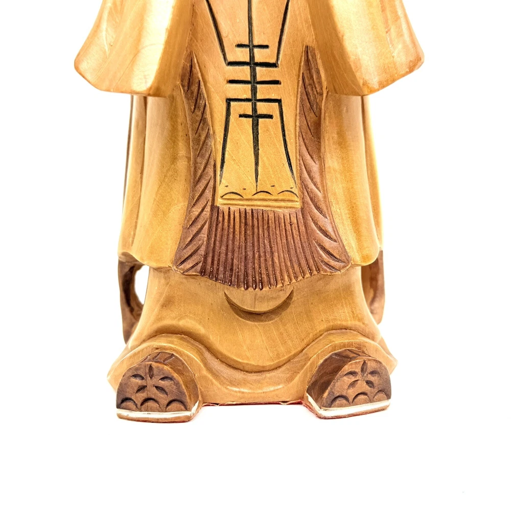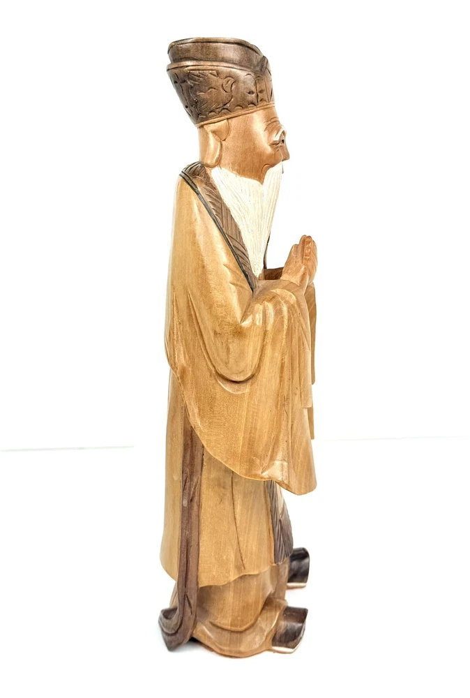 What an absolutely masterful piece of hand carved wood art! This figure of Kong Fuzi/Confucius is made from a solid piece of wood. I believe itβs olive wood, and the figure feels heavy for its size. There is an incredibly amount of detail put into the carving of the wood, especially into the face and beard. The figure is in good physical condition with only the slightest bit of surface wear. Has no cracks or breaks in the wood. Bubbling of red felt on bottom insisted with the age. Let me know if you have any questions. Blessings to you! π©Άπ€π©΅