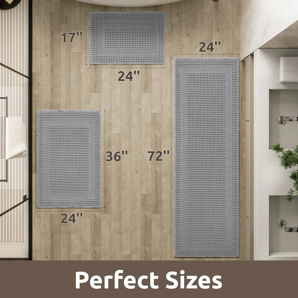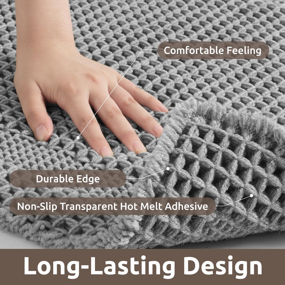 [Upgraded Waffle Bath Mat] Featuring a unique waffle design, our boho bathroom rugs can bring a touch of art to your bathroom. Woven with upgraded yarn, these absorbent bath mats for bathroom non slip is a combination of beauty and durability. Heavier and thicker threads are applied to make the grey bathroom mat more solid and never out of shape. [Super Absorbent Bath Mat] The super absorbent upgraded yarn and unique waffle texture make our long bathroom rug runner able to continuously absorb moisture like a sponge. These bath rugs non slip washable can soak up the water and prevent water seepage, keeping the floor dry at all times and protecting your feet from cold floor. [Non Slip Bath Mat] Designed with non-slip rubber backing, our bath rugs for bathroom non slip can tightly grip the floor and stay in place. There is no need to purchase extra grey bath mat tape. These bathroom rugs non slip washable are suitable for kids and elders, protecting them from slipping after shower. [Washable Bathroom Rugs] This waffle bath mat boho is designed to be machine washable, making cleaning a breeze. Machine wash the non slip bathroom rug runner with a laundry bag in cold water and mild detergent and hang it to dry. We recommend gentle mode, and do not tumble dry or iron. [Comfortable and Soft Bath Mat] The three-dimensional waffle design makes the washable bathroom runner rug very soft, giving you a comfortable feeling like stepping on layers of clouds. Enjoy the cozy underfoot touch after every shower with our bathroom mats non slip. Let the boho bath rug clear away your fatigue of the day.