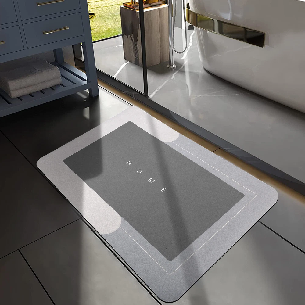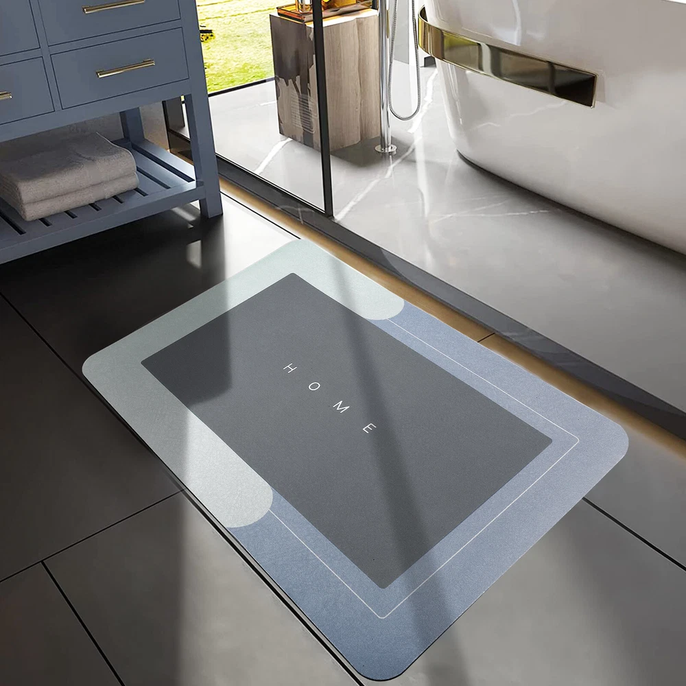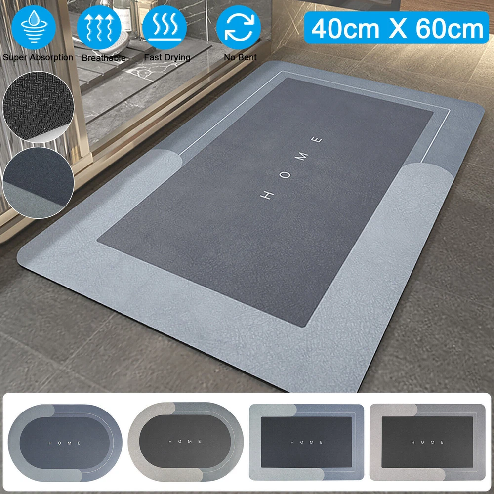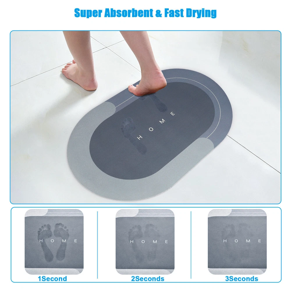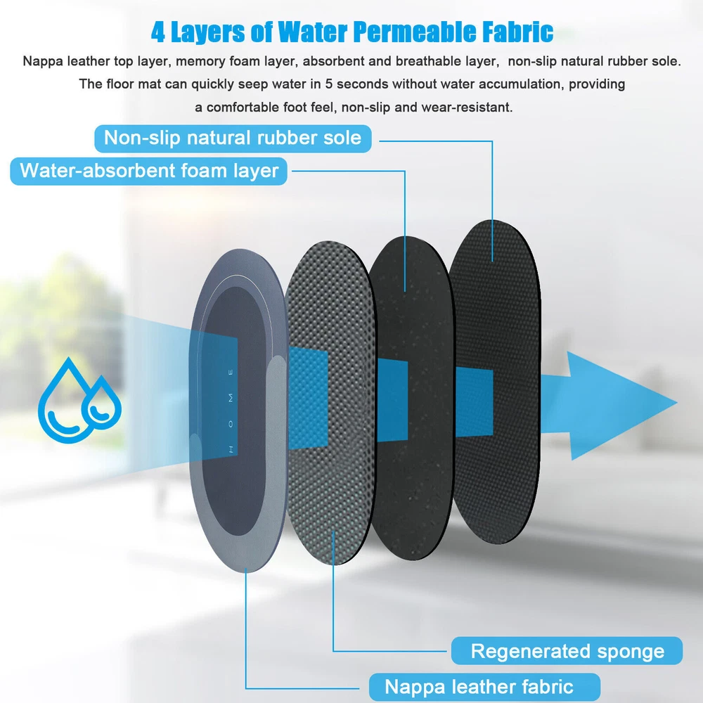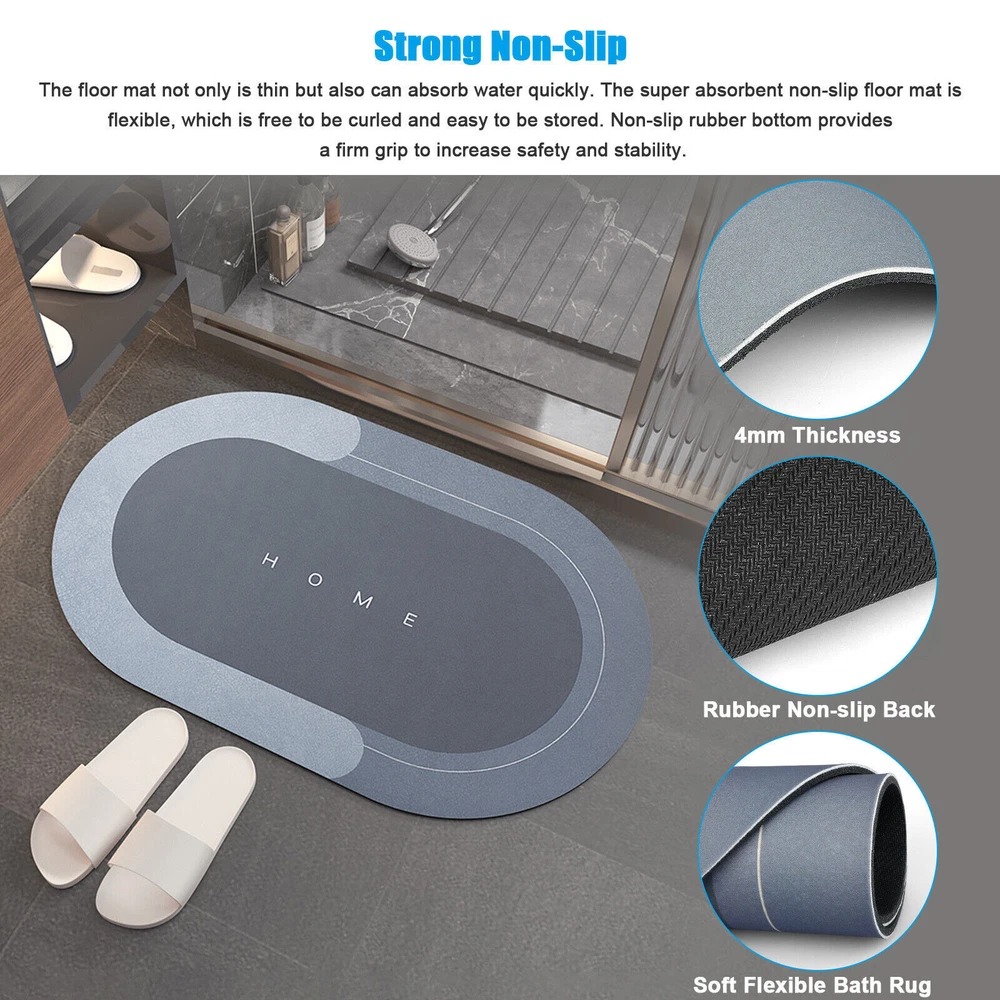 Product Feature 4 Layers Of Water Permeable Fabric : Nappa leather top layer, memory foam layer, absorbent and breathable layer, non-slip natural rubber sole. 5 seconds of rapid water infiltration, will not accumulate water, provide a comfortable foot feeling, non-slip and wear-resistant. Strong Non-Slip : Our non-slip floor mats are made of rubber+technical velvet, which dries faster than ordinary floor mats. Non-slip rubber bottom firm grip to increase safety and stability. Super Absorbent Floor Mat. absorbent bath mats quickly dry. High-Quality Floor Mats : Helps reduce damage floor from sprinkles and oil stains. Good quality floor MATS do not decompose or compress over time, can be used continuously for a long time. Super Absorbent Diatom Cushion Dirt Resistant & Easy to Clean : The doormat is oil-resistant and absorbs water quickly. The absorbent floor mat only needs to be cleaned with a brush or sponge, which saves you time and energy. Smooth surface designed to resist dirt and hair. Just wipe the rugs for the bathroom with wet cloth or rinse with shower nozzle can make your shower rug as well as new. Multi-Purpose Use : The fast-drying bath mat can be used at the tub side, in front of the sink. This quick-dry bath mat can be matched with any decoration, which is very suitable for modern homes. Great for any room of the home such as the bathroom, kitchen, laundry room, living room, bedroom, etc. It is a great gift for all occasions. Product Specification Type Super Absorbent Bathroom Mat Size 40cm*60cm Color Blue/Light grey Shape Rectangle/Oval Material Technical Velvet + PVC Features 4 Layers Of Water Permeable Fabric, Strong Non-Slip, Dirt Resistant & Easy to Clean Use Bathroom, kitchen, laundry room, living room, bedroom, etc. Package Included 1 x bathroom mat