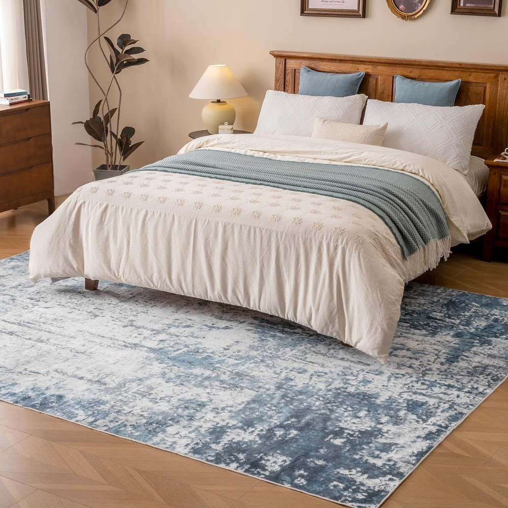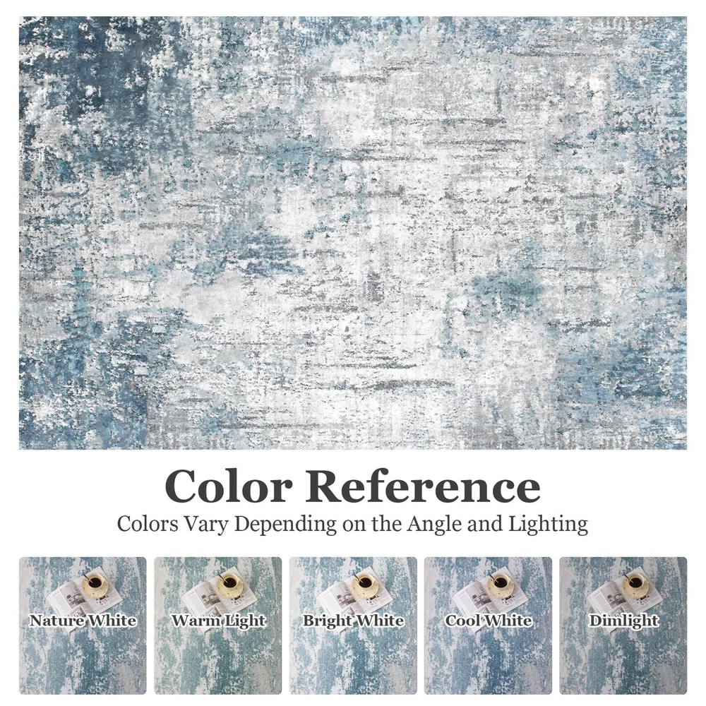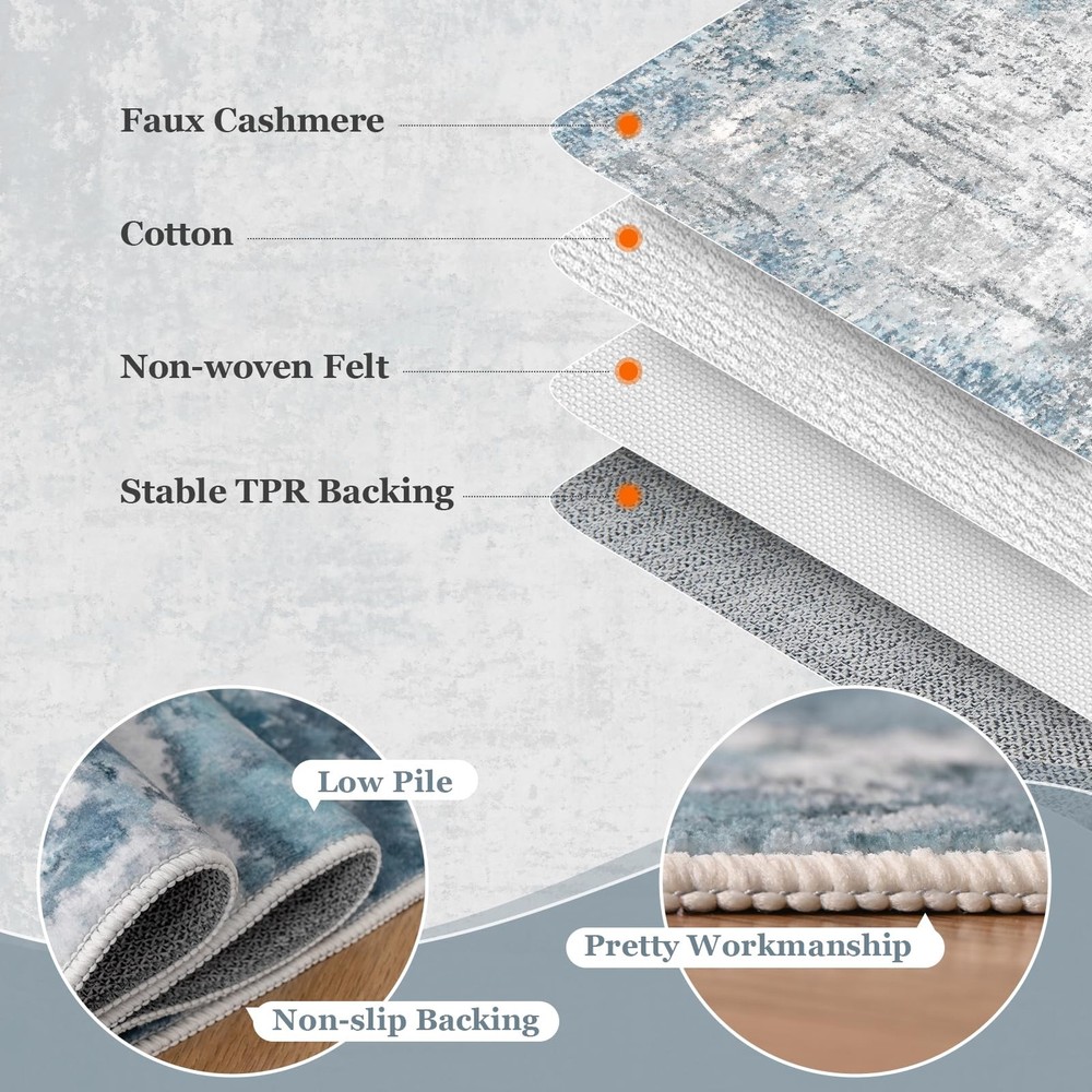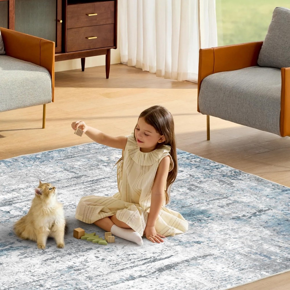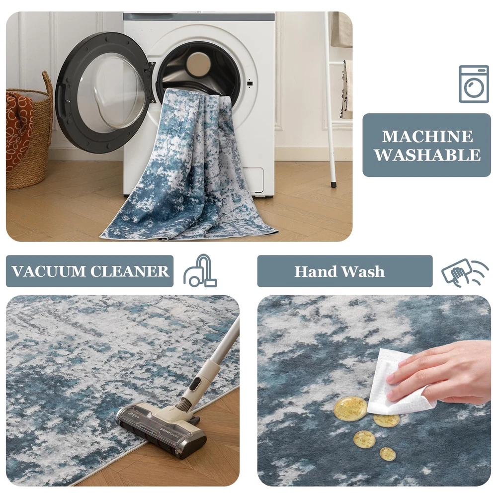 The washable rugs are machine woven with finer fiber making them extra soft and comfort than traditional area rugs. Whether you step on with bare feet or laying on with your children or pets, you can feel the warmth and coziness underneath. Ultra Soft Low Pile: machine washable rug is a must-have treasure for high-traffic areas of the home life. Low pile rug is warm and cozy. It's easy to wipe down without staining so washing the area rug will be done on a minimal basis. Whether walking on the livingroom rug barefoot or sit on it, modern rug make you enjoy a high-quality and relaxed life. Machine Washable Rug: In addition to wiping stains, rugs can be cleaned using washing machines, vacuum cleaners, and robot vacuum cleaners. The abstract rug is lightweight and tightly woven. To ensure the restoration of the color of the large rug after cleaning, please place it in a cool place to dry naturally. The non-shedding process protects your respiratory health, and makes the washable area rug soft and comfortable after washing. Modern Design: The color of the area rug living room is neutral and stylish. combines modern and exquisite design to create abstract rugs for you, giving your home a new look. The lightweight rug combines aesthetics and practicality, and can be easily matched with a variety of styles of furniture and decorations. The rug is great to protect wood floors and give warmness to any room. Versatile Non-slip Rug: The bottom of the washable rug is TPR rubber backing to make the washable rug stay put and the low pile allows for convenient placement in the front door entry, underneath the dining room table or bed. Thin rug can be used in the living room, bedroom, kitchen, dining room, nursery, study, bathroom, playroom and any other area needed. Warm Tips: The rug is folded and packed, slight creases are normal. After receiving the large rug, please lay it flat on the floor for the creases to disappear. The carpet rug have slight color difference due to the shooting light and the light of different monitors and rooms. If you have any questions about the bedroom rug, please feel free to contact us.