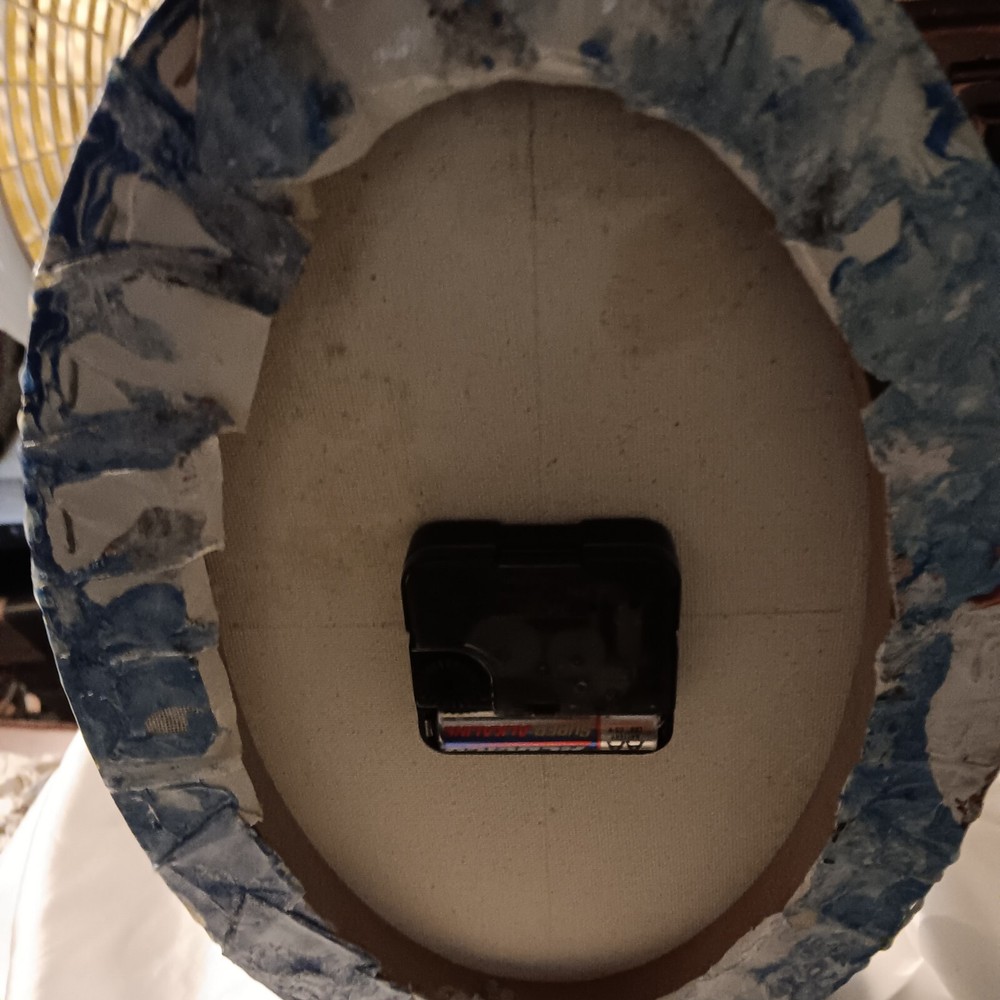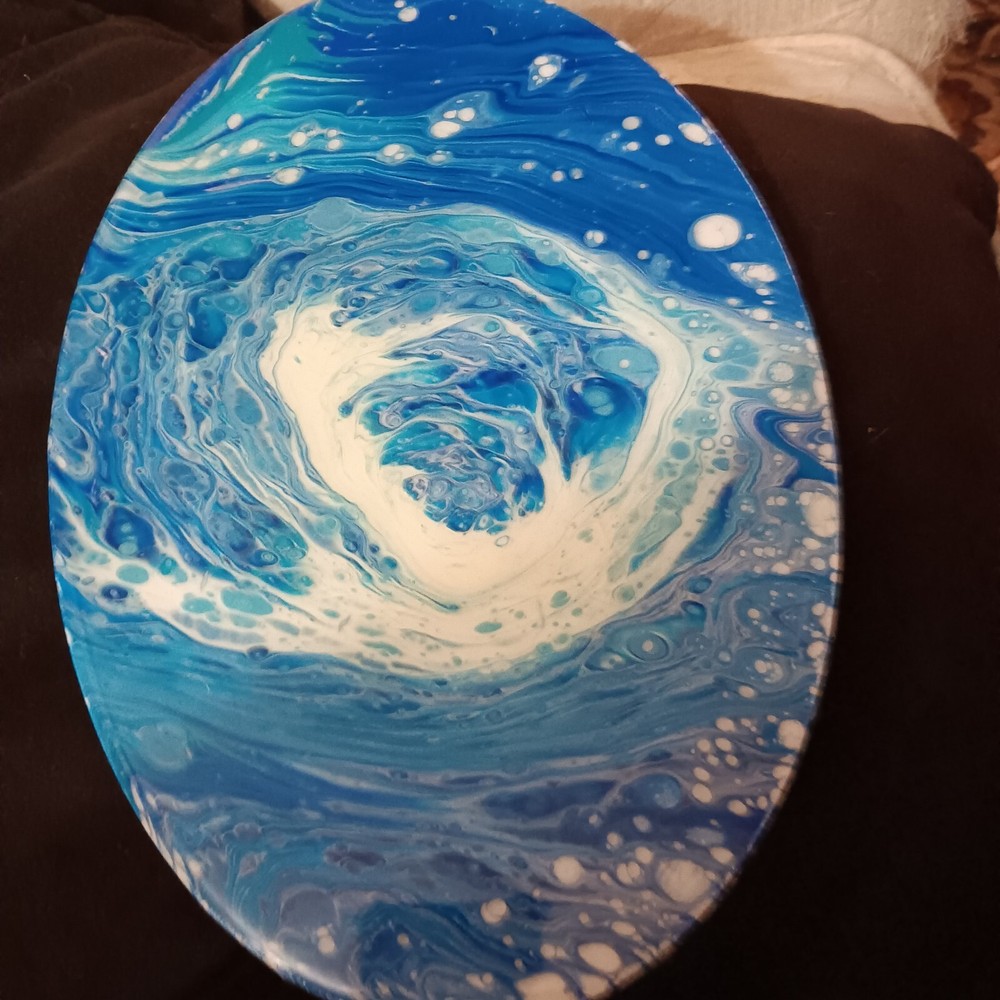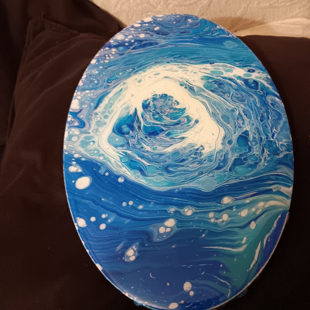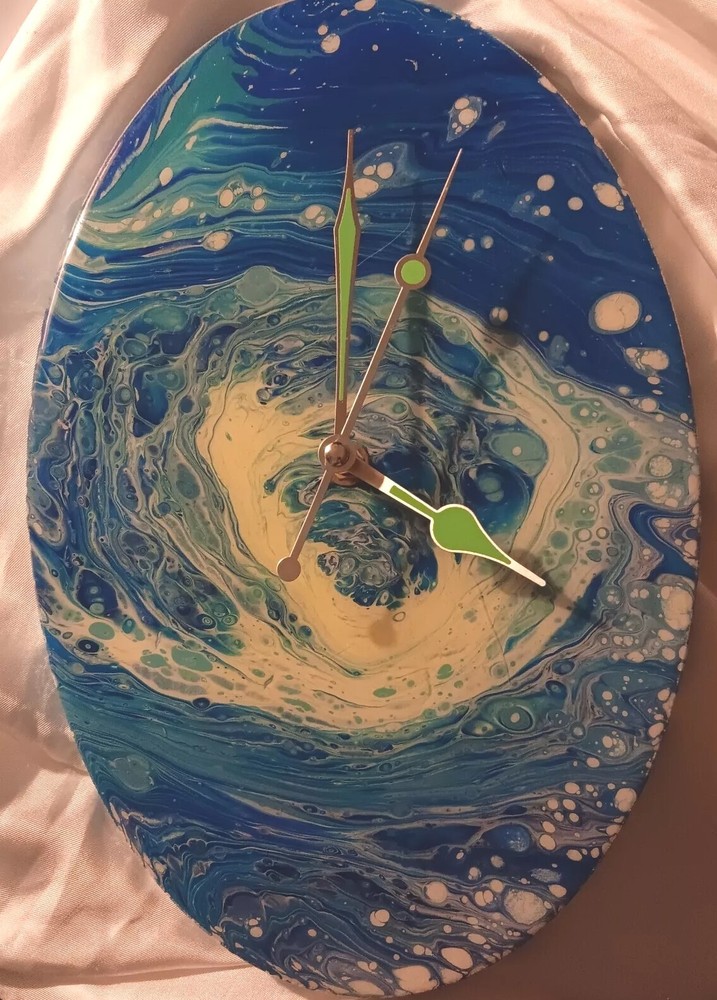 One of a kind, paint pouring acrylic and resin with clock 12x8" oval canvas