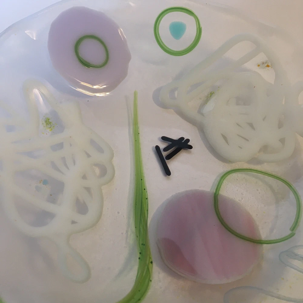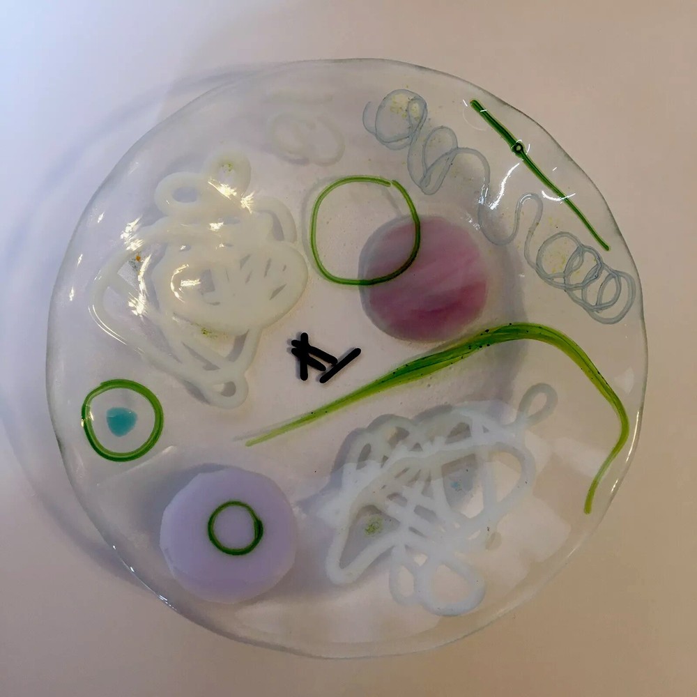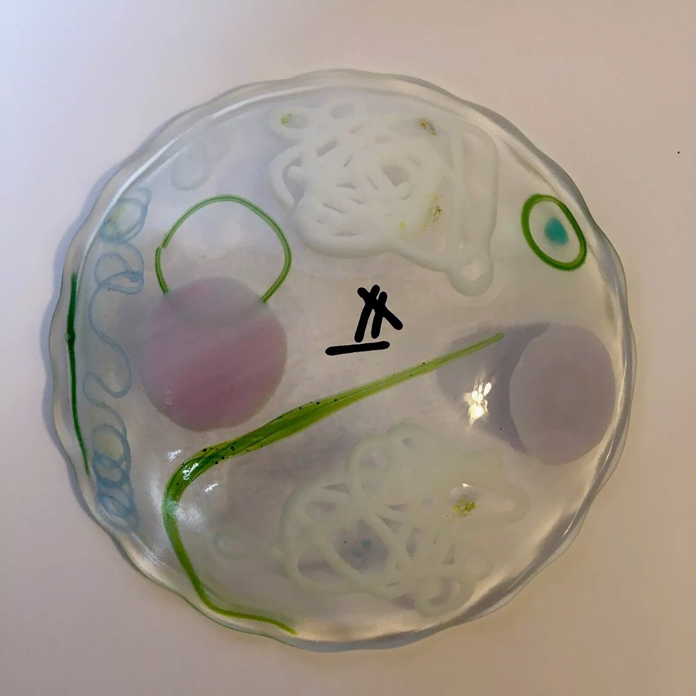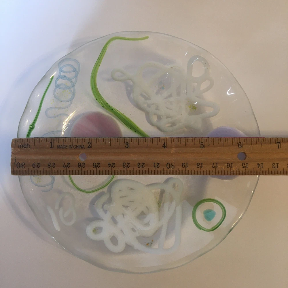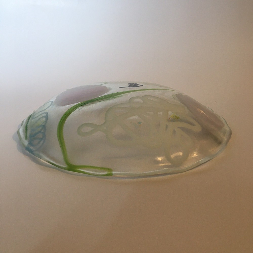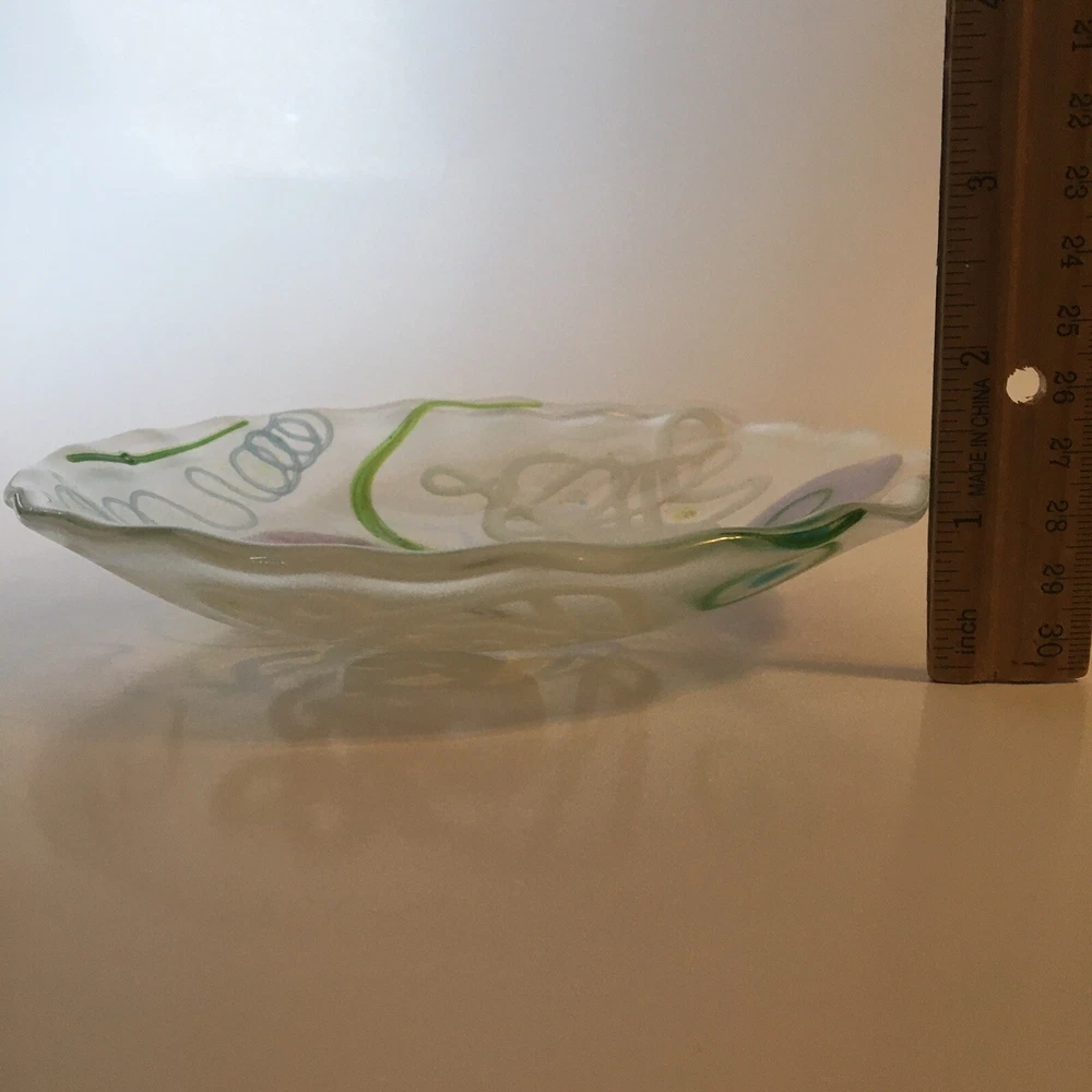 6 " Abstract Fused Glass Round Wavy Edge ART GLASS Shallow Bowl / Trinket Dish Unique 6" modern abstract design fused glass bowl/dish with wavy edge. Artist made. Appears to be unsigned. SEE PHOTOS. Condition is EXCELLENT - no chips or cracks. * SHIPS USPS GROUND ADVANTAGE * S&H $8.00 *