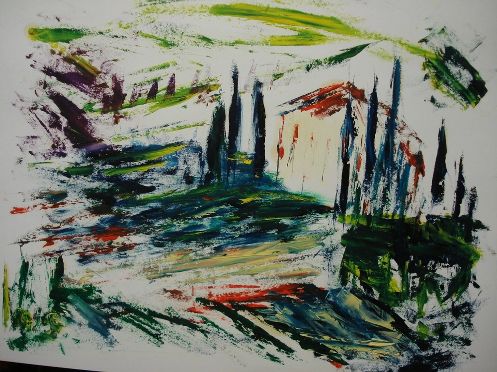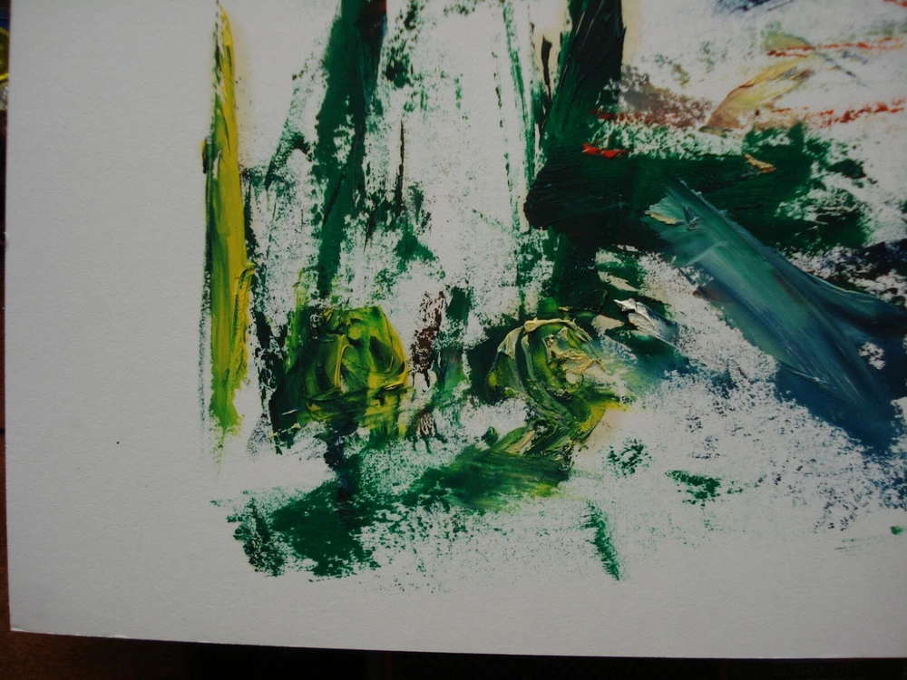 abstrakte Darstellung "Haus im Wald" Öl auf Malpappe Handgemalt - Spachteltechnik - KEIN Druck Das Bild ist unten rechts signiert mit "Jos" für Hugo Joswig aus Koblenz Urbar es stammt aus der 2. Hälfte des 20. Jahrhunderts Höhe ca. 70 cm Breite ca. 50 cm Sehr guter Zustand mit keinerlei Alters- und Hängespuren - aus dem privaten Bestand des Künstlers.