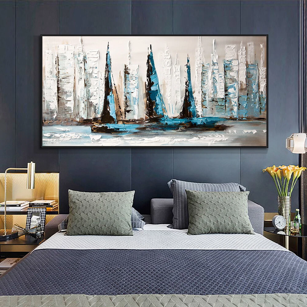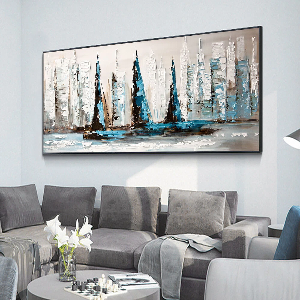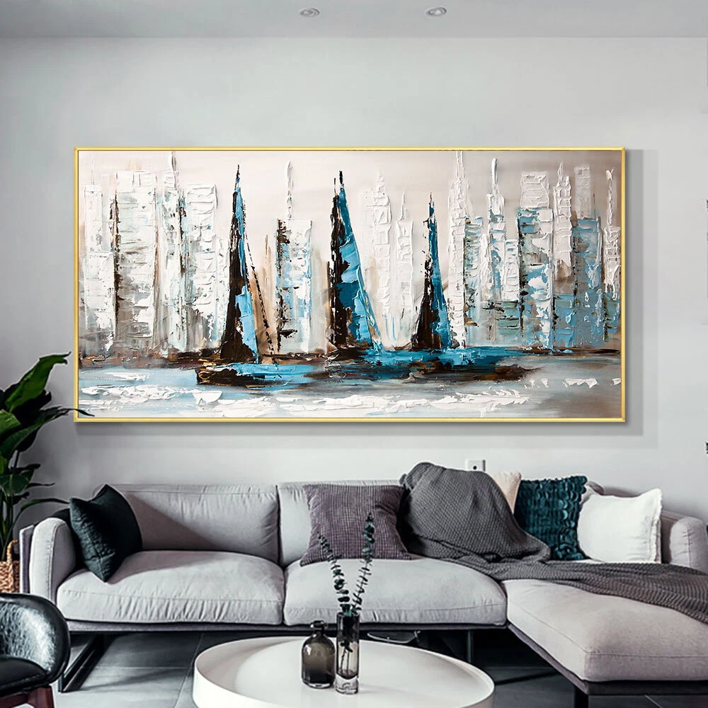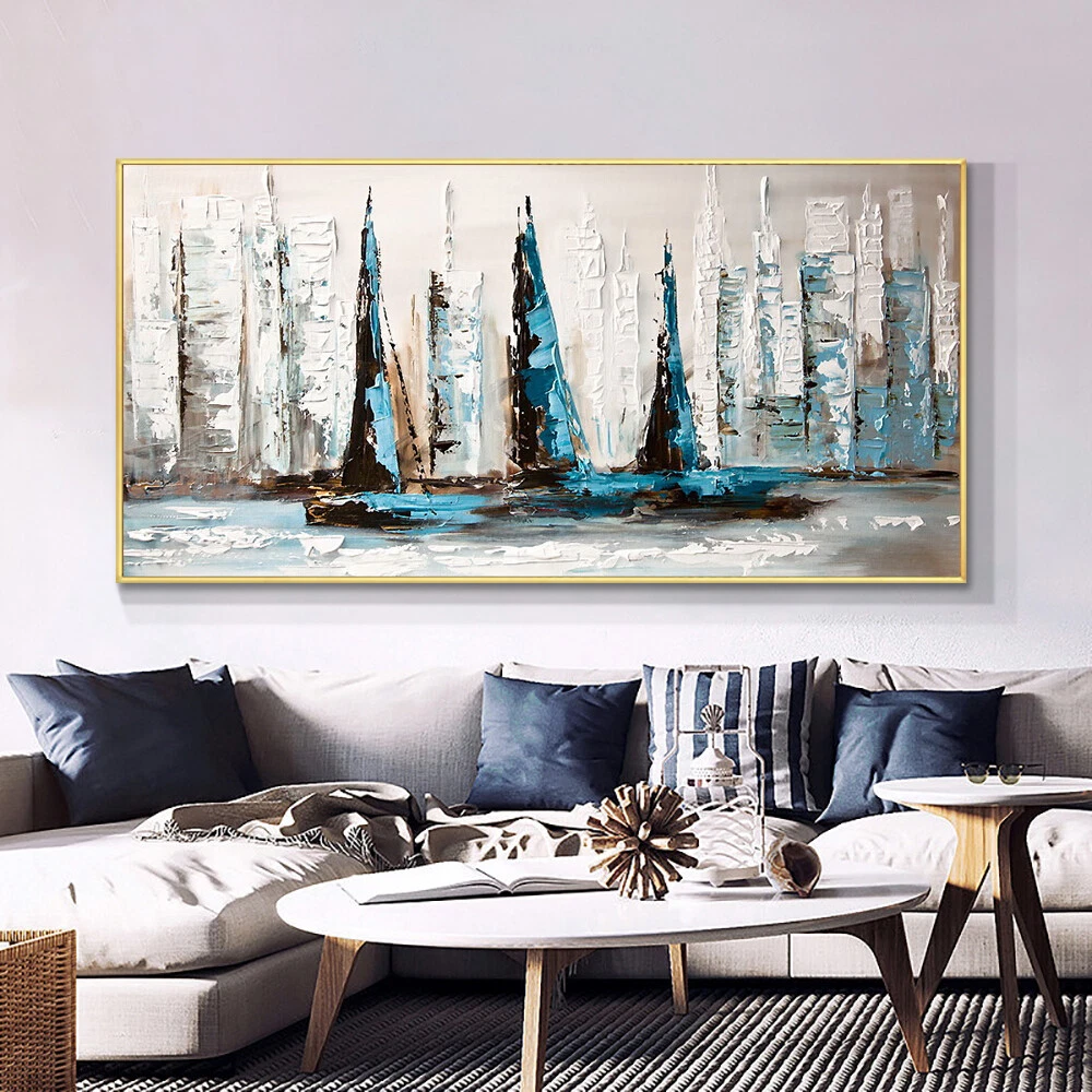 Abstract Blue And White Sailboats On The Sea Handpainted Oil Painting On Canvas