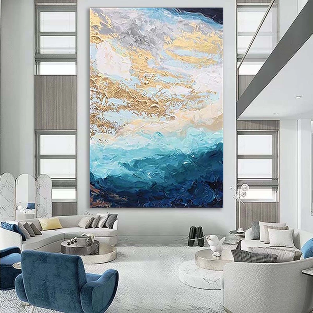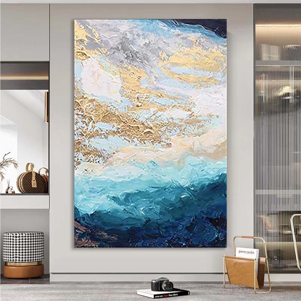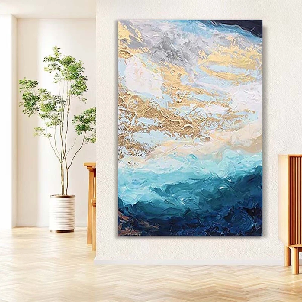 Abstract Blue Gold Foil Handmade Canvas Oil Painting Hanging Poster Wall Decor