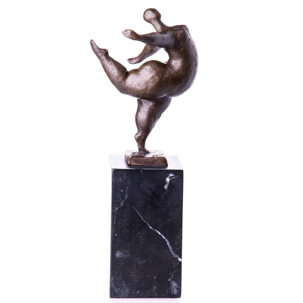 This contemporary bronze sculpture depicts a joyful dancing figure in a whimsical pose, full of movement and vitality. The stylized form emphasizes curves and balance, embodying a sense of freedom and playful elegance. Set atop a tall black marble pedestal, the piece blends modern abstract art with classic bronze craftsmanship, making it an eye-catching decorative statement for any space. Dimensions: Approx. 11.8 x 4.7 x 3.9 inches (30 x 12 x 10 cm)