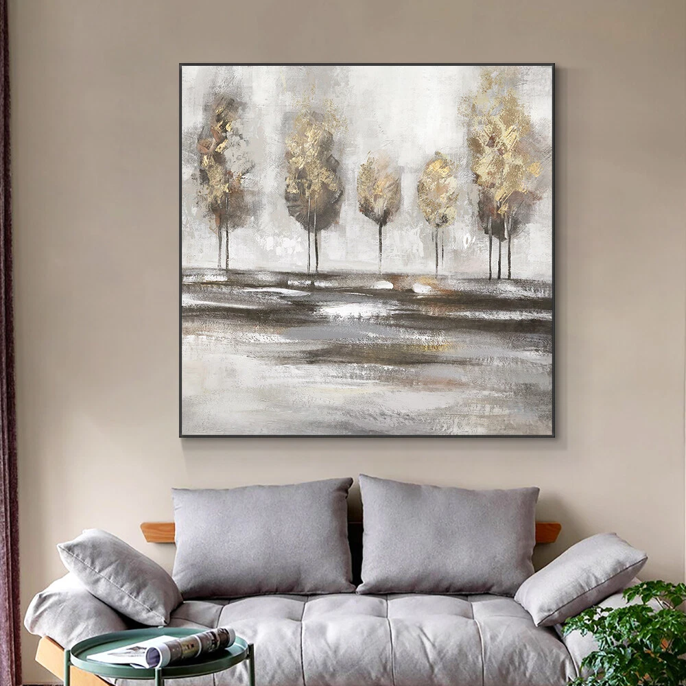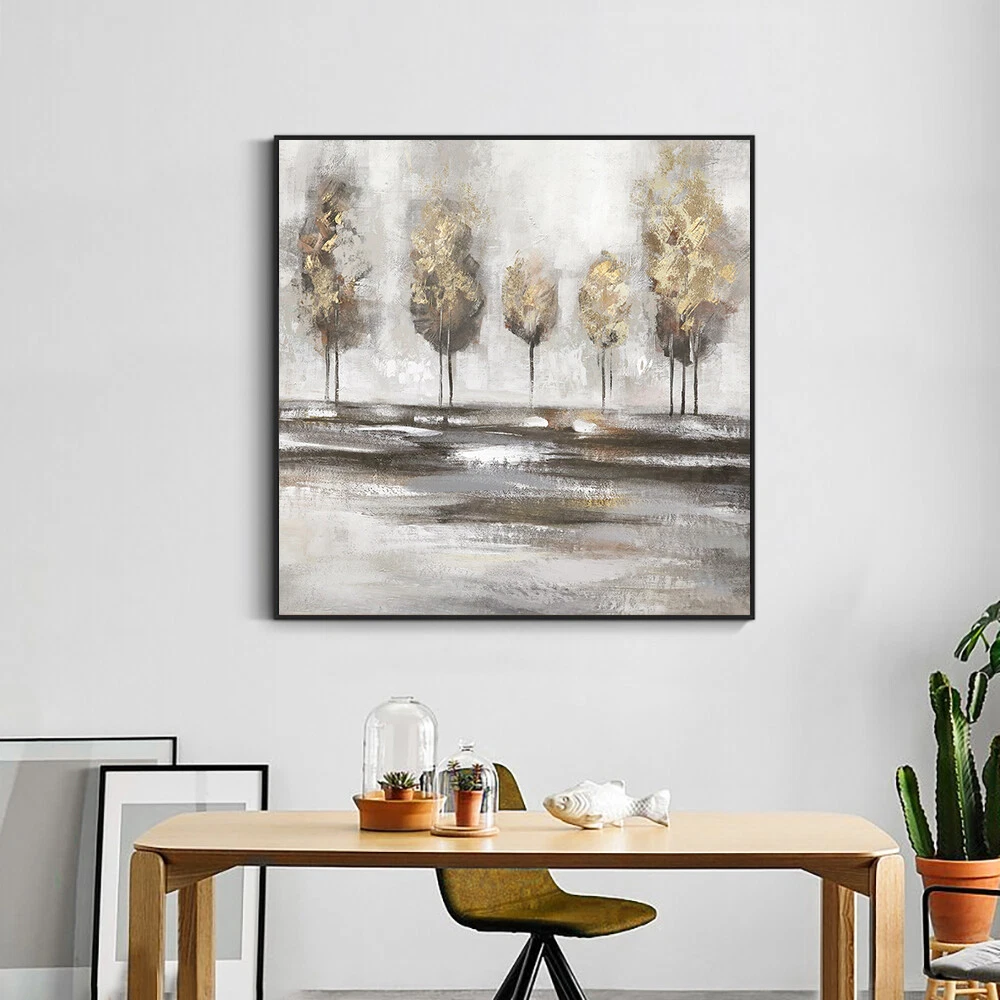 Abstract Brown Trees With Gold Foils Oil Painting Handpainted Textured Modern