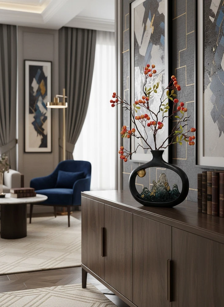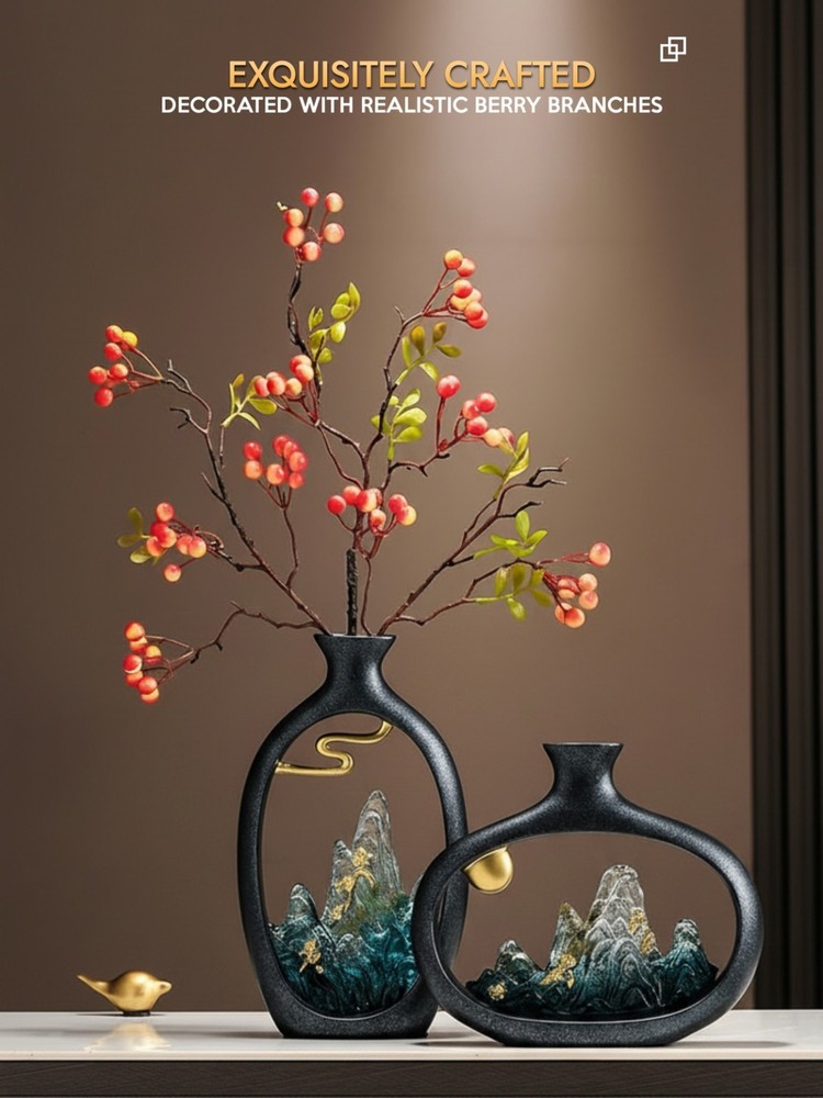 This modern abstract ceramic vase set with artificial green and berry branches is a luxurious addition to any home décor. The unique design and elegant shape make it a stylish and eye-catching piece, perfect for any room in the house. The easy-care and free-standing mounting make it convenient to display in various locations such as the bedroom, living room, or even the office. The decorative theme of flowers adds a touch of nature and sophistication to the overall style, making it a versatile and timeless accent piece for any space.