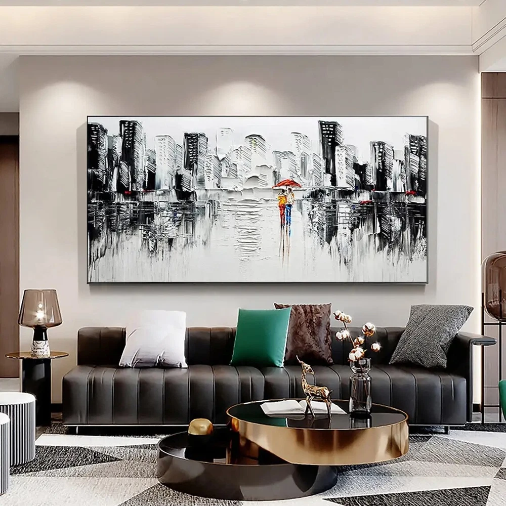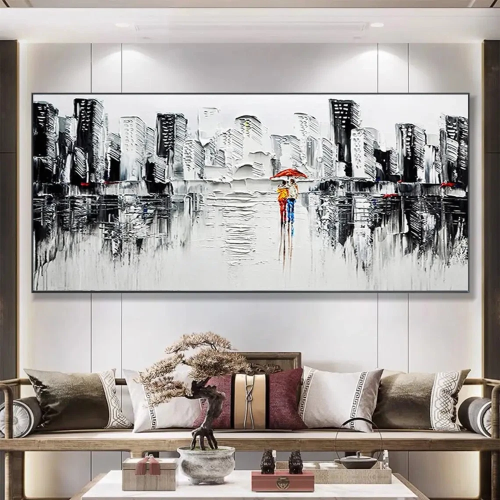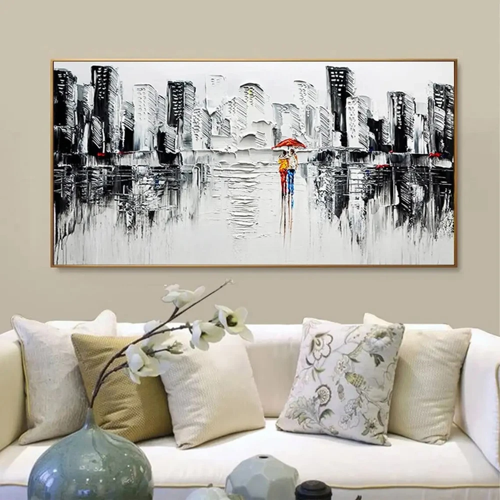 Abstract City Textured Oil Painting on Canvas Romantic Couple Modern Urban