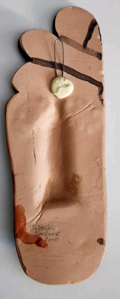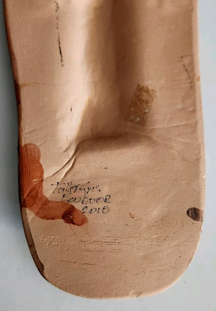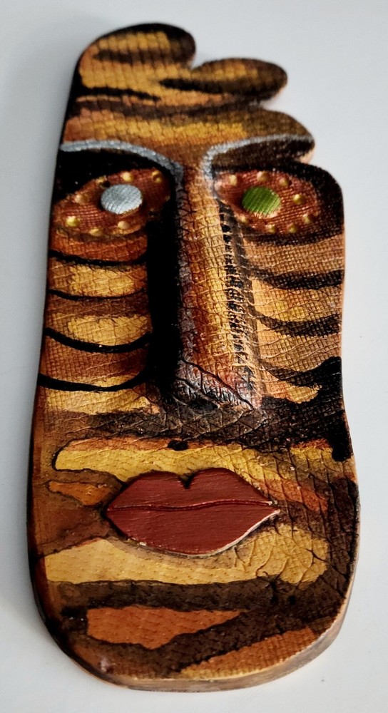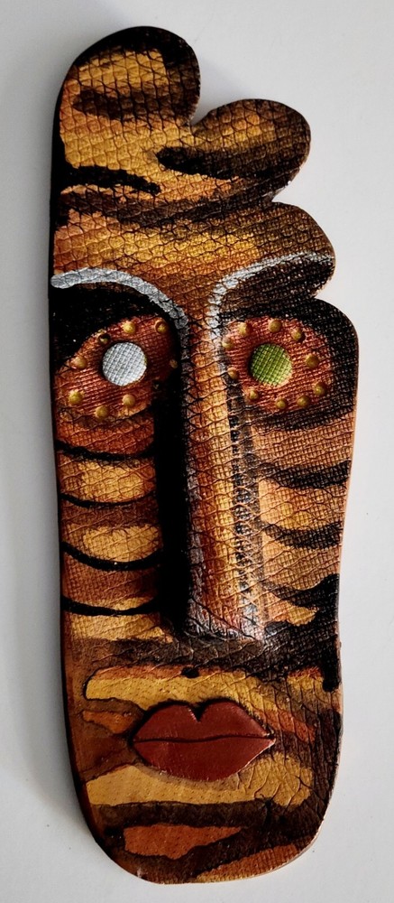 Hand made hand painted clay art face wall art. 10.5"H x 3.75"W at widest point. Signed by artist on the back. Made in Equador 2010. No chips, cracks or damage. Excellent condition.