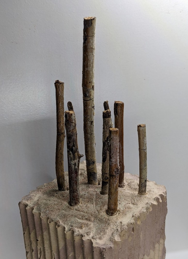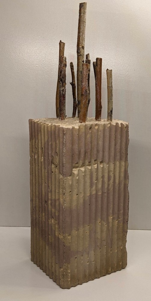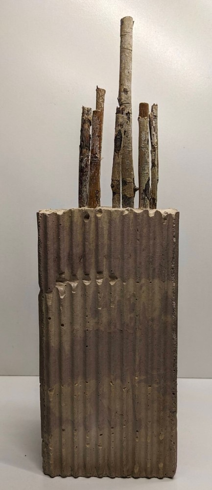 I appreciate the love for this piece, but if it doesn't sell by 8/8, it's going into my personal collection. : ) "Mother Tree" features a tan and brown solid concrete base and small branches/twigs. It represents the networks of trees some researchers believe communicate with (through underground fungi networks) and support one another in forests, with the biggest and oldest member being the "mother." Approximate dimensions: 3 x 3 x 10 inches Display this hefty piece (around 3 lbs.) on a shelf, windowsill, or mantel. Mortar/concrete has natural bubbles, indentations, and other beautiful imperfections from the curing process that give each piece it's singular personality. Nothing mass produced here: I create every item individually in my Colorado workshop! Note : Materials used in this artwork can break and be ingested. It's not intended for young children. The sculpture is perfect for those who appreciate the beauty of art and the intricacies of abstract designs.