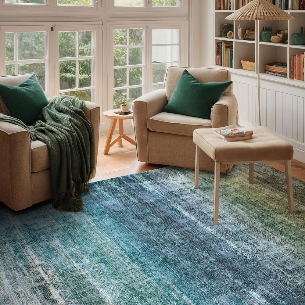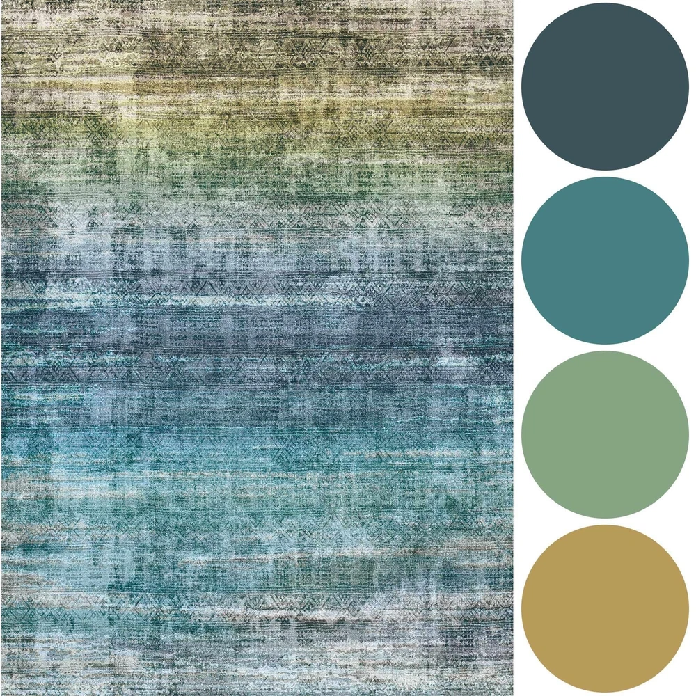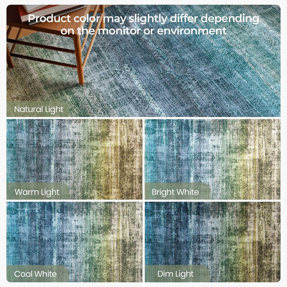 1 piece of area rug area rug is made from a cozy, material that feels like cashmere and is easy to care for. Our teal blue rug is suitable for barefoot walking, gentle to the skin, making it an exceptional choice for your home Machine Washable: Experience the convenience with the teal washable rug. For daily cleaning, vacuum or machine wash the rug. Due to its low-pile design, it is stain-resistant, and it can easily be cleaned directly with a sponge Non Slip & Long-Lasting: Experience the safety and stability of 's non-slip rug. The washable backing amd wear-resistant surface effectively grips various floor surface, including hardwood and laminate, which makes it safer in high-traffic areas Gradient Abstract Design: Transform your room with our stunning Oslo Collection rug. This living room rug presents a teal green gradient color scheme with a Moroccan style, while the distressed multicolor design creates a pleasant and cozy atmosphere Recommended Uses: This contemporary modern abstract rug is perfect for various uses - it can serve as a living room rug, bedroom rug; kitchen rug; dining room rug; hallway rug; or an entryway rug. And it's perfect for everyday use Rug Care: You may notice some temporary creases upon arrival. This is normal and will resolve over time. Just flatten the rug under furniture or roll it up for a few days to smooth out these temporary creases Rug Size Options: This indoor rug comes in different sizes to cater to your decor needs. You can place the rug on the floor of living room for a colorful, cozy accent. Or, put a 8x10 teal carpet under the queen bed