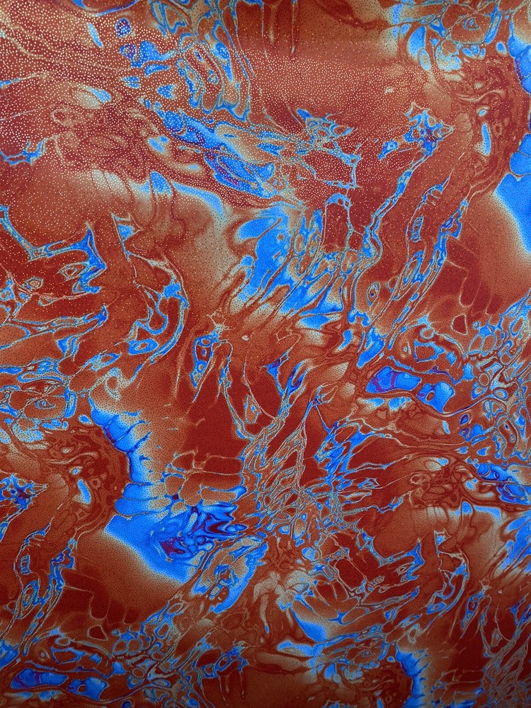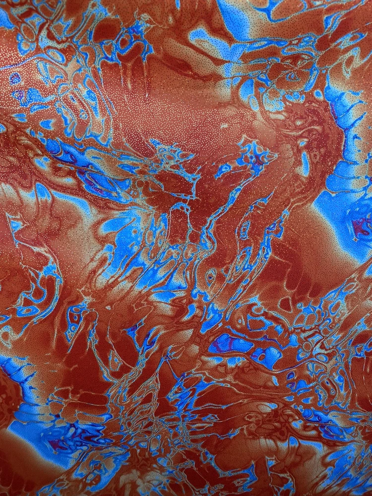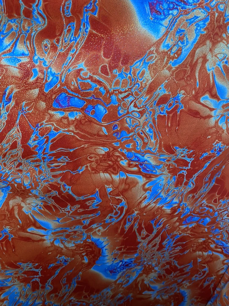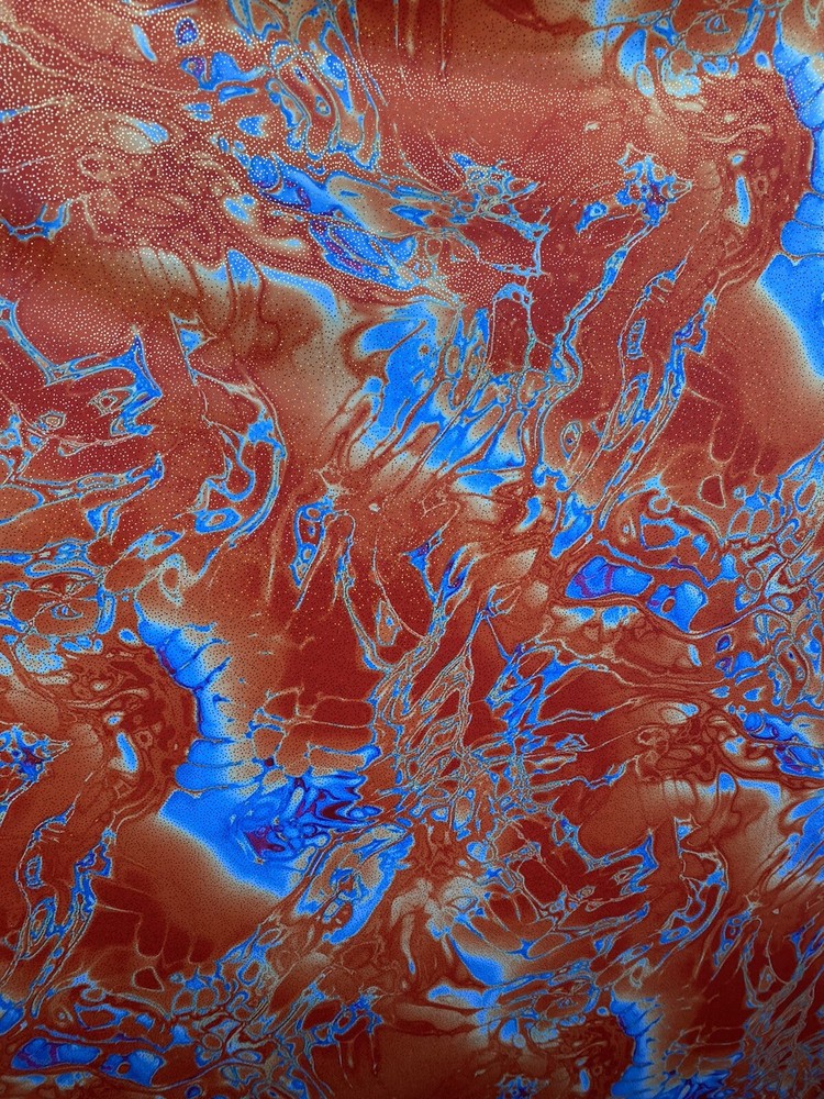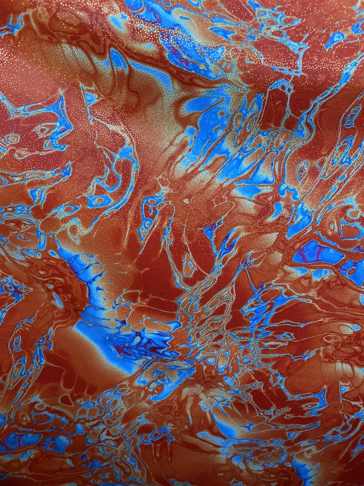 Abstract Design Print In Nylon Spandex With Metallic Foil 4-way Stretch 58/60” Sold by the YD. Ships worldwide from Los Angeles California USA. Condition is New. Shipped with USPS First Class Package. Content: 80% Nylon; 20% Spandex Care: Washable in cold water and flat dry