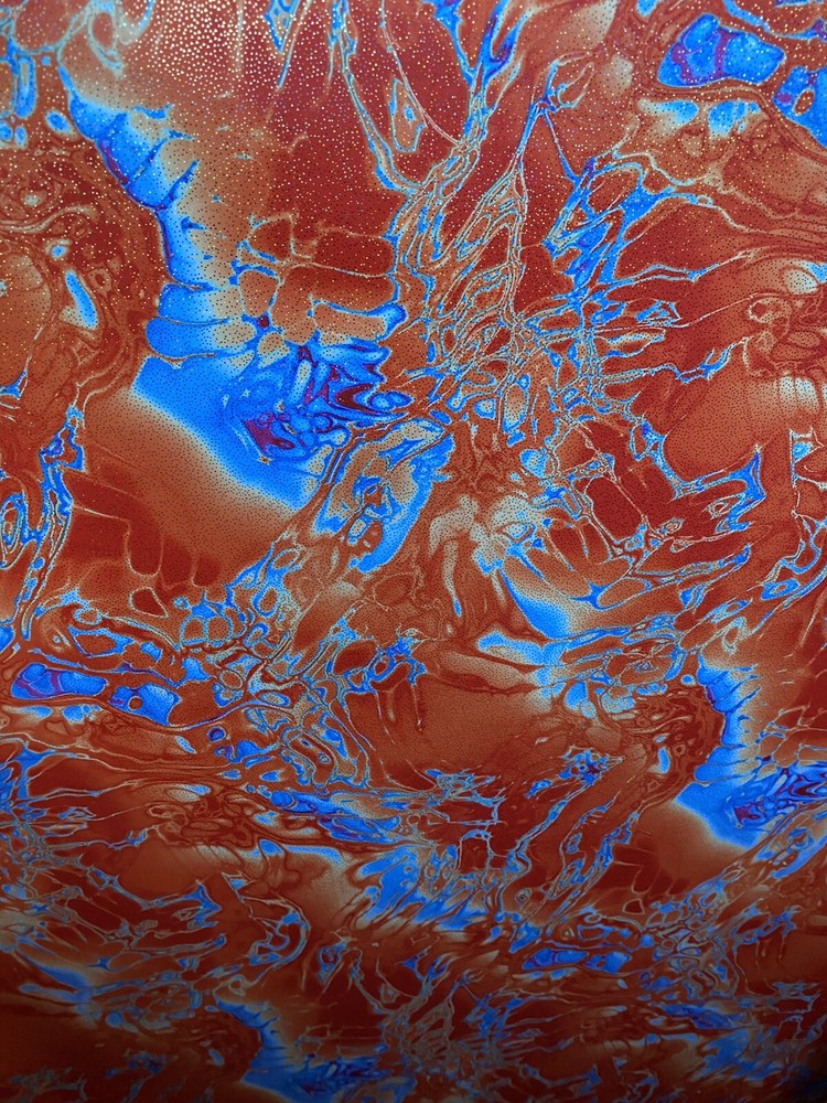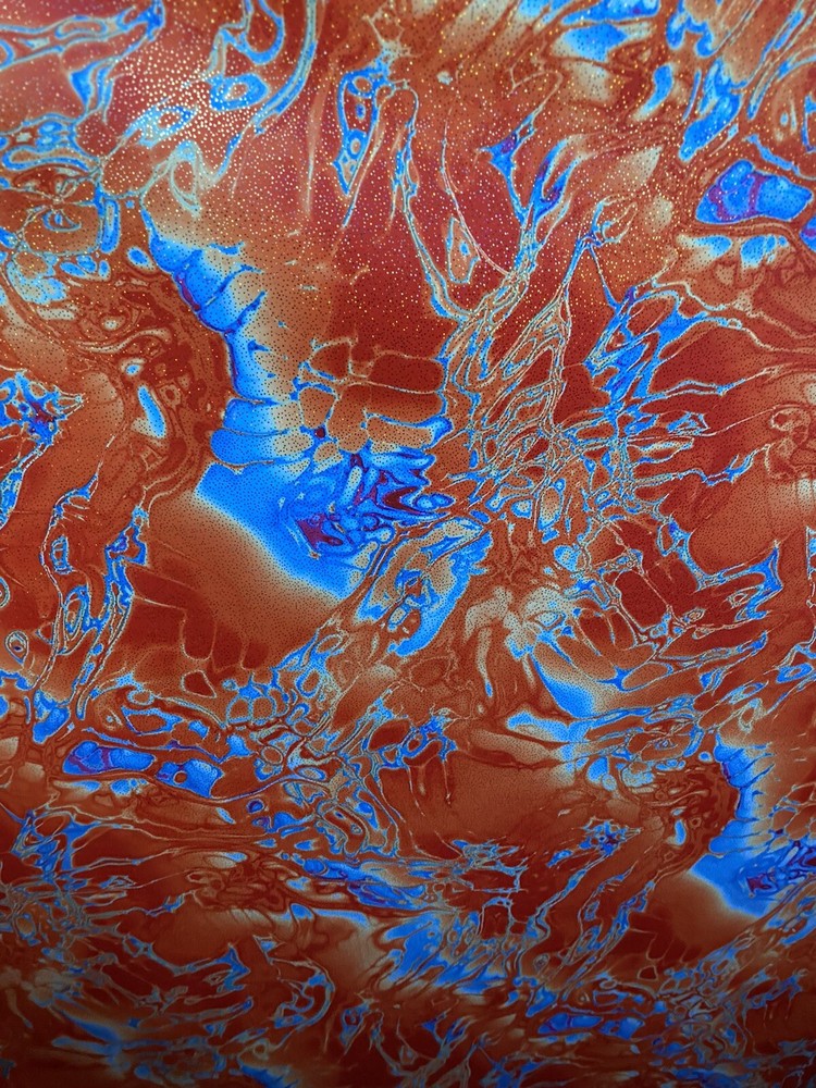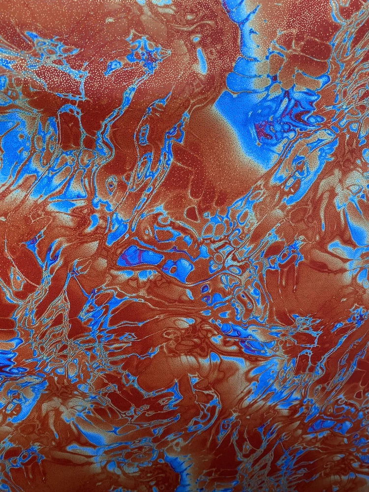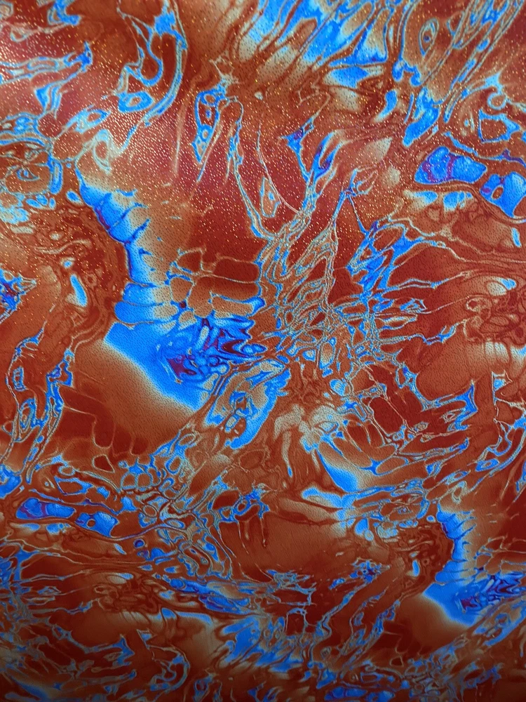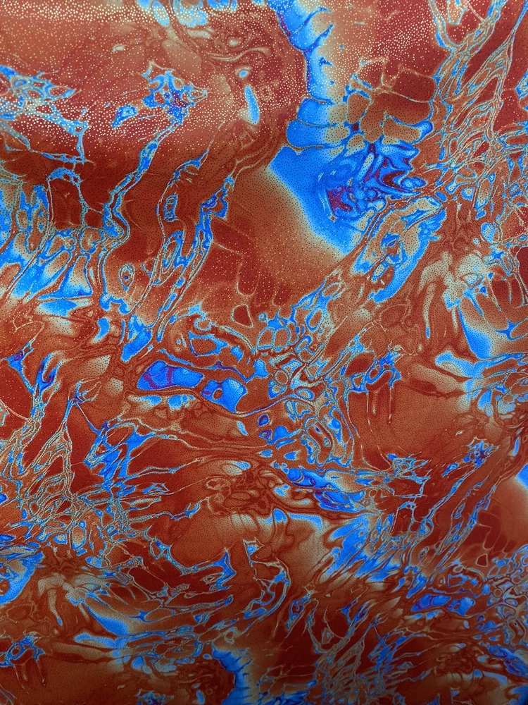 Abstract Design Print In Nylon Spandex With Metallic Foil 4-way Stretch 58/60” Sold by the YD. Ships worldwide from Los Angeles California USA. Condition is New. Shipped with USPS First Class Package. Content: 80% Nylon; 20% Spandex Care: Washable in cold water and flat dry