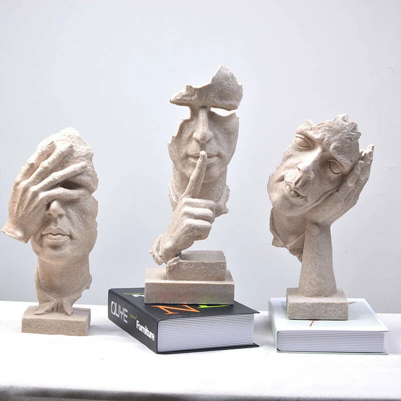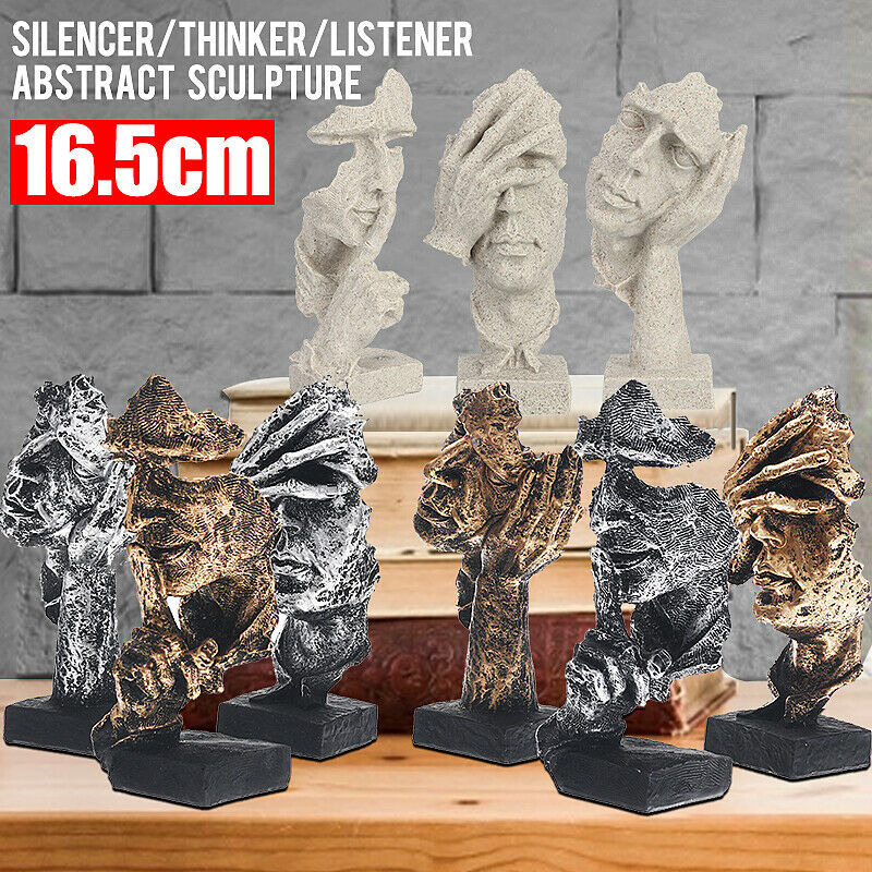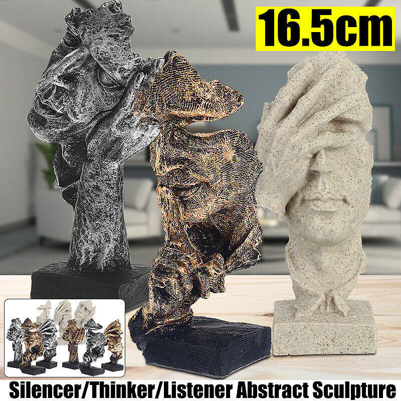 Package included: 1 x Simple Abstract Sculpture Specifications: Product name: Home Bed Room Nordic Simple Abstract Sculpture Figurine Ornaments Silence Is Gold Office Home Decoration Accessories Modern Art Resin Decoration Craft Material: Resin Type: Silencer/thinker/listener (optional) Color: Gold/Silver/Rock sand (o ptional) Height: approx.16.5cm