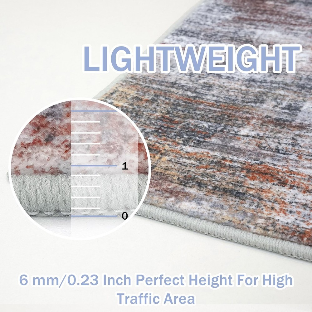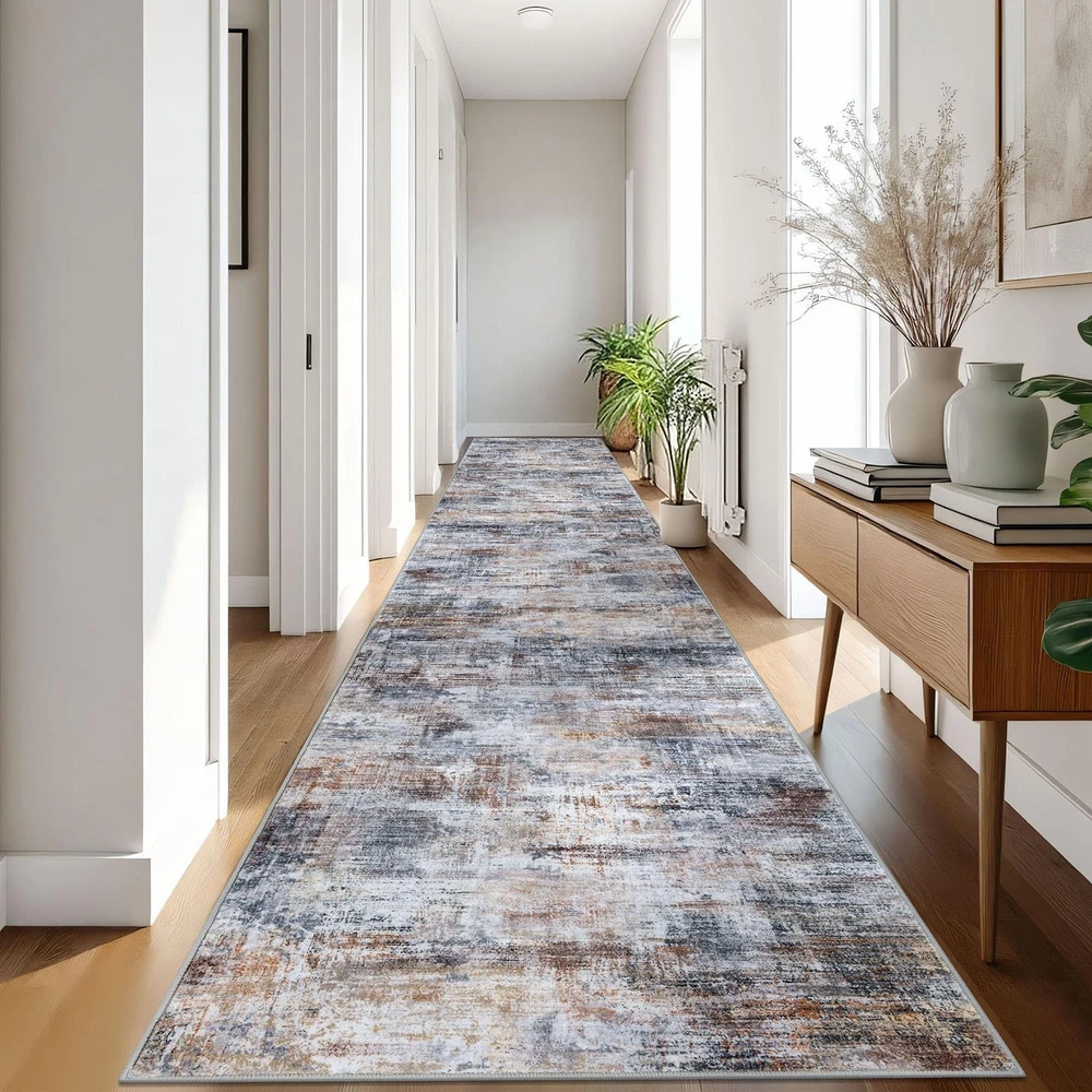 Elevate your living space with the stunning allure of Abstract Rugs. Designed for the modern home, this 3x10 runner rug masterpiece seamlessly blends functionality with a jaw-dropping abstract pattern, making every corner of your room a visualretreat. Let's dive into the world where fashion meets comfort, and design meets durability—all wrapped up in one exquisite floor runner! Starting with its eye-catching design, this kitchen rug runner features an enigmatic blend of navy hues, capturing the essence of modern abstract art. It’s not just a runner rug for entryway indoor; it’s a statement piece that speaks to the soul, enhancing the ambiance of your room and sparking conversations. Perfect for any setting, from your chic entryway to the cozy nook by your kitchen, hall, bedroom, this hall runner rug promises to infuse a burst of creativity wherever placed. Safety is paramount, and with this rubber backed runner rugs, rest assured that elegance comes with high-end functionality. Equipped with a non slip backing, this non slip runner rug stays securely in place, providing a safe, slip-free area even in high traffic zones of your home. Whether it’s playful pets or running kids, our rug handles it all with grace. Experience luxury under your feet! Made from premium synthetic fibers, our entryway runner rug offers a soft, plush sensation that makes stepping on it a pure joy. With a practical pile height of 0.3 inches, it’s designed to fit seamlessly under doors and furniture, enhancing your space without inconvenience. Caring for your indoor outdoor runner is as easy as it gets. Machine washable and built to last, this rug not only resists fading but also holds its captivating charm wash after wash. It's the perfect blend of durability and effortless style—just toss it in the wash and it’s good as new, ready to stun all over again. Key Attribute: Style: Printed Abstract Modern; Thickness: 0.35 in.; Color: Orange/Grey/Brown. Note: The digital images of the rug on our website are as accurate as possible. Due to differences in computer monitors, the rug colors may vary slightly Notice the Fold: The rug is folded for cost-effective shipping, which may cause creases. To remove them, lay the rug flat, weigh down creased areas, use a steam iron on low with a damp cloth, or roll the rug in the opposite direction Machine Washable: This hallway runner is machine washable for easy maintenance, keeping it fresh and vibrant without the need for manual cleaning. Noted: When vacuuming, use a low setting or a robotic vacuum to prevent shifting or bunching Non-Slip Rubber Backing: Designed with a non-skid TPR backing, this 3' x 18' entryway runner stays securely in place, eliminating the need for an extra rug pad. Ideal for families with children and pets, it remains steady even in high-traffic areas Ultra Soft Touch: This kitchen runner rug is made from plush synthetic fibers, offers a dense, cloud-like surface that cushions feet and shields toes from cold floors. Durable, non-shedding, fade-resistant, and odorless, it's ideal for high-traffic areas Modern Abstract Printed Design: Transform your home with the modern abstract rug, a perfect blend of art and functionality. Printed with a modern abstract pattern, Its dynamic splashes of orange, brown, and gray hues add a vibrant touch to any room