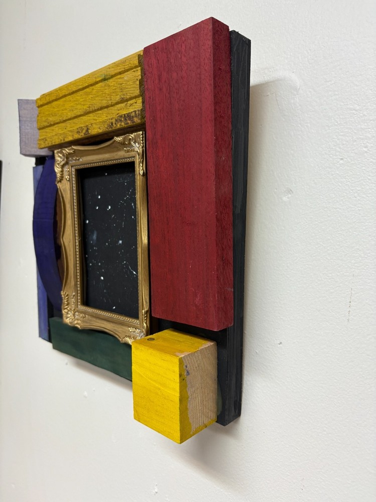 The product is a small abstract wall sculpture made of wood, featuring a night sky theme with a star. The sculpture is painted and carved in a relief style, with a height of 14 inches. This art piece falls under the category of Art Sculptures and is priced under $500.