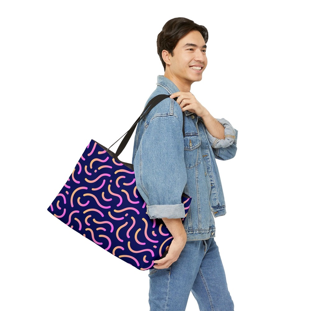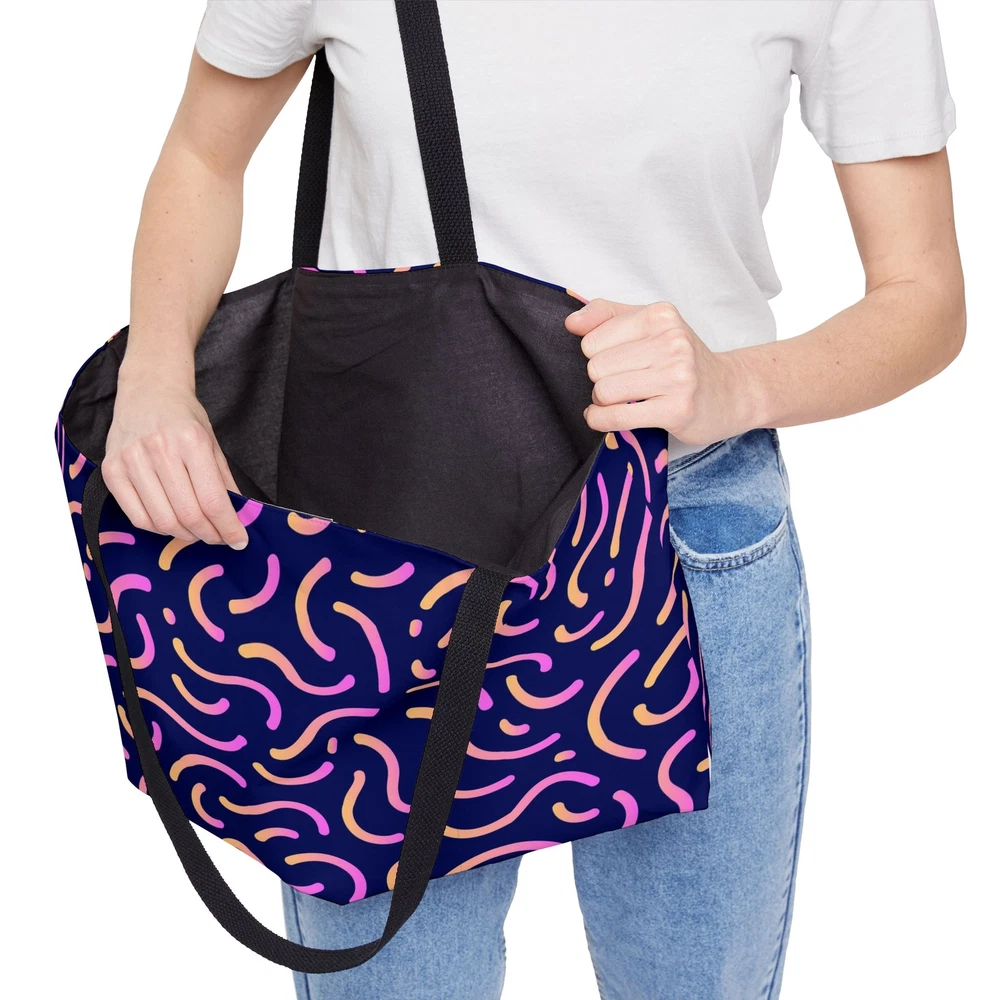 Love this tote! The purple abstract print is so vibrant, and it holds way more than I expected. Perfect for trips, gym, or shopping—super sturdy, comfy handles, and the black lining keeps everything looking neat. Definitely worth it!