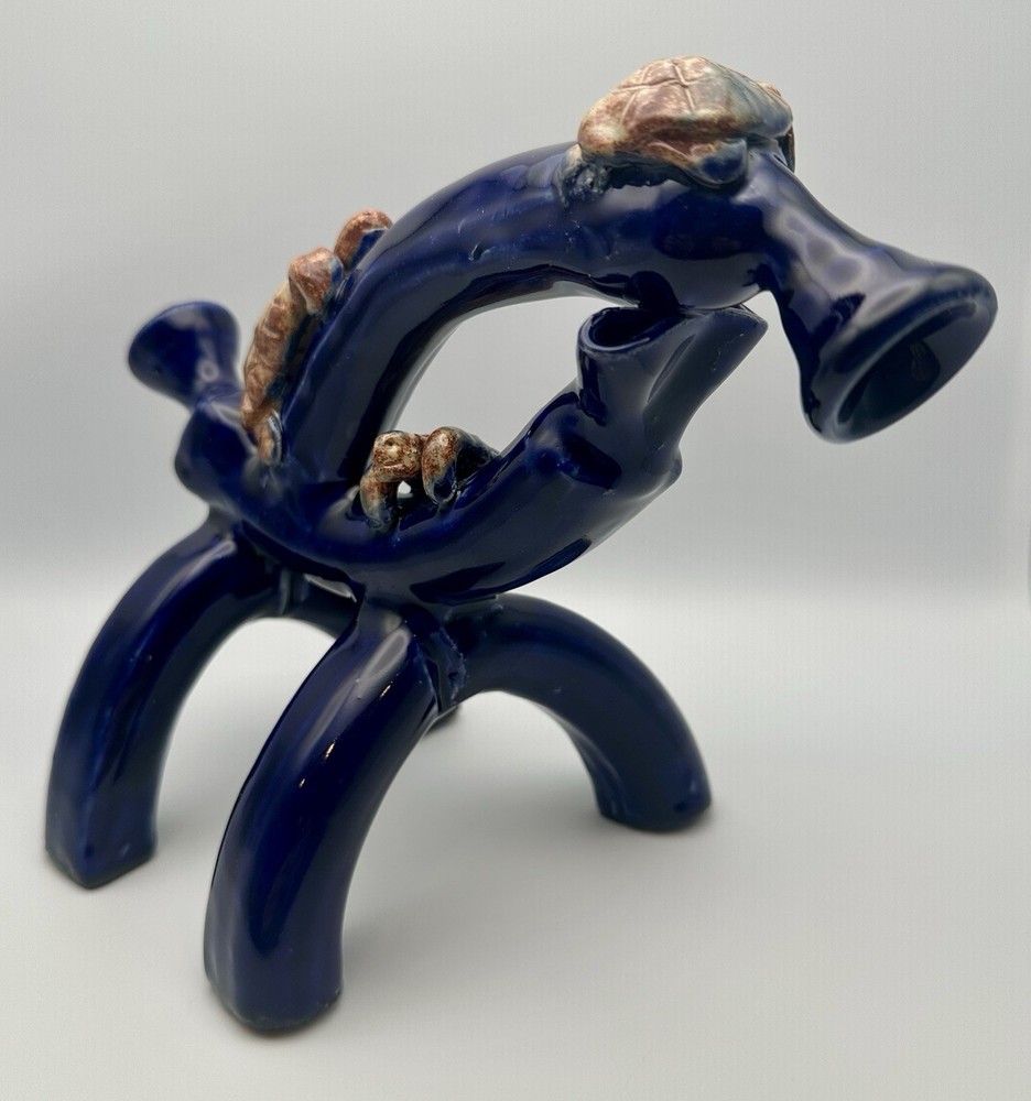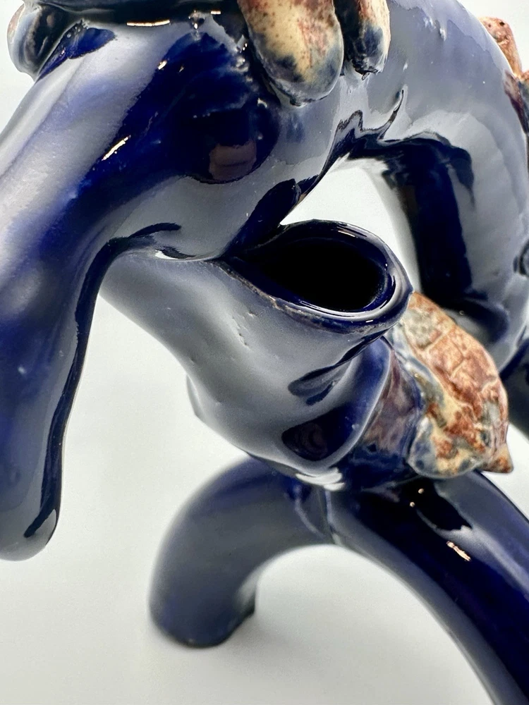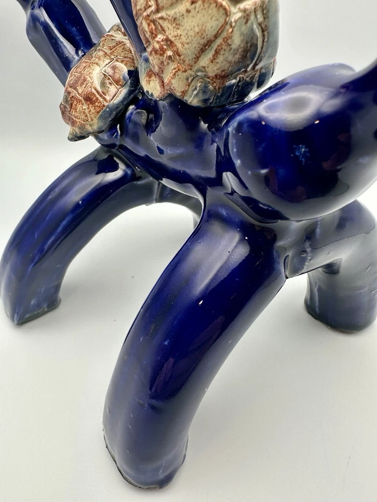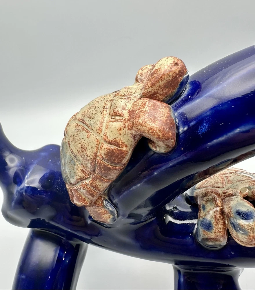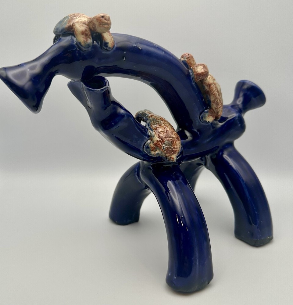 A very interesting piece! Appears to me to be an abstract seahorse with three sea turtle friends catching a ride. Definitely handmade glazed clay. Brilliant cobalt blue color. Bought at an estate sale, I cannot seem to find anything on the manufacturer/artist online. Not marked with any identification. No chips or breaks and in perfect shape.