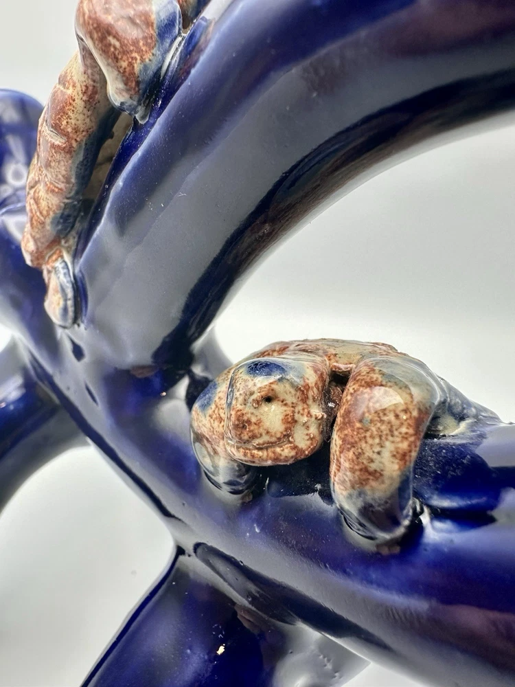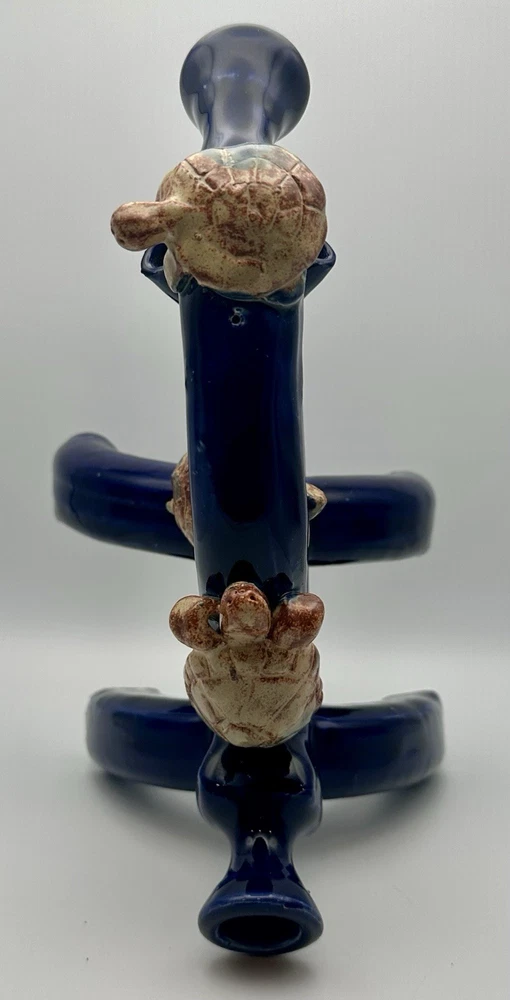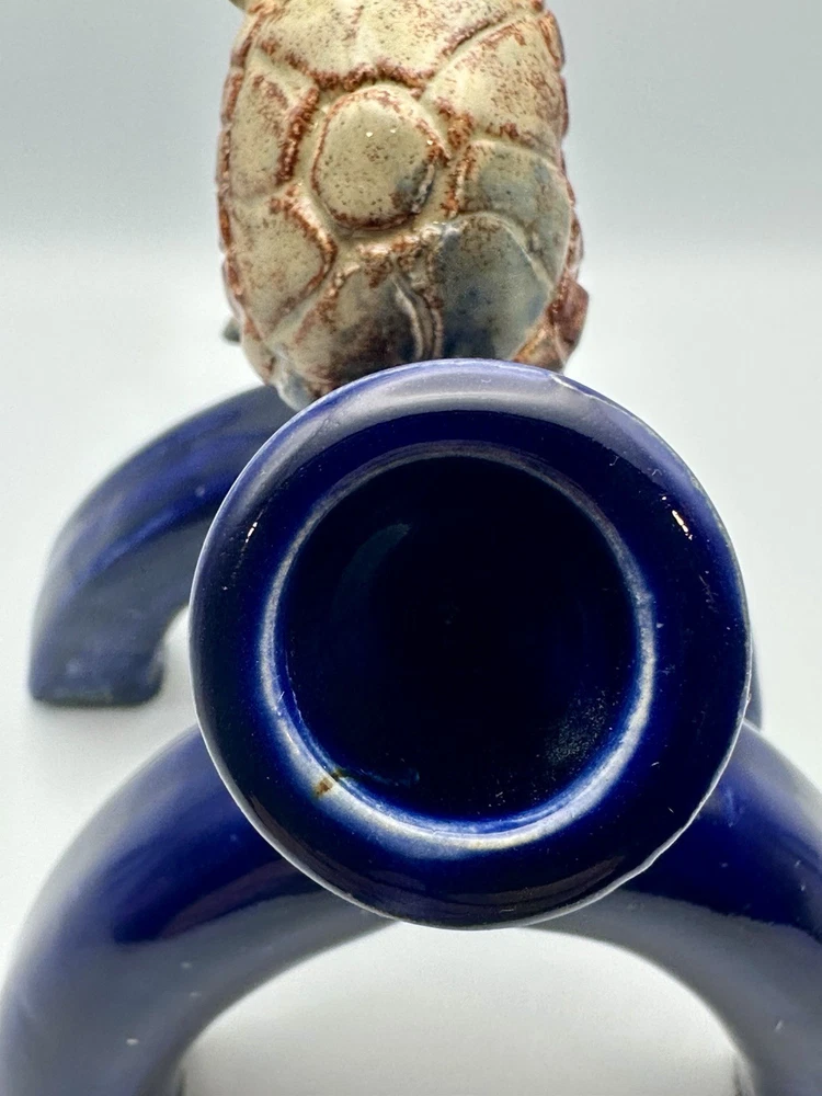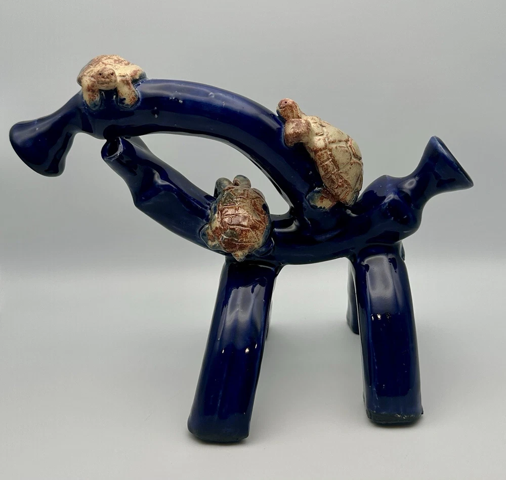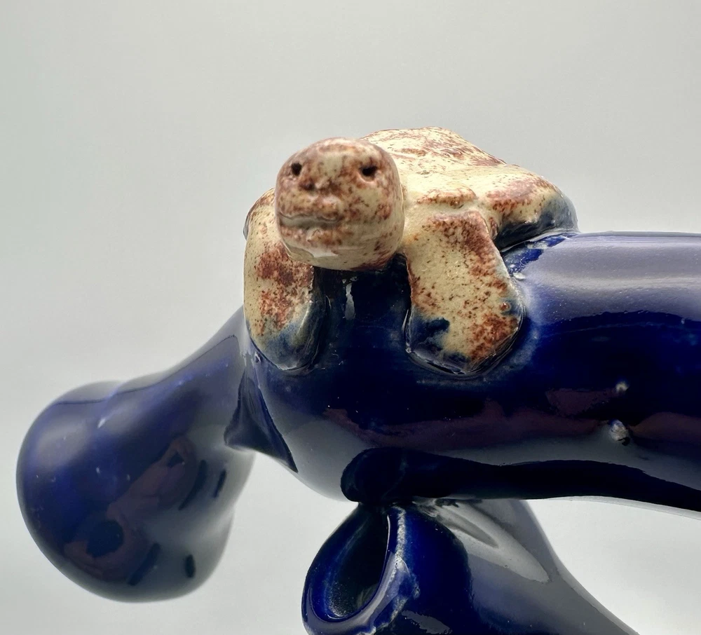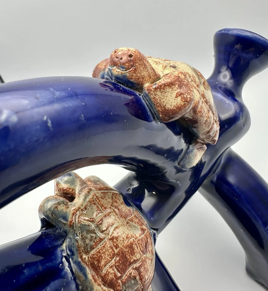 A very interesting piece! Appears to me to be an abstract seahorse with three sea turtle friends catching a ride. Definitely handmade glazed clay. Brilliant cobalt blue color. Bought at an estate sale, I cannot seem to find anything on the manufacturer/artist online. Not marked with any identification. No chips or breaks and in perfect shape.