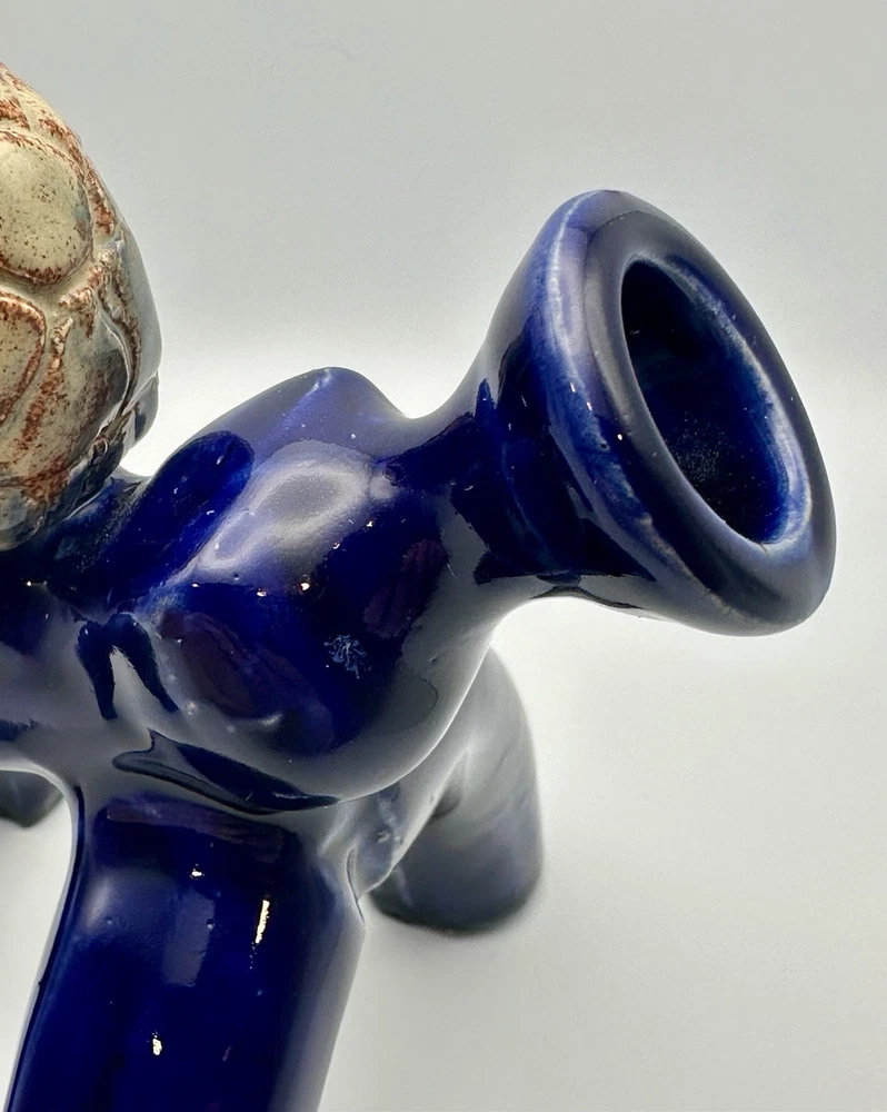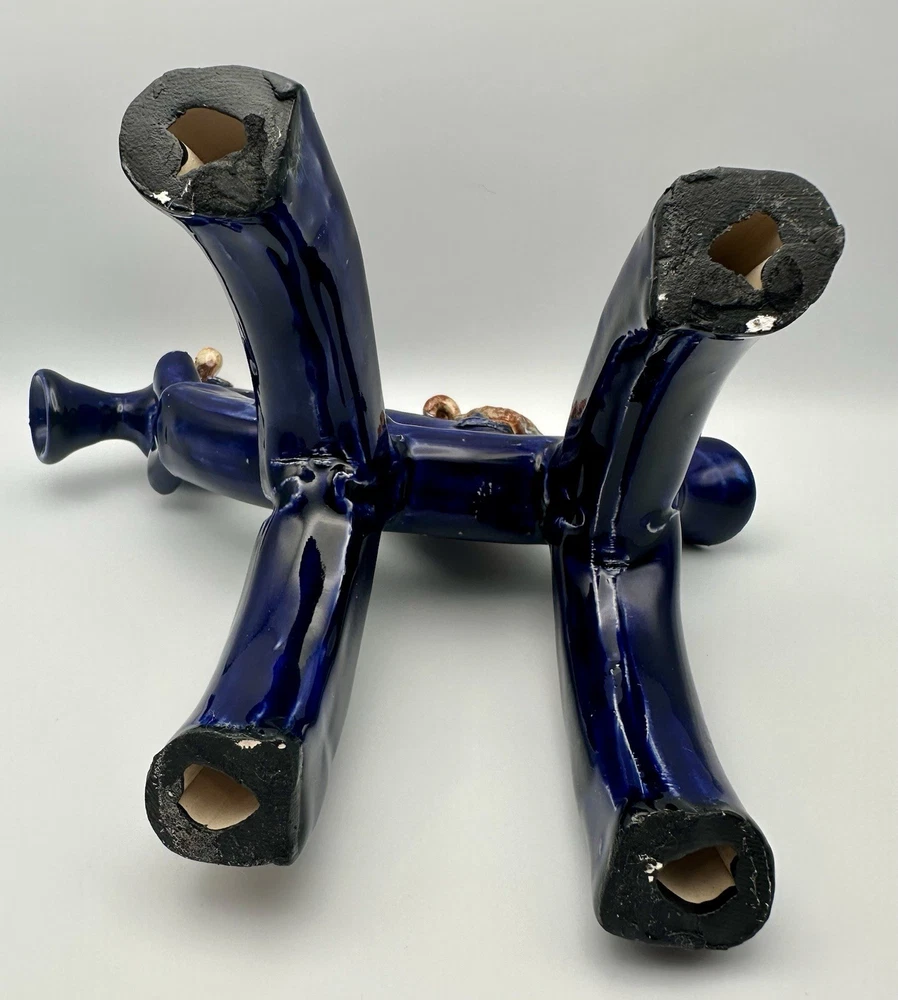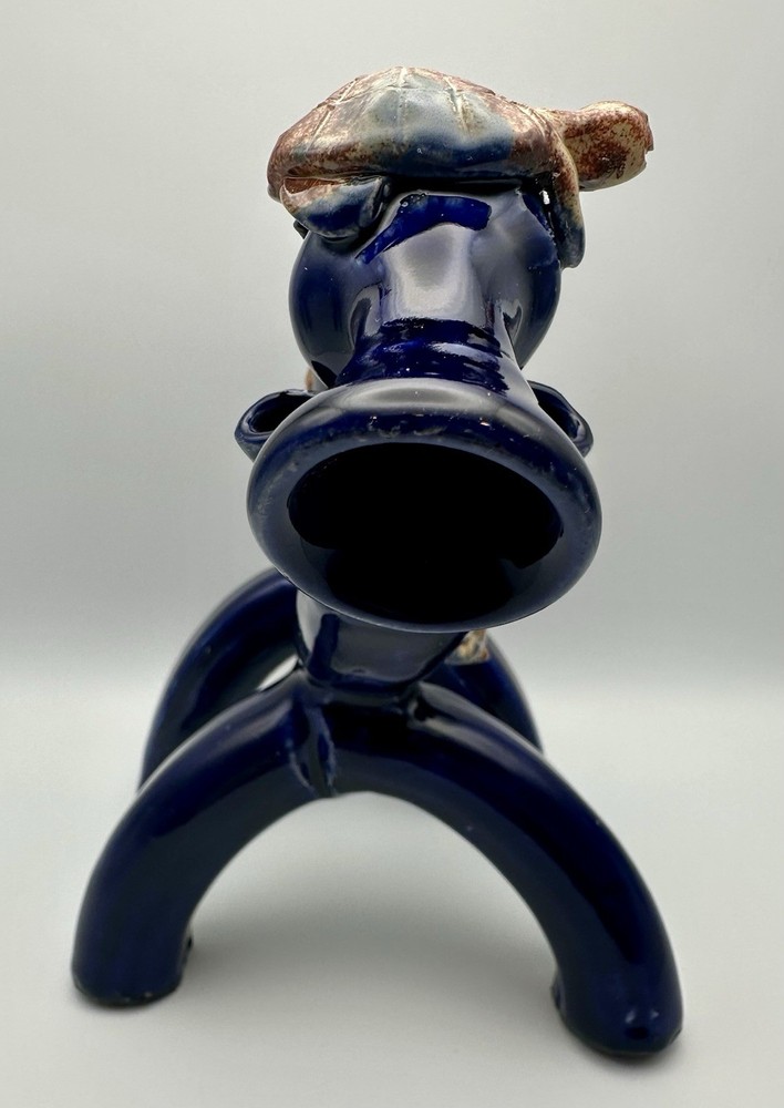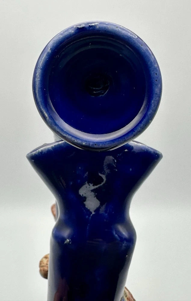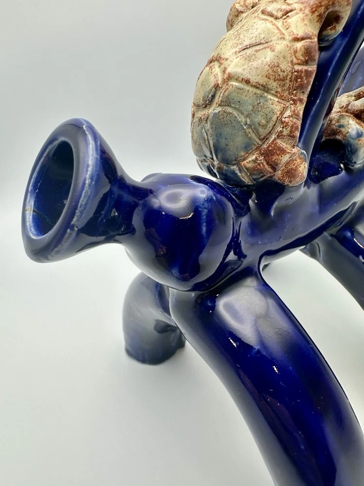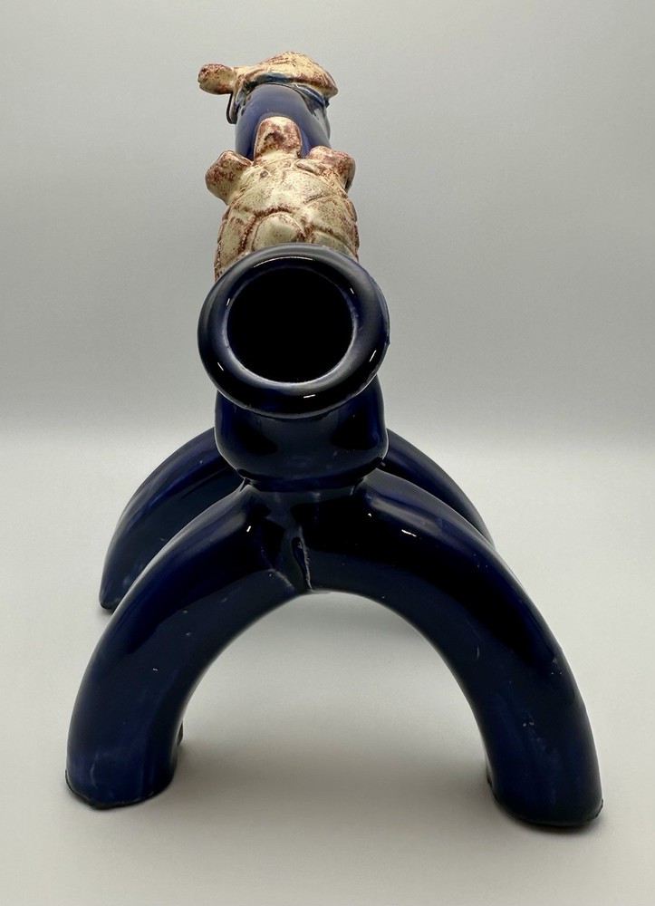 A very interesting piece! Appears to me to be an abstract seahorse with three sea turtle friends catching a ride. Definitely handmade glazed clay. Brilliant cobalt blue color. Bought at an estate sale, I cannot seem to find anything on the manufacturer/artist online. Not marked with any identification. No chips or breaks and in perfect shape.