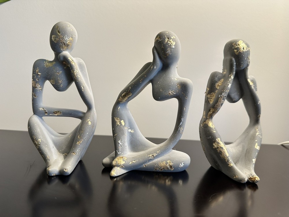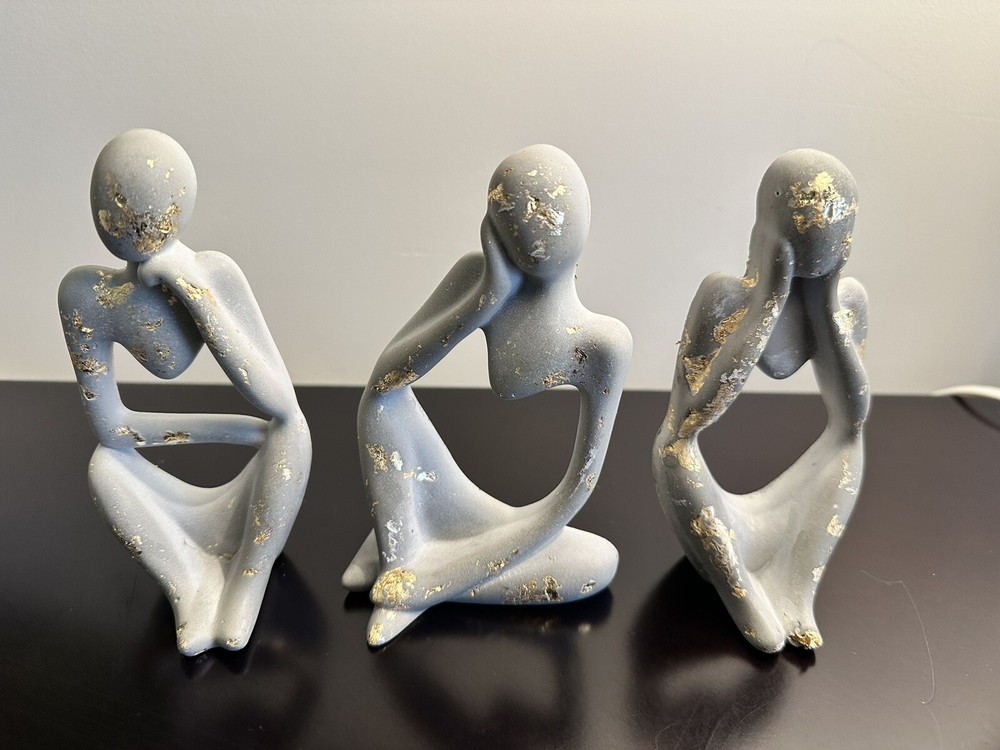 Add a touch of contemporary art to your home decor with this set of three Abstract Thinkers Sculptures. Crafted from high-quality cement, these sculptures feature a modern style with a light gray finish and golden accents that will complement any room in your house. Measuring 5 inches in height, these small sculptures are perfect for displaying on a bookshelf, coffee table, or mantlepiece. The human subject and abstract design of these sculptures make them a great conversation starter as well. Ideal for art enthusiasts and collectors, this set of sculptures will add an artistic touch to your home.