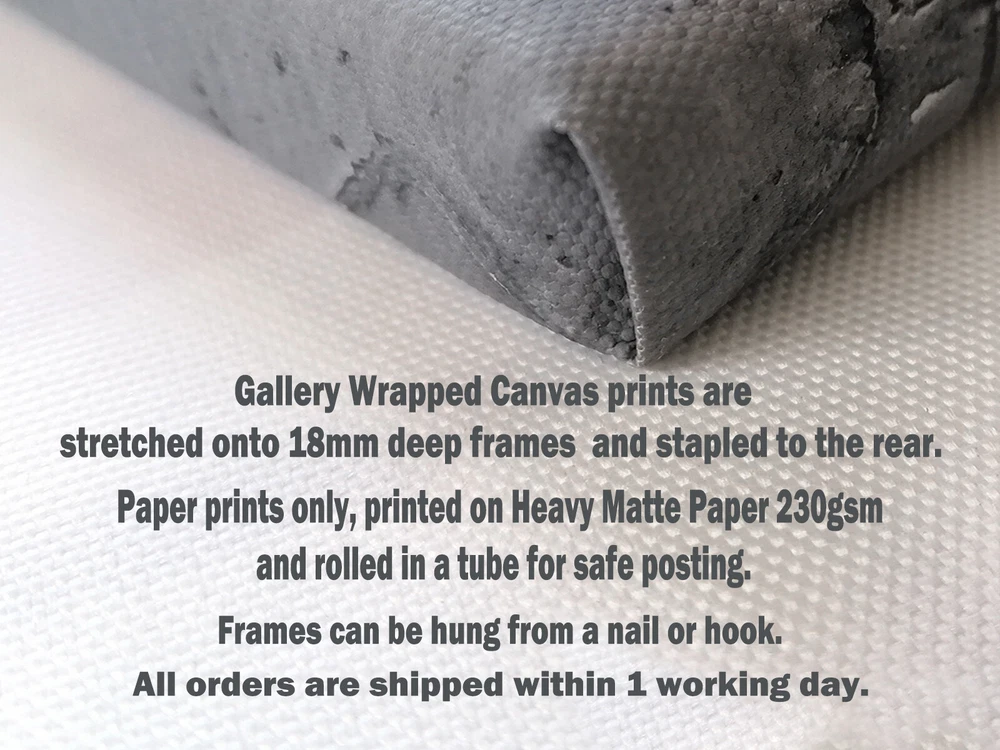 Solid Wood Frames (frame's thickness 0,7 inch or 1,8 mm) Production Polyester Canvas 260gsm Premium Semigloss Photo Paper 170gsm All items are packaged using strong poster tubes and packaging materials in order to mitigate any potential damage as the poster makes its journey Printed with high resolution fade resistant inks Printer: Epson stylus pro 7900