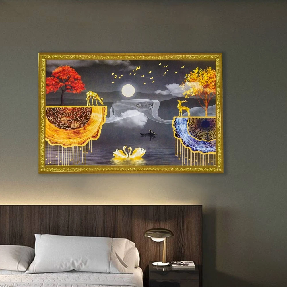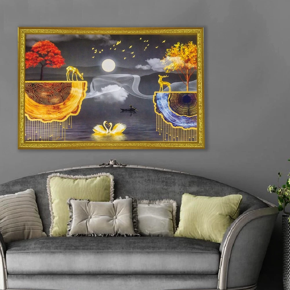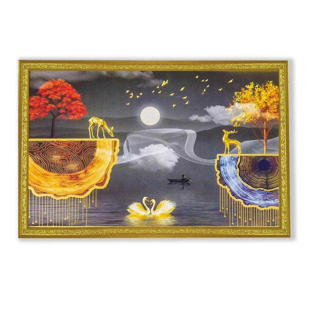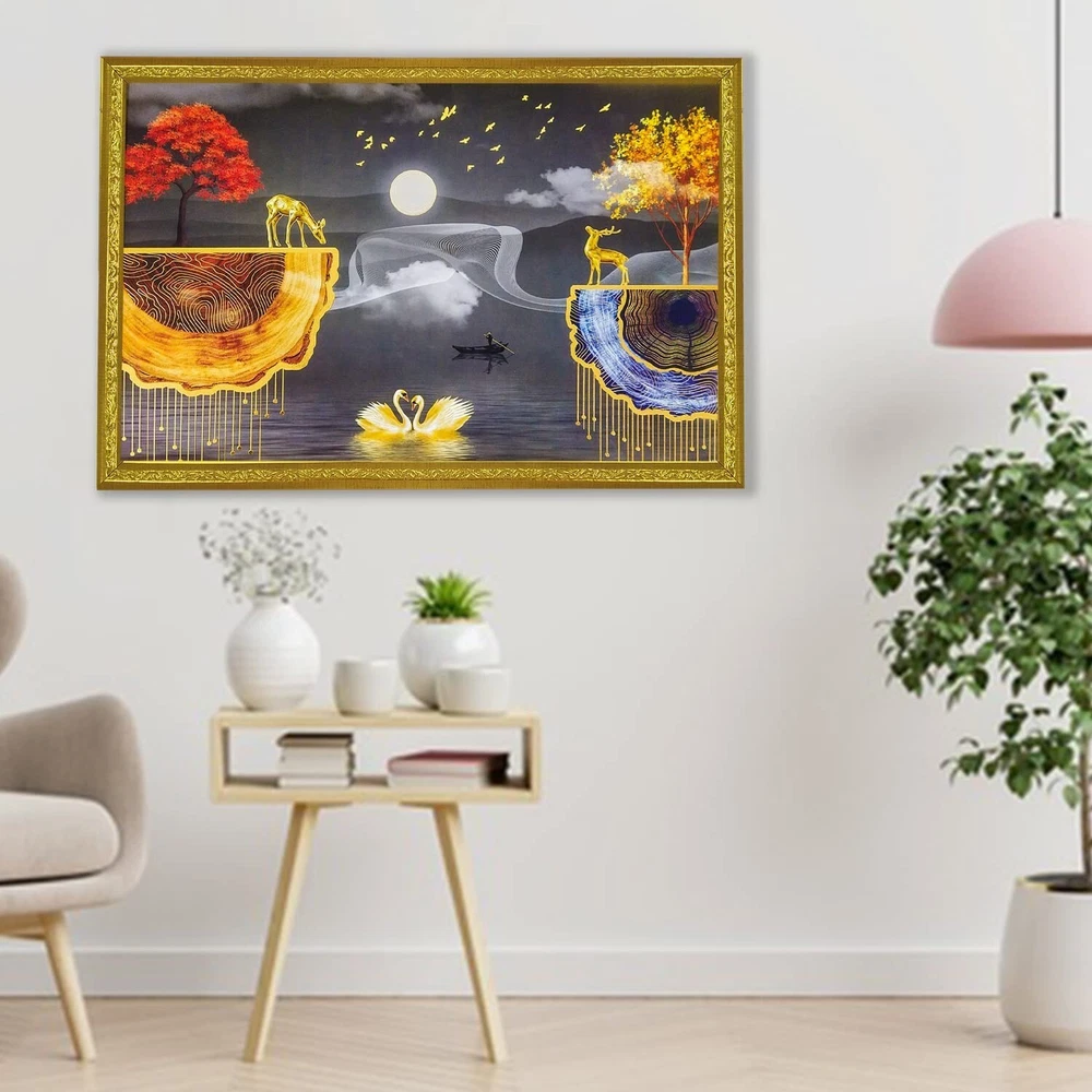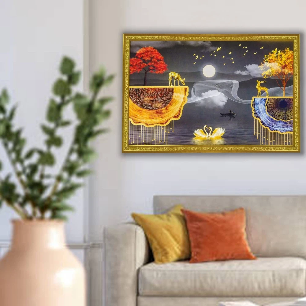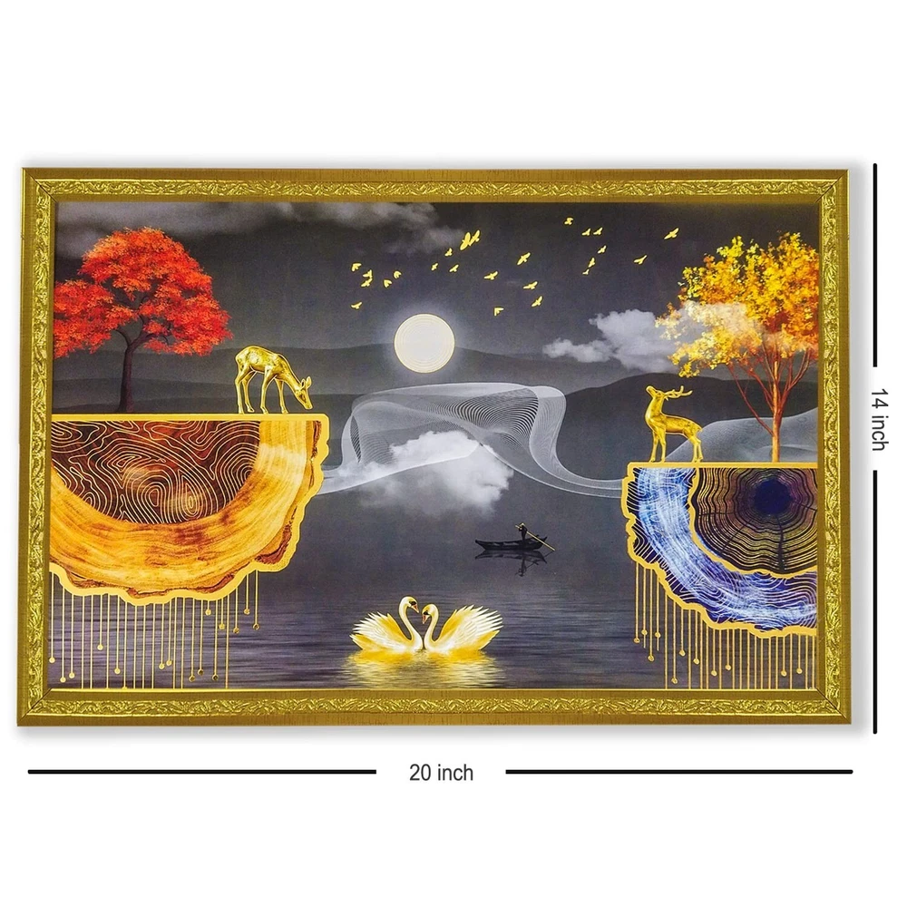 "Abstract art Framed Golden Foil 3D Style Landscape Poster with 2 Deer Standing " Perfect Size:-12 inches x 18 inches Package contains : UV Textured Modern art Print Painting without glass Ready to Hang: Hang anywhere with pre attached hanging clip Usage : It can be used for Living room, Bedroom, Hall, Dining Room, Home décor and for gifting purposes. High Quality Material : It comes with Best in class MDF Board. Greetings from Tribal Vintage, your go-to destination for unique antiques, vintage, and new items. We take pride in offering a wide selection of products, meticulously curated to meet your needs and exceed your expectations. Please note that if any taxes are applicable in the buyer's country, the Buyer must pay all such taxes as per law. If you wish to return an item, please contact us within 48 hours of receiving it so that we can process your return for a refund or exchange. The product must be returned within 30 days of receipt, should not be altered, or tampered with, and should be in its original packaging. We offer a variety of safe and secure payment methods, including credit cards, debit cards, PayPal, Apple Pay, and Google Pay . If you have any questions or specific requirements, we would be more than happy to help you. We also offer discounts on multiple purchases, so feel free to take advantage of these offers. We welcome wholesale inquiries and appreciate your feedback, which is important to us. Happy buying from Tribal Vintage!