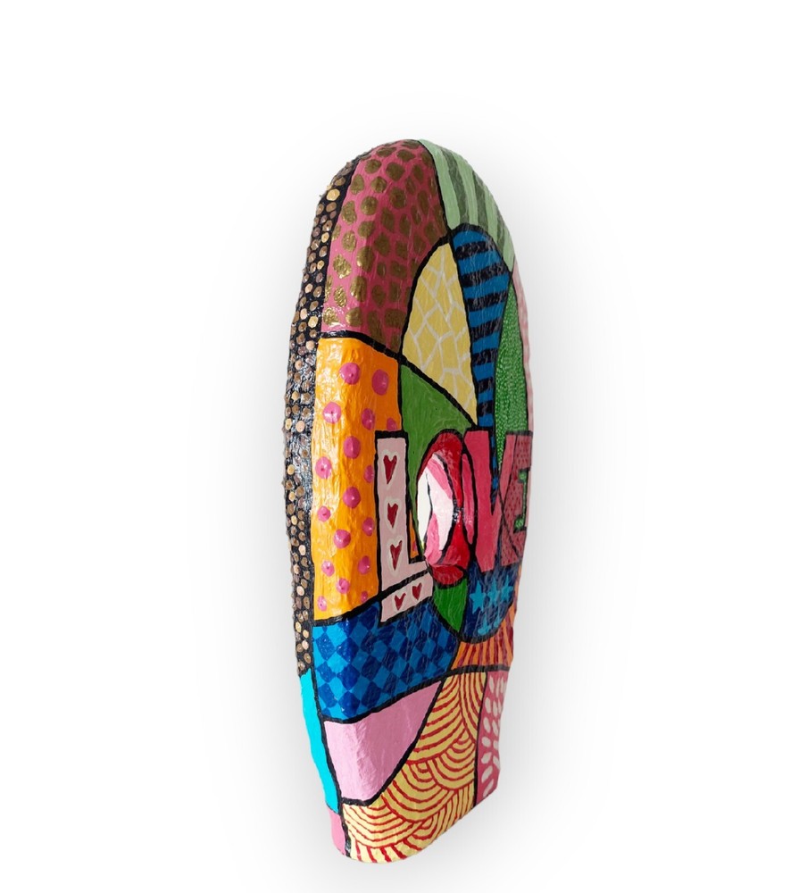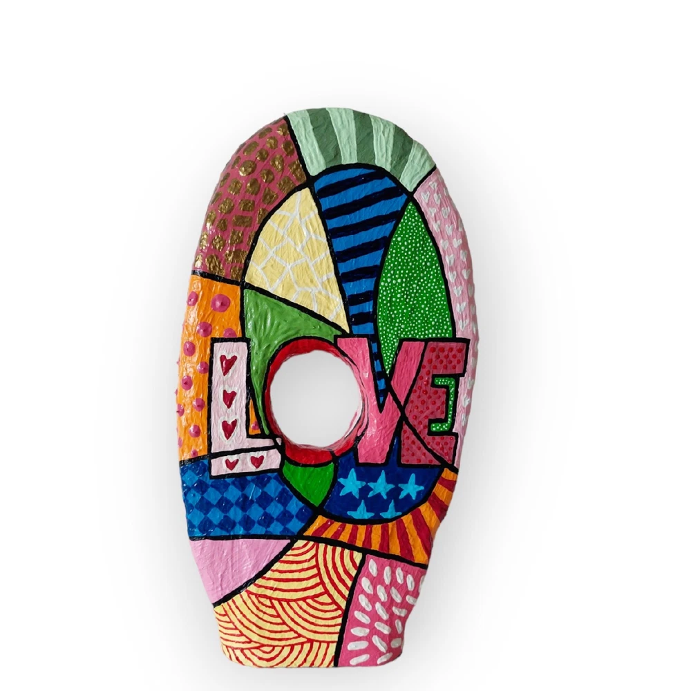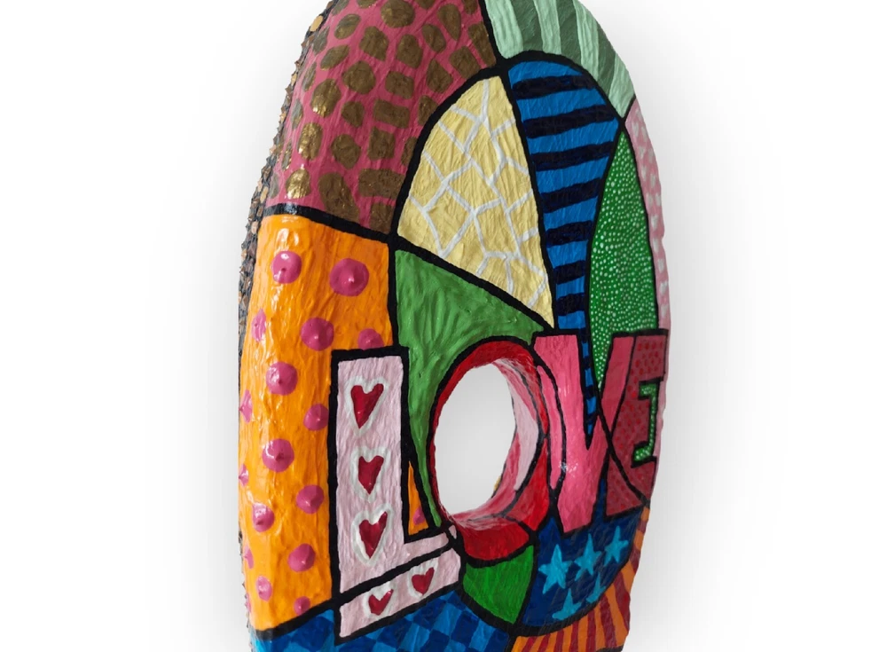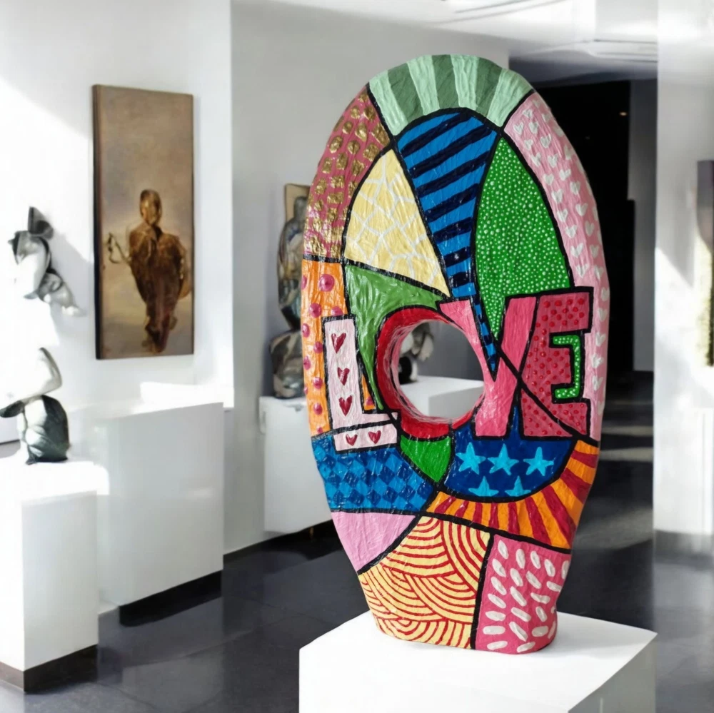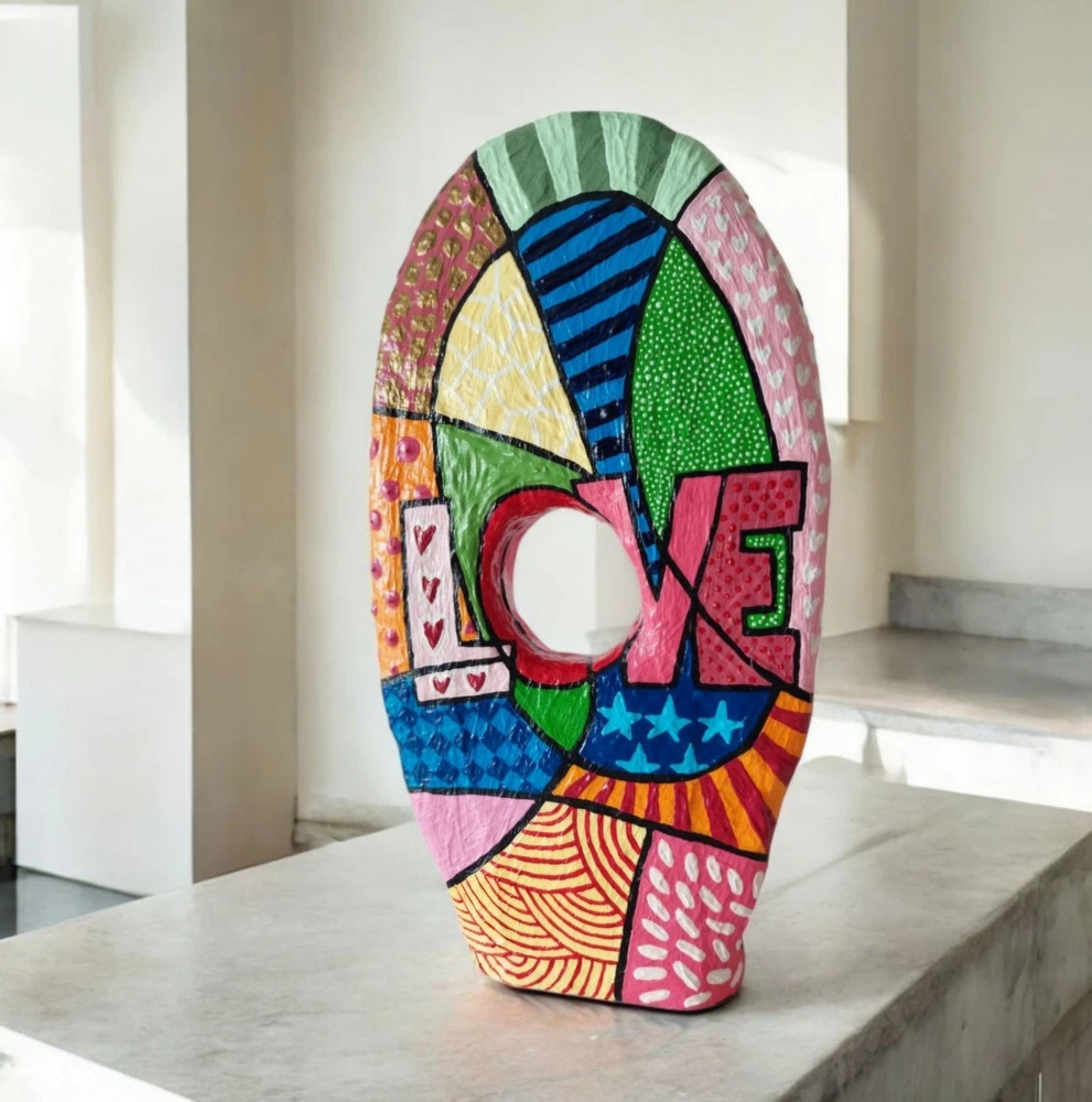 ➤Handgefertigte Unikate: Meine Skulpturen sind aus Draht, Gips, Papier, Gelmedium und Acrylfarbe gefertigt. Habe Skulpturen im Pop Art Stil oder auch abstrakte Figuren im Sortiment. ➤Geschichte/Informationen zur Skulptur: Skulptur ist auf zwei Seiten bunt bemalt im Pop Art Stil. Eine Seite mit einem Frauengesicht. Die Frau trägt eine Sonnenbrille und hat braune Haare. Auf der anderen Seite mit einem großen Schriftzug Love. Darum im Pop Art Stil bemalt. Gesamtmaße: 18 x 34 x 4 cm (B x H x T). ➤Hinweise: "Angegebene Preise sind Gesamtpreise. Kein Ausweis der Umsatzsteuer (Kleinunternehmer)." Meine Skulpturen sind ja im Inneren aus Draht und daher auch nach Fertigstellung leicht biegsam. Man darf daher gerne behutsam damit umgehen und für die Deko Skulptur gerne einen schönen Platz im Wohnzimmer, Hobbyraum o. ä. finden und die Figur dort einfach stehen lassen. Es handelt sich um eine Skulptur für den Innenraum. Bitte die Skulptur nicht in feuchte Räume (wie zum Beispiel Badezimmer) stellen. Meine Arbeiten unterliegen dem Urheberrecht und dürfen ohne schriftliche Genehmigung von mir weder verändert, ausgestellt, kopiert oder reproduziert werden. ➤Geschenkideen: Die Figur in Bewegung kann als Geschenk für einen Kollege / Kollegin sein. Oder als Mitbringsel zum Geburtstag. Als witziges oder originelles Geschenk einfach so. Als Geschenk für den Freund die Freundin. Als besonderes lustiges Präsent als Ostergeschenk gedacht sein. ➤Personalisieren: Gerne kann ich auf Wunsch eine Skulptur auch Personalisieren um ein ganz besonderes Geschenk daraus werden zu lassen. ➤Zeitgenössische abstrakte Skulpturen, Figuren, Statuen als Dekoration: Moderne, filigrane, elegante, puristische Plastiken für Kanzleien, Praxen, Hotels, für das Büro, das Schlafzimmer, das Wohnzimmer, die Wohnwand, das Sideboard, das Ablageboard, Flure, den Schreibtisch und Eingangsbereiche geeignet.