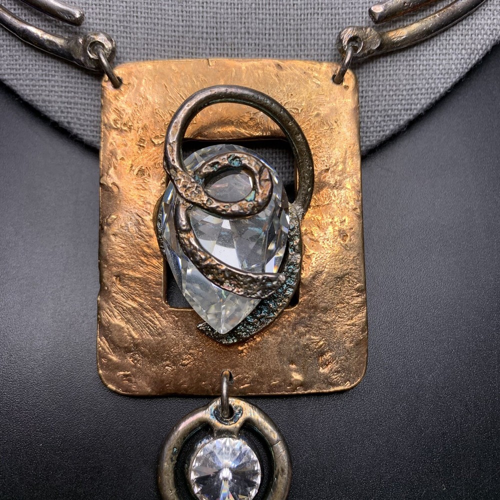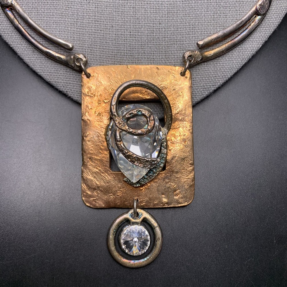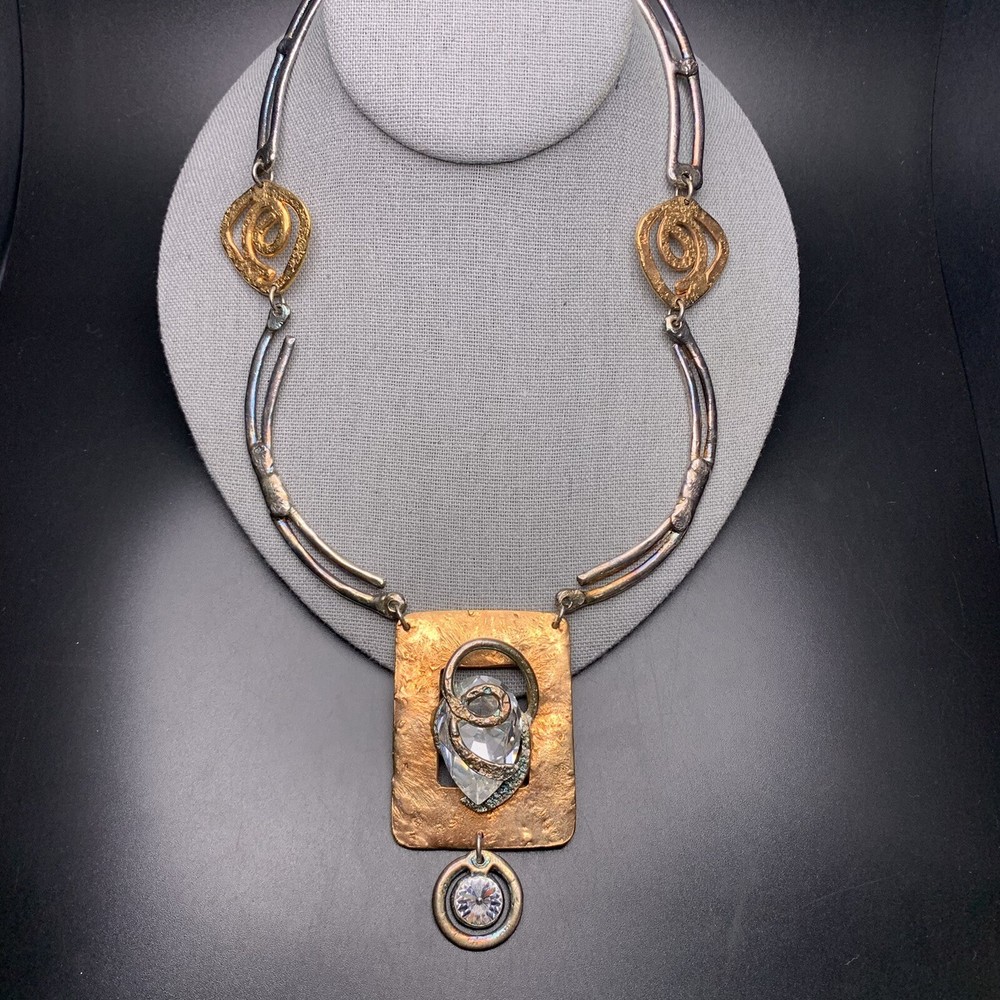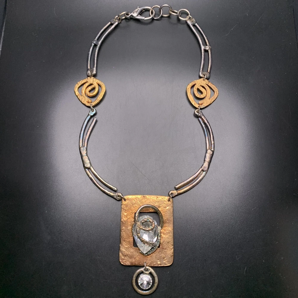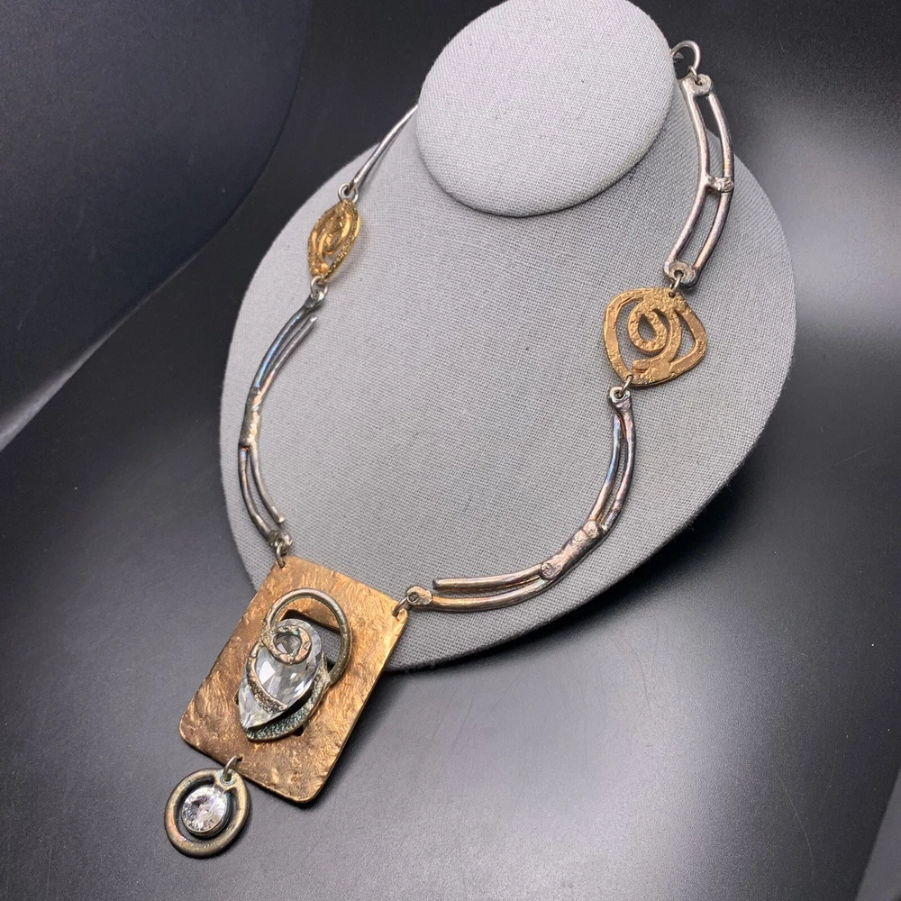 Two-tone with clear glass stone bold statement necklace; Approx 18" up to 19" long; has a paisley maker's mark (unsure what maker this is)
