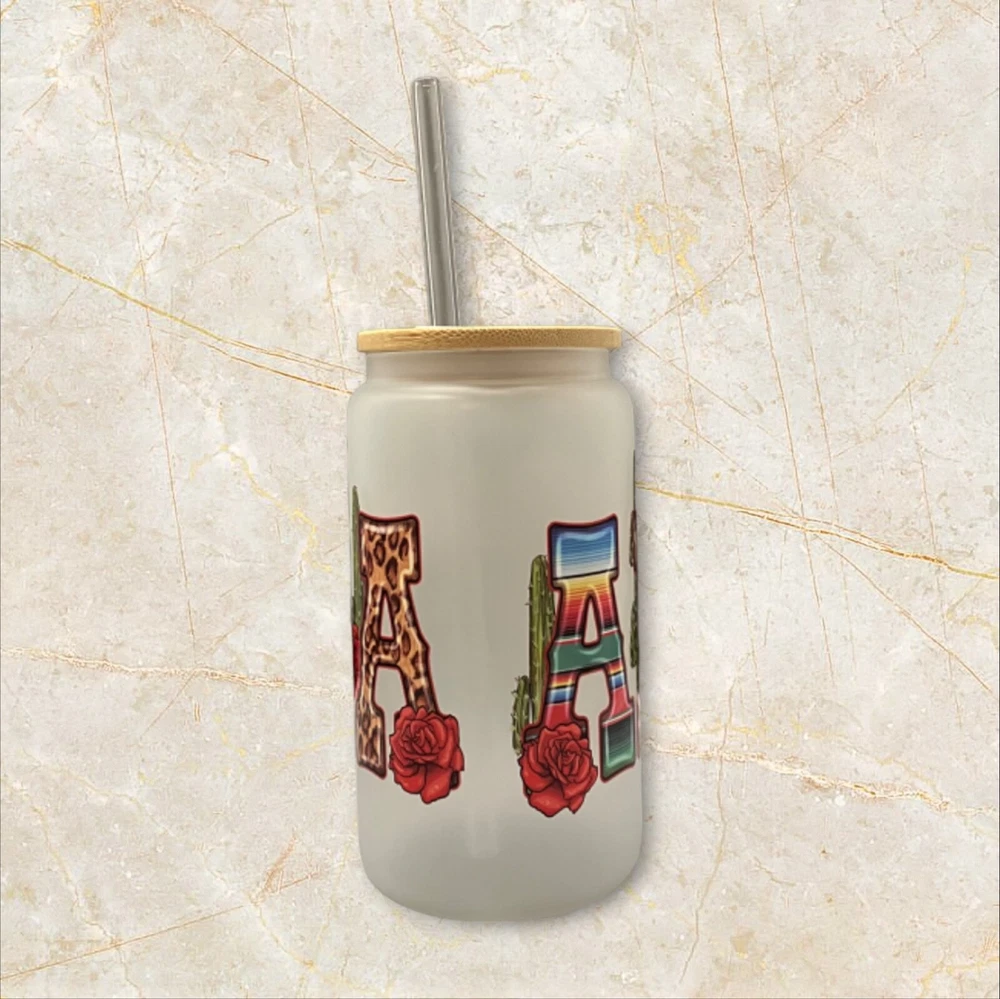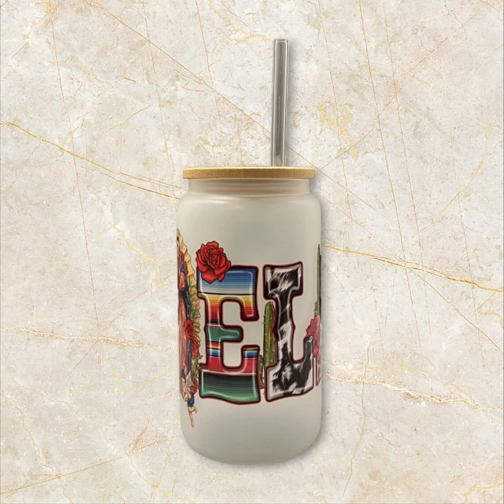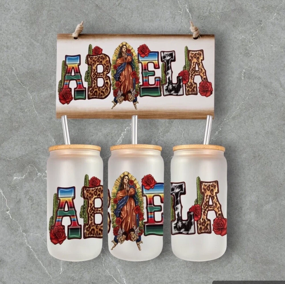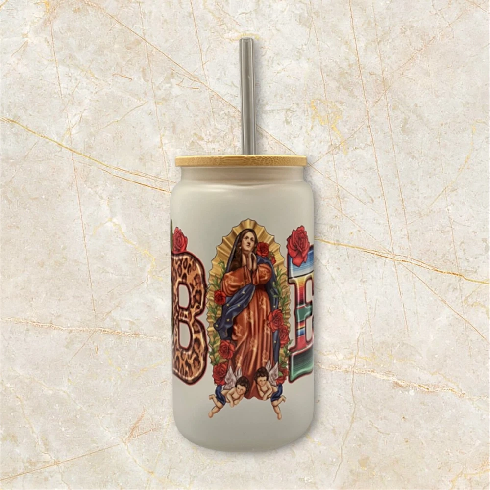 Enjoy your favorite drinks with this 16 oz Abuela glass can. The can-shaped glass is decorated with a UV DTF wrap featuring the Virgin Mary and comes with a bamboo lid and reusable straw. Perfect for all occasions, this modern-style glass can is ideal for teens, boys, girls, and adults. Hand wash only and care instructions are included. The set includes a lid, glass can, and straw. This Libbey-style glass can is straight in shape, with a round design, and has a capacity of 16 oz. The glass can is assembled in the USA and is made of high-quality glass material.