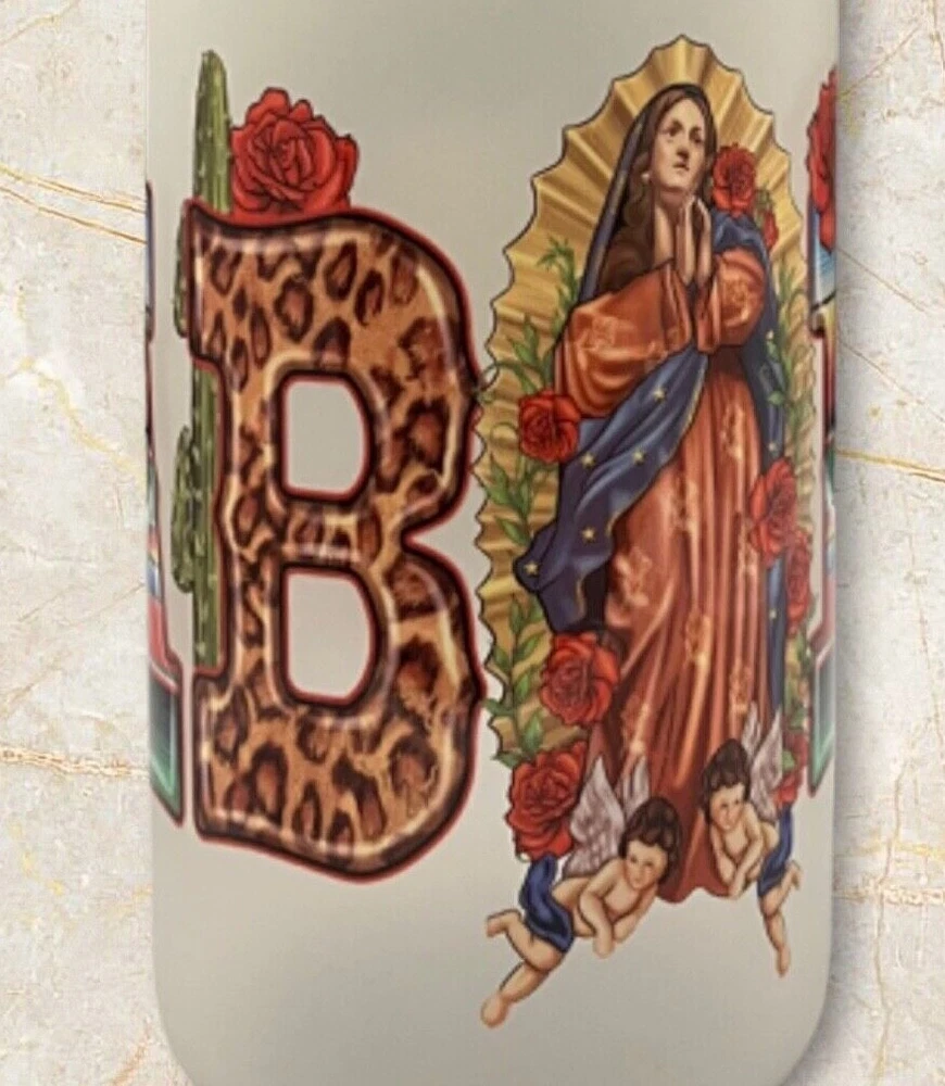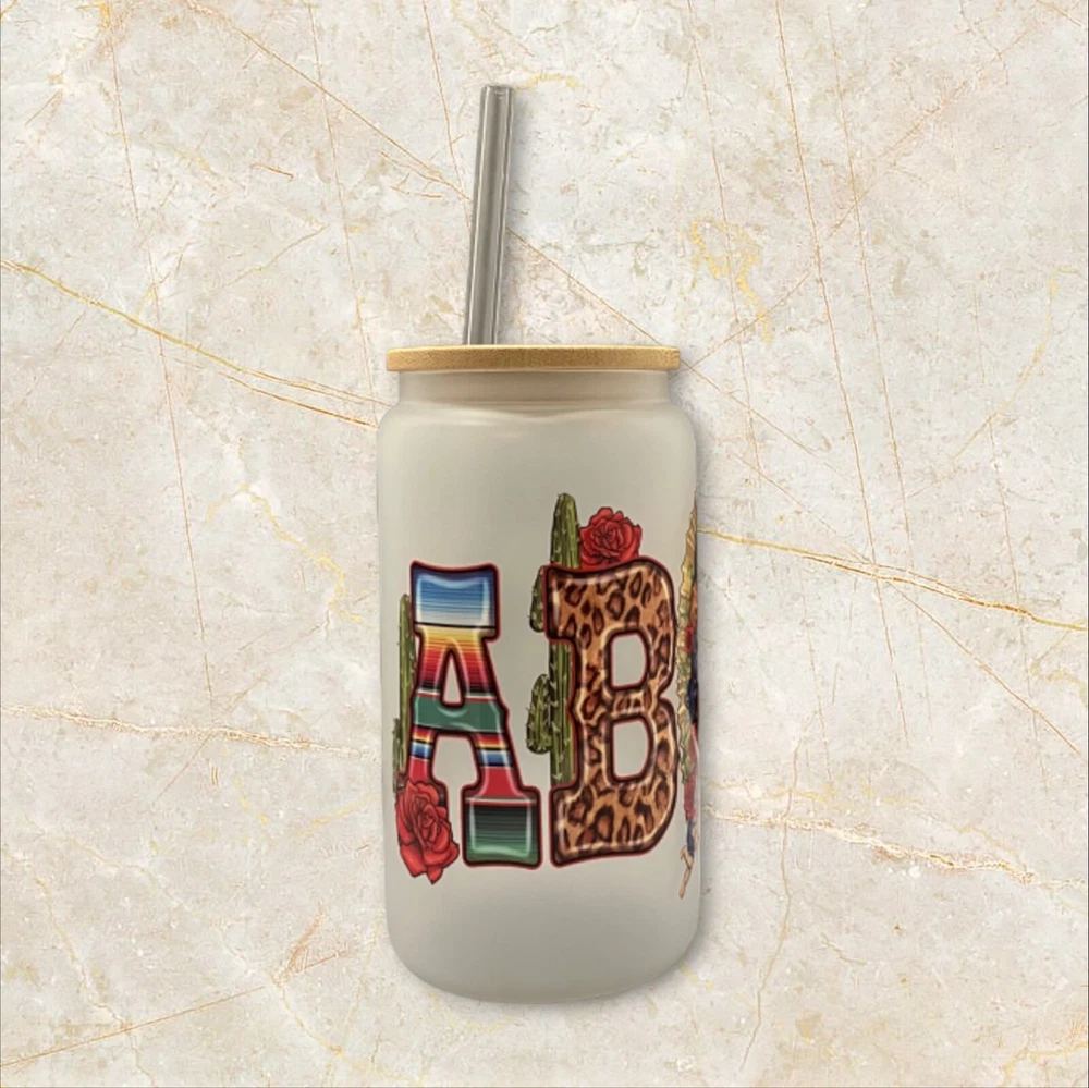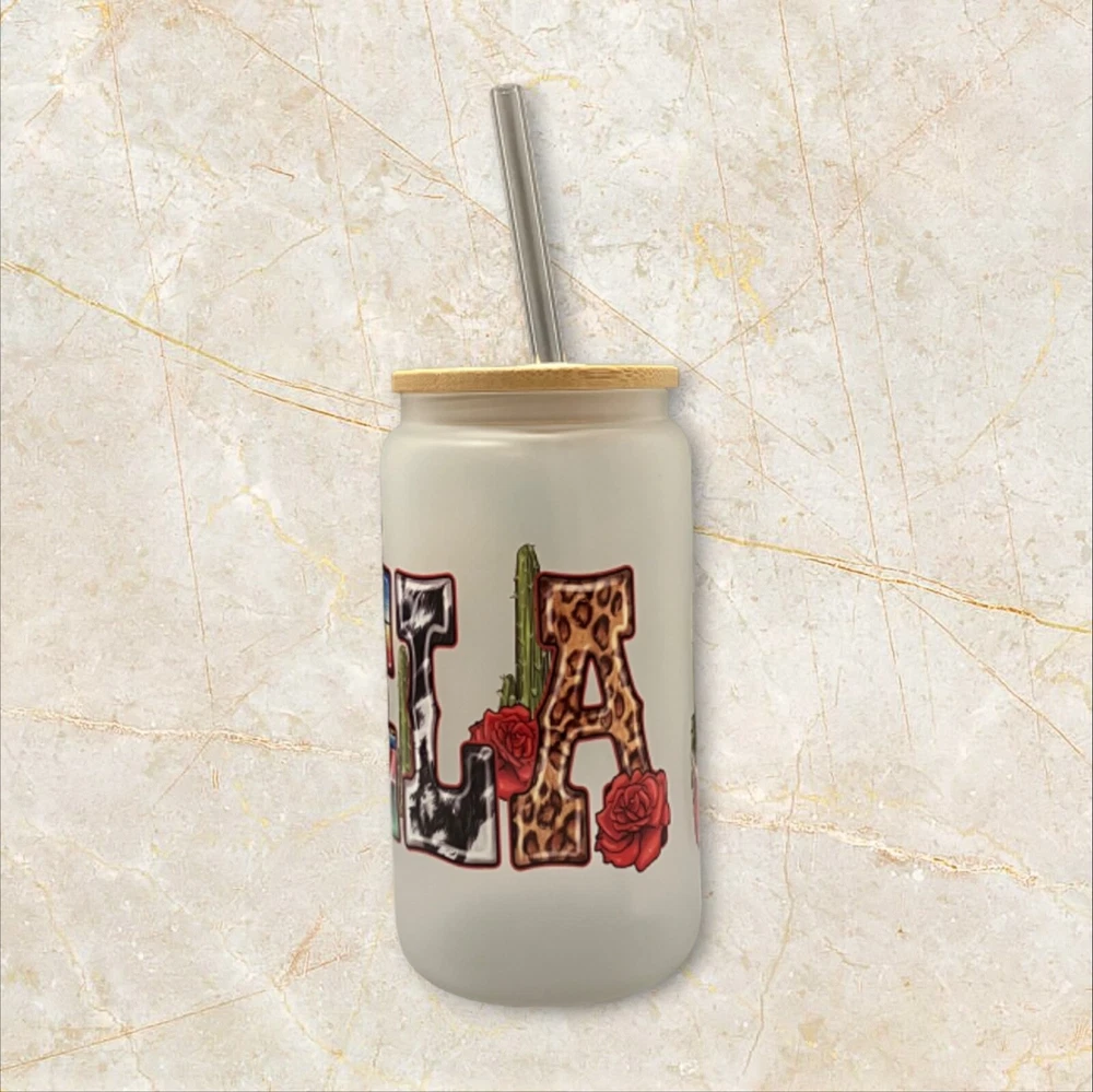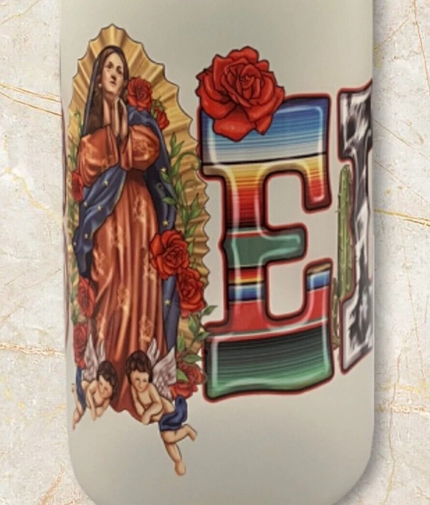 Enjoy your favorite drinks with this 16 oz Abuela glass can. The can-shaped glass is decorated with a UV DTF wrap featuring the Virgin Mary and comes with a bamboo lid and reusable straw. Perfect for all occasions, this modern-style glass can is ideal for teens, boys, girls, and adults. Hand wash only and care instructions are included. The set includes a lid, glass can, and straw. This Libbey-style glass can is straight in shape, with a round design, and has a capacity of 16 oz. The glass can is assembled in the USA and is made of high-quality glass material.