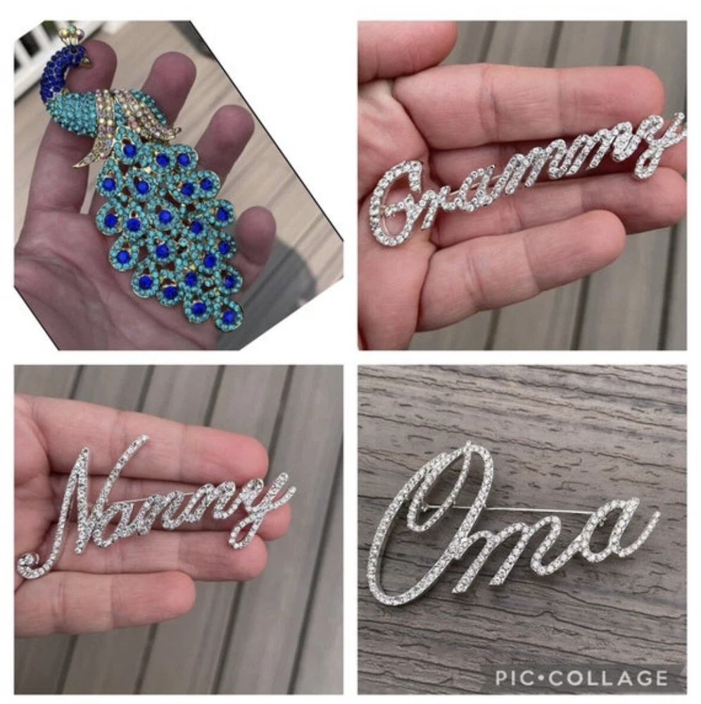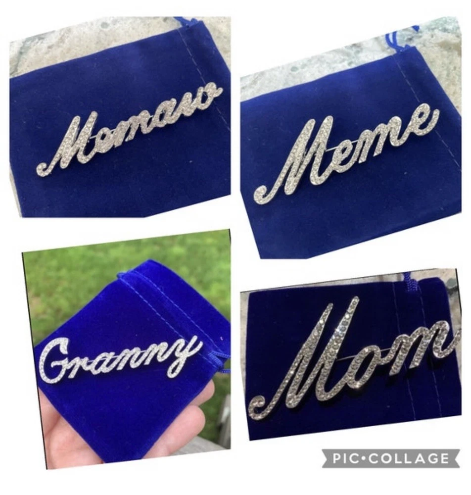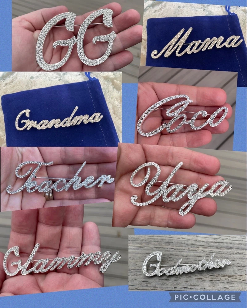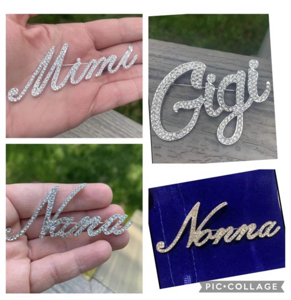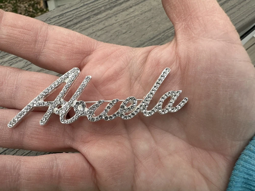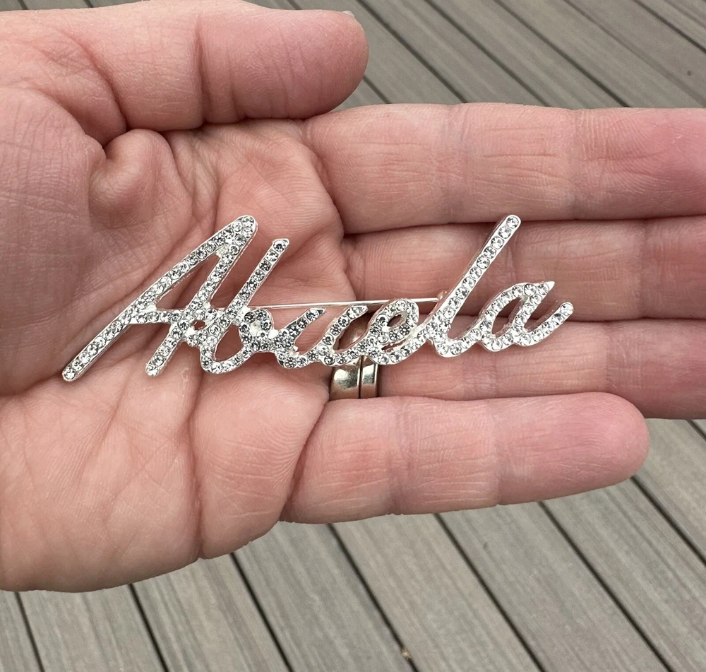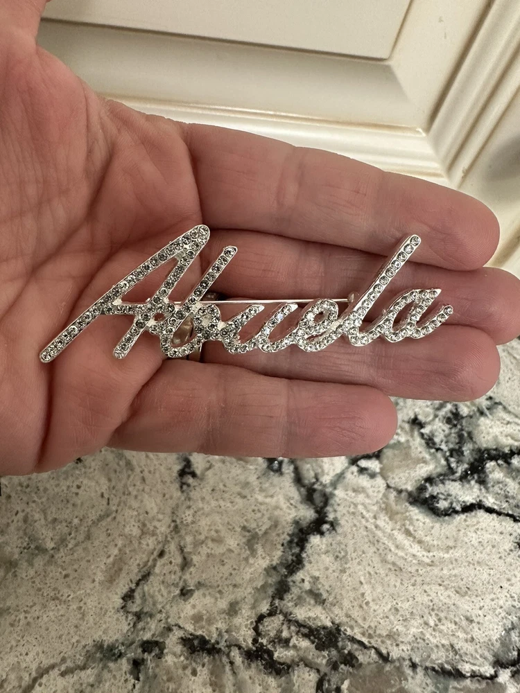 Beautiful custom script Abuela brooch Comes with velvet pouch! New! Spanish Grandmother Makes a great gift! For the Abuela in your life! Mother’s Day, birthday, Christmas gift. Also a cute way to do a baby announcement. I have the following custom names available: Nana, Nonna, Mimi, Kiki, Mama, Mom, Grandma, Granny, Grammy, Lolli, Gigi, Glam-ma, Gaga, Lala, Gram, Oma, Mema, Nonni, Meme, Nanny, Coco, Memaw, Auntie, Lola, Glammy, Grammie, Gammie, Gammy, Gma, Nani, Bella, Honey, Nonnie, YiaYia, Granna, Gramma, NiNi, NeNe, Mia, and Yaya! I add new styles all the time, so if you don’t see the nickname your looking for, message me! I may be adding it soon! In addition to the name brooches, I have a ton of other animals and abstract design brooches. If you want any other styles or more than one, just pay flat shipping.